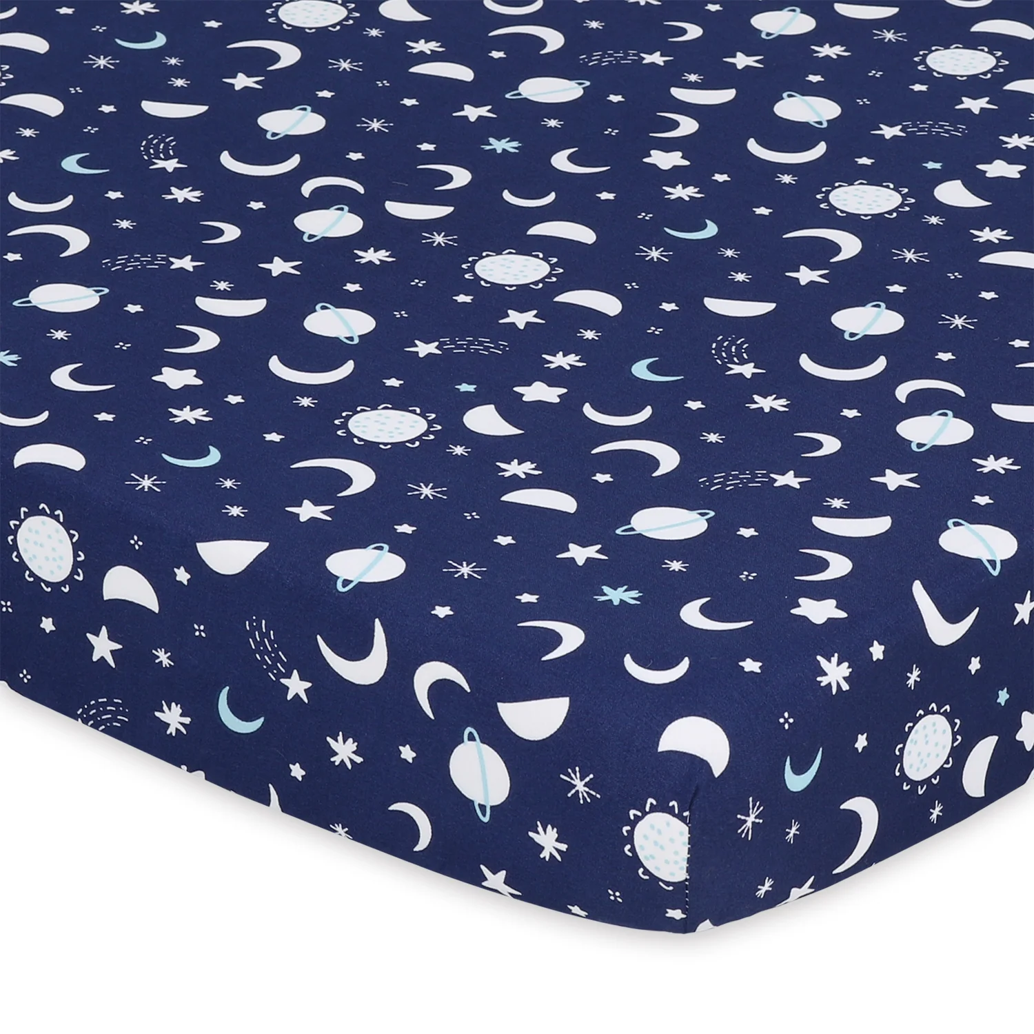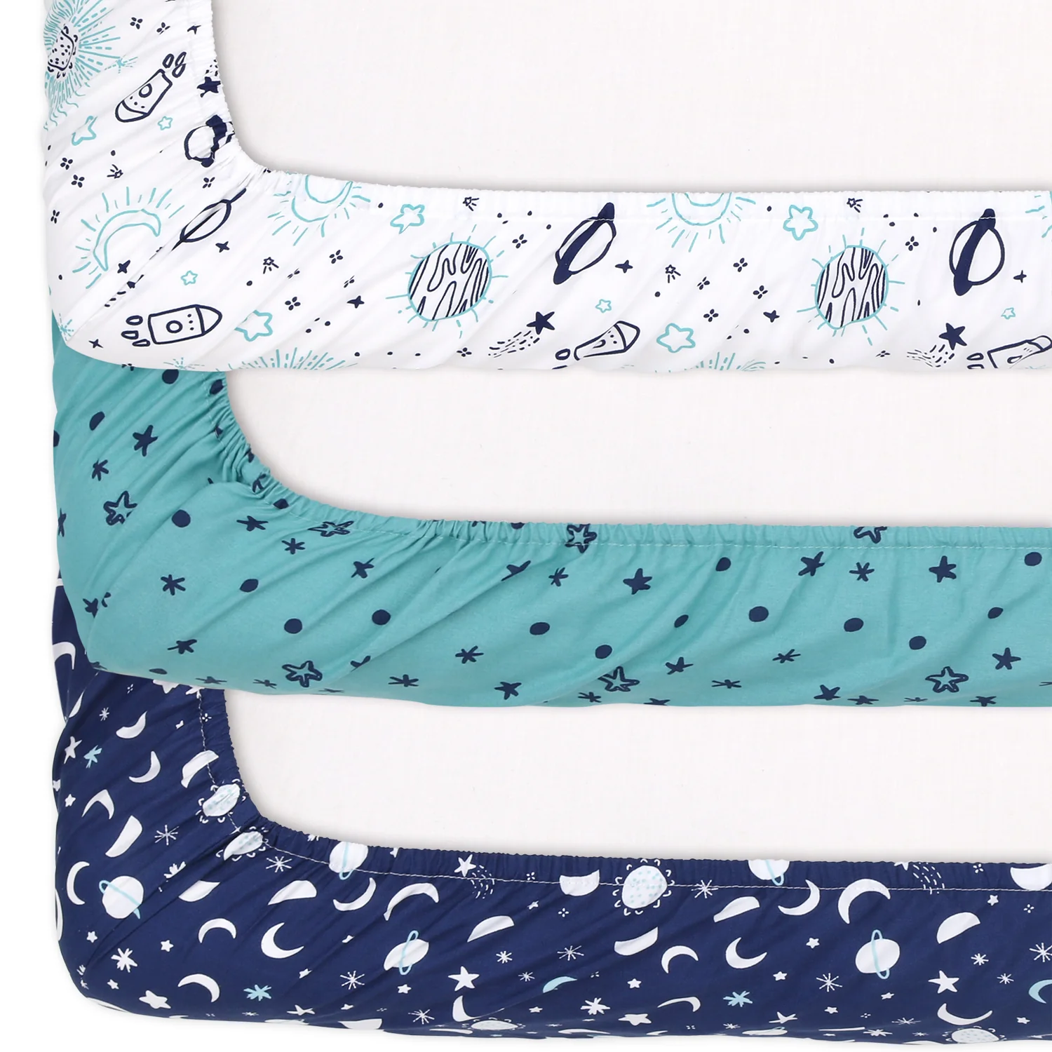 The Space 3-Pack Playard Sheet Set by The Peanutshell features three out-of-this-world stellar designs. The navy blue and teal prints add a touch of cosmic cool to your little one's nursery with adorable stars, planets, and rocket icons. The celestial trio is printed on high quality and breathable fabric that fits most standard playards, cribs and pack-n-plays. Thoughtful details like all-around elastic ensures a snug fit, while fade resistant printing and machine washability makes caring for these a breeze.