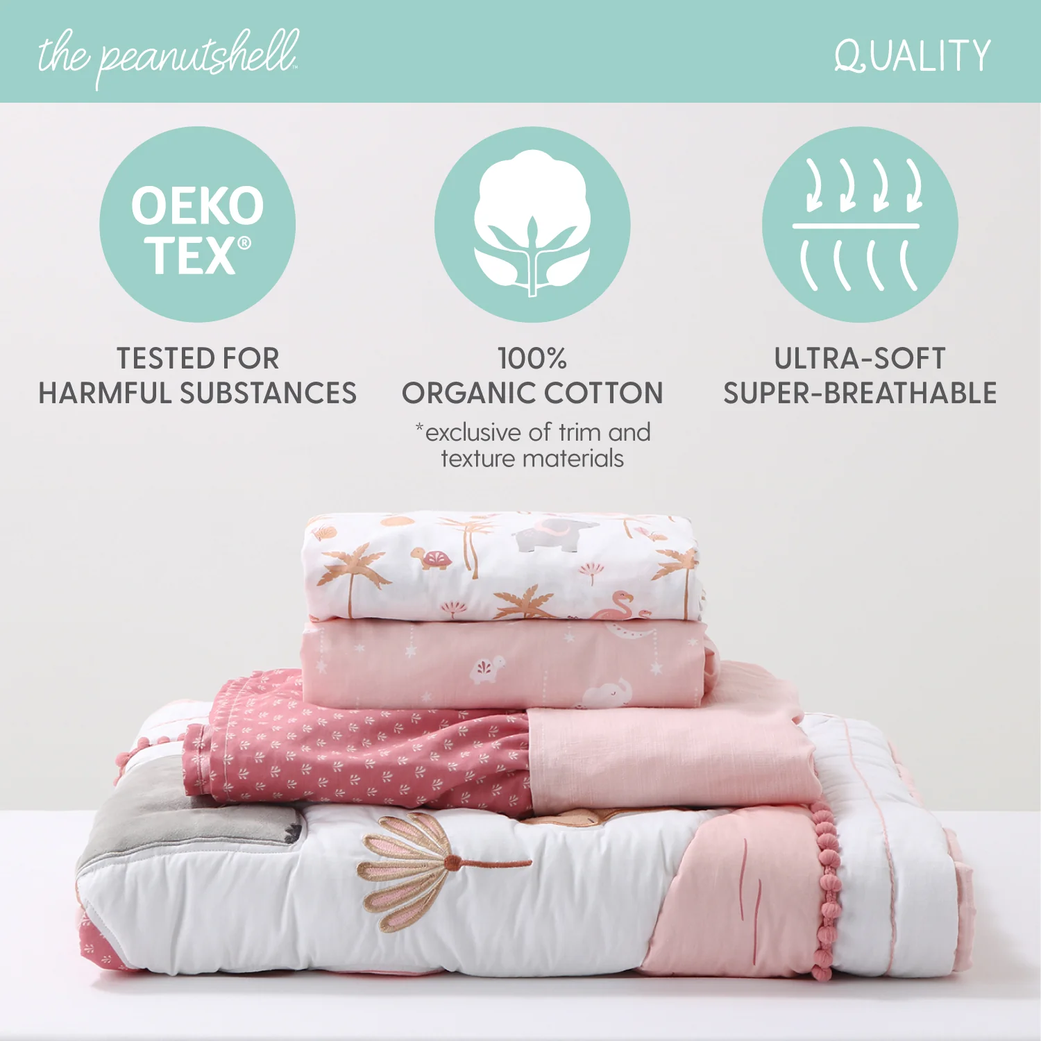 Transform baby's nursery into a Safari Oasis with our 4-piece nursery bedding set from The Peanutshell. This set includes a cozy quilt, two organic cotton fitted sheets, and a crib skirt, all in warm shades of pink, tan and gray. The adorable quilt features an organic cotton base with elephant, flamingo, and turtle plush appliques peacefully enjoying life on the tropical savannah. The tiered ruffled crib skirt beautifully complements the quilt. Two character based fitted sheets are crafted from high-quality 100% organic cotton, ensuring a snug and comfortable fit for your little one with all-around elastic. Wash all pieces on a cold, gentle cycle, then tumble dry at low heat for long-lasting durability.
