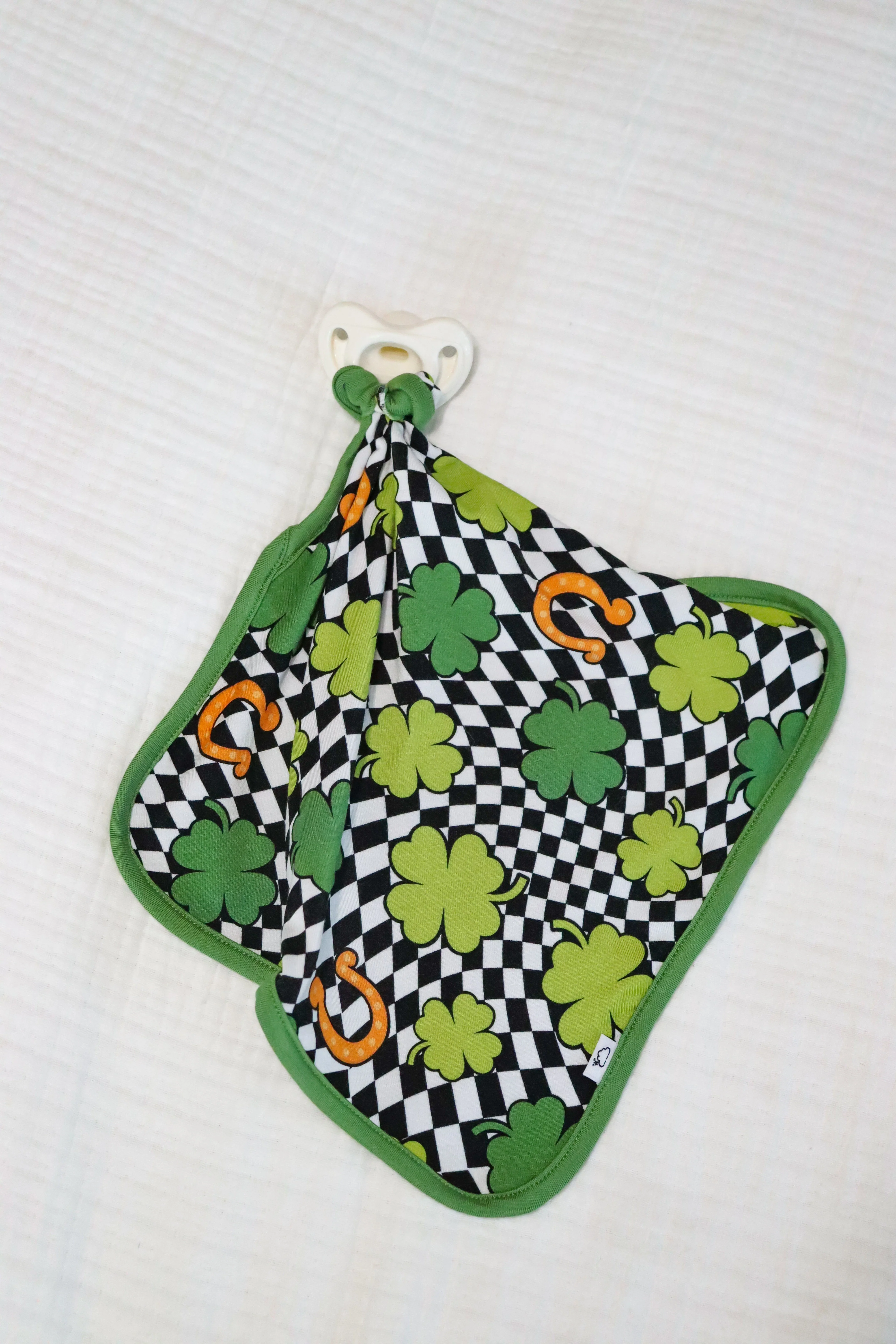 Keep your little one cozy and entertained with our Shamrockin' Checks Dream Lovey. Made from soft, bamboo material, this lovey doubles as a pacifier holder. The shamrock checkered print adds a fun touch for your little leprechaun (or Irish-at-heart!).