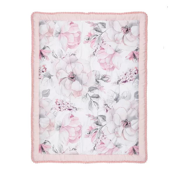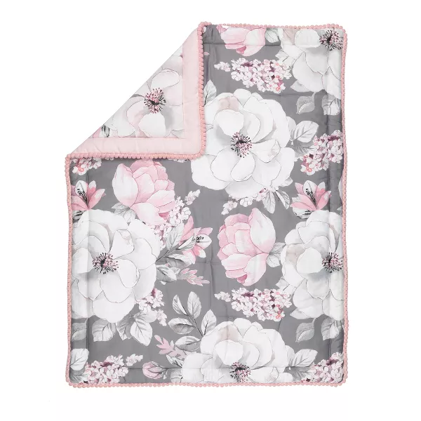 - 40 L x 30 W reversible floral cotton quilt with polyester fill, linen/rayon blend border, and cute pink pom pom trim