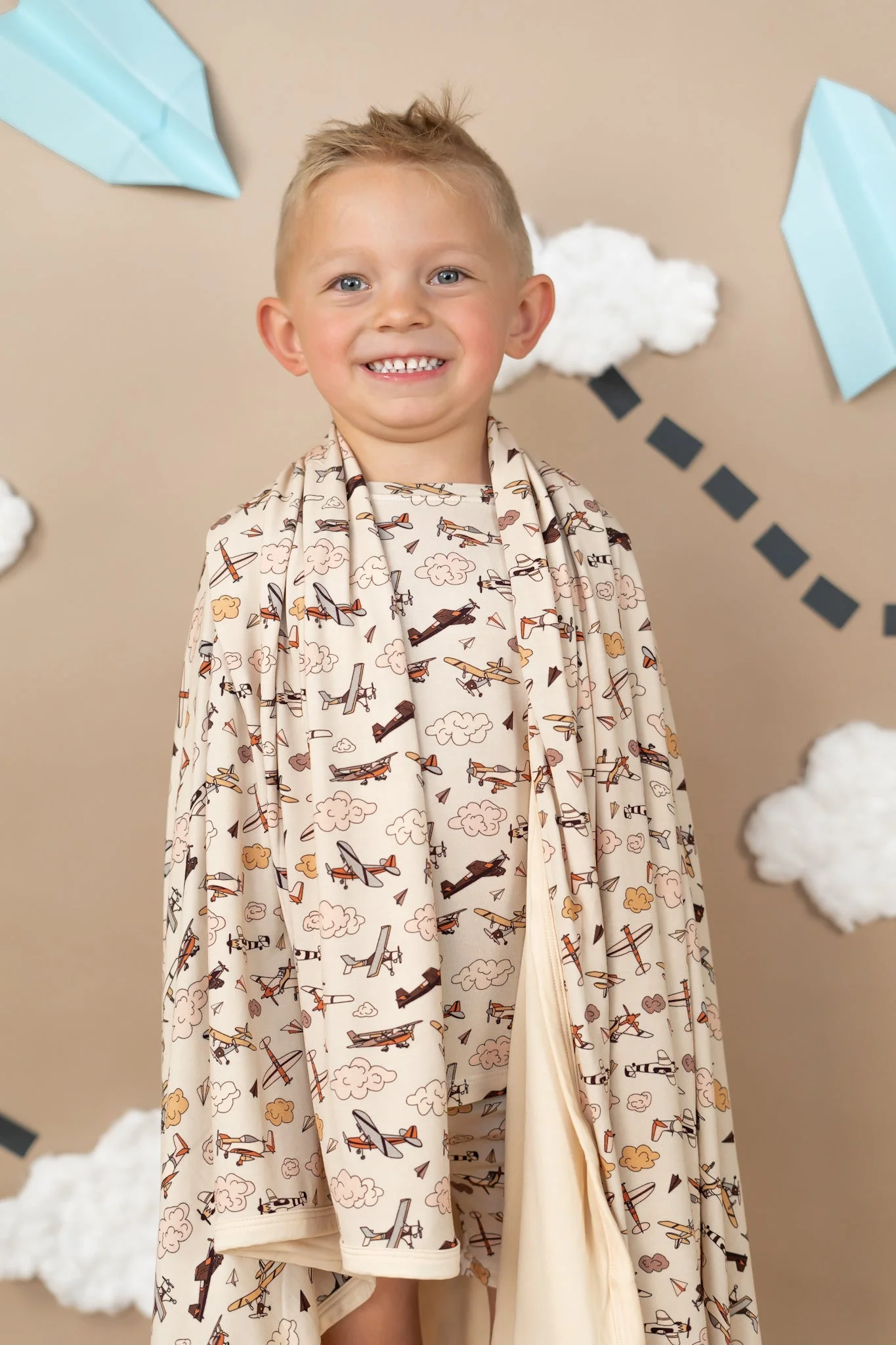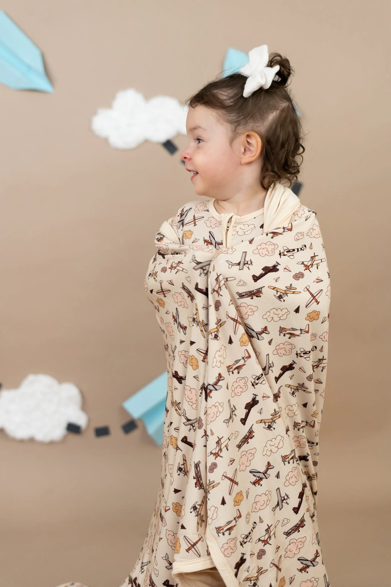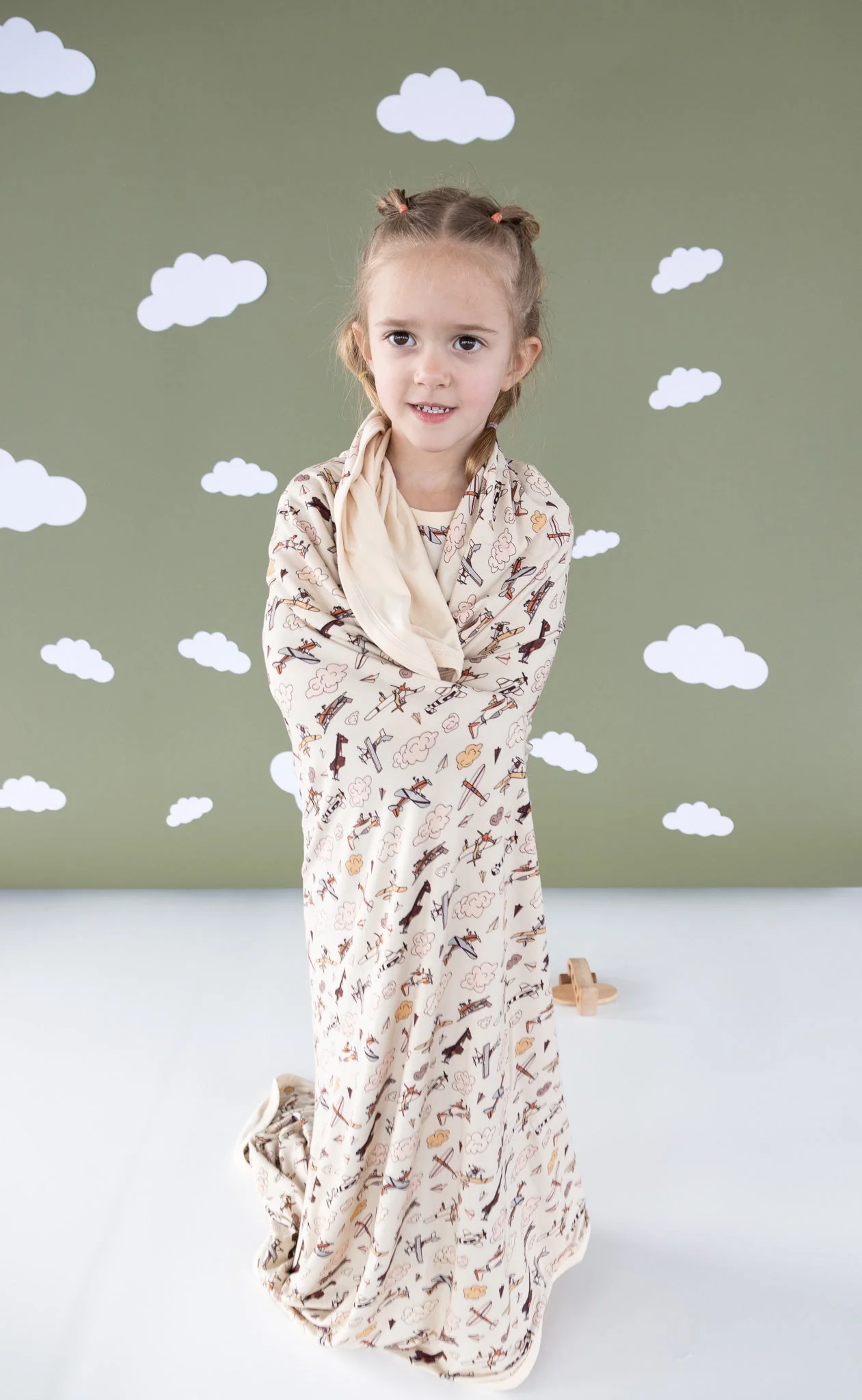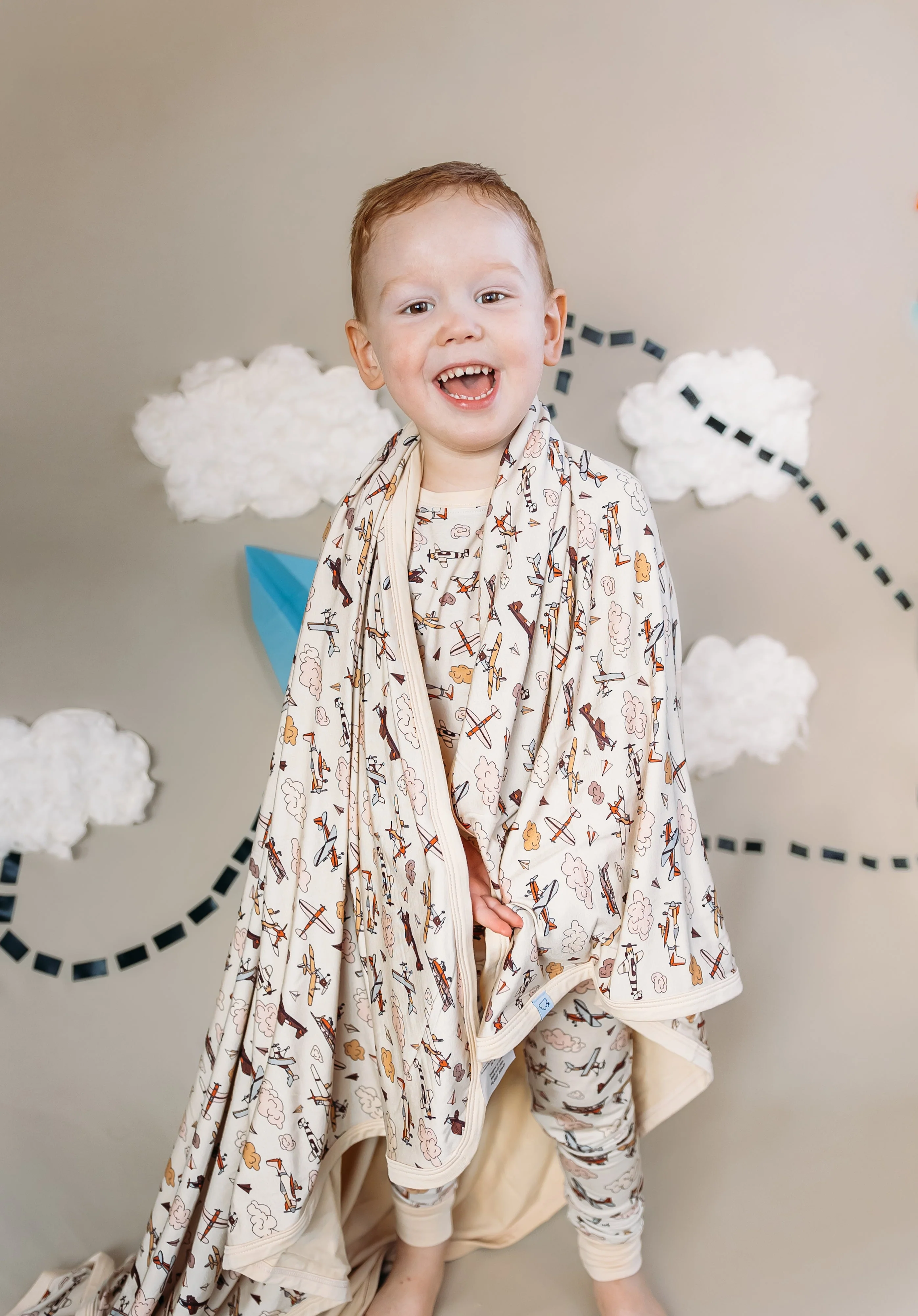 Snuggle up and soar through the night with our So Fly Dream Blanket. Made from bamboo, this soft and comfortable blanket features a playful airplane design to give you fun airplane dreams. Don't miss out on the perfect snuggle buddy!