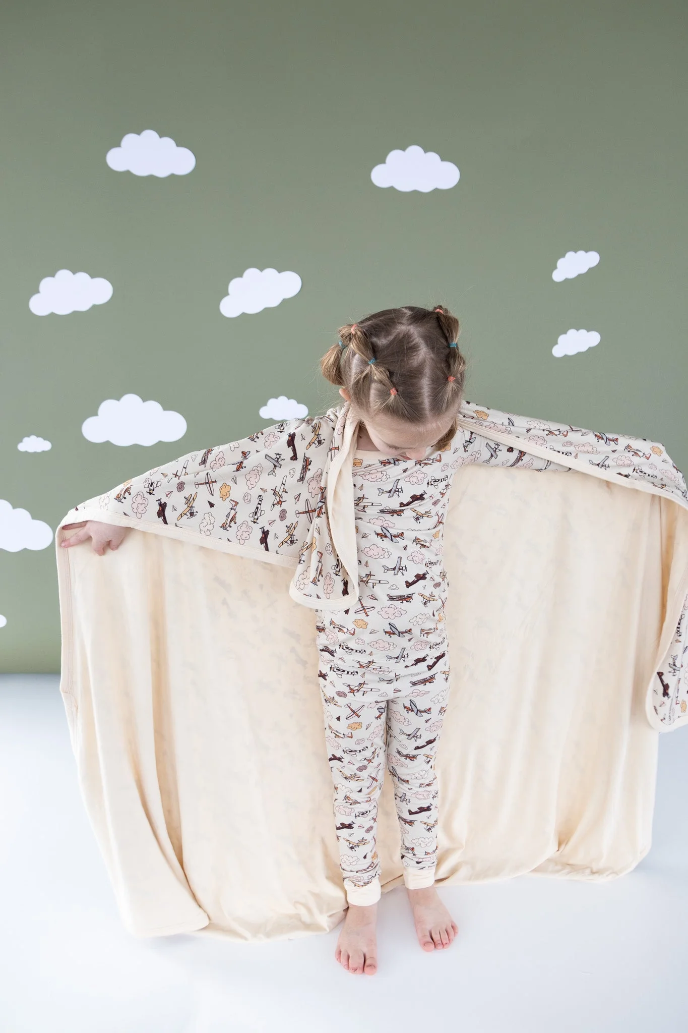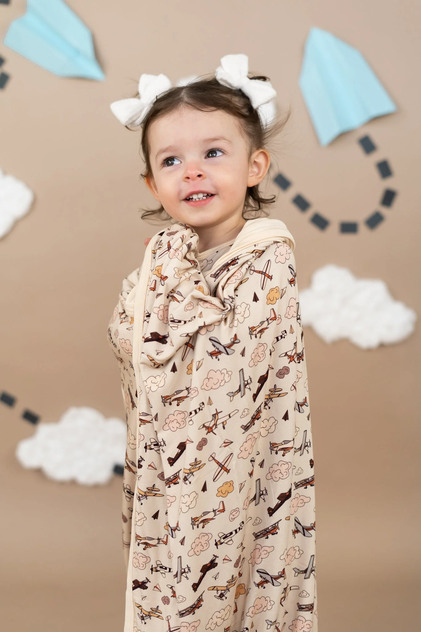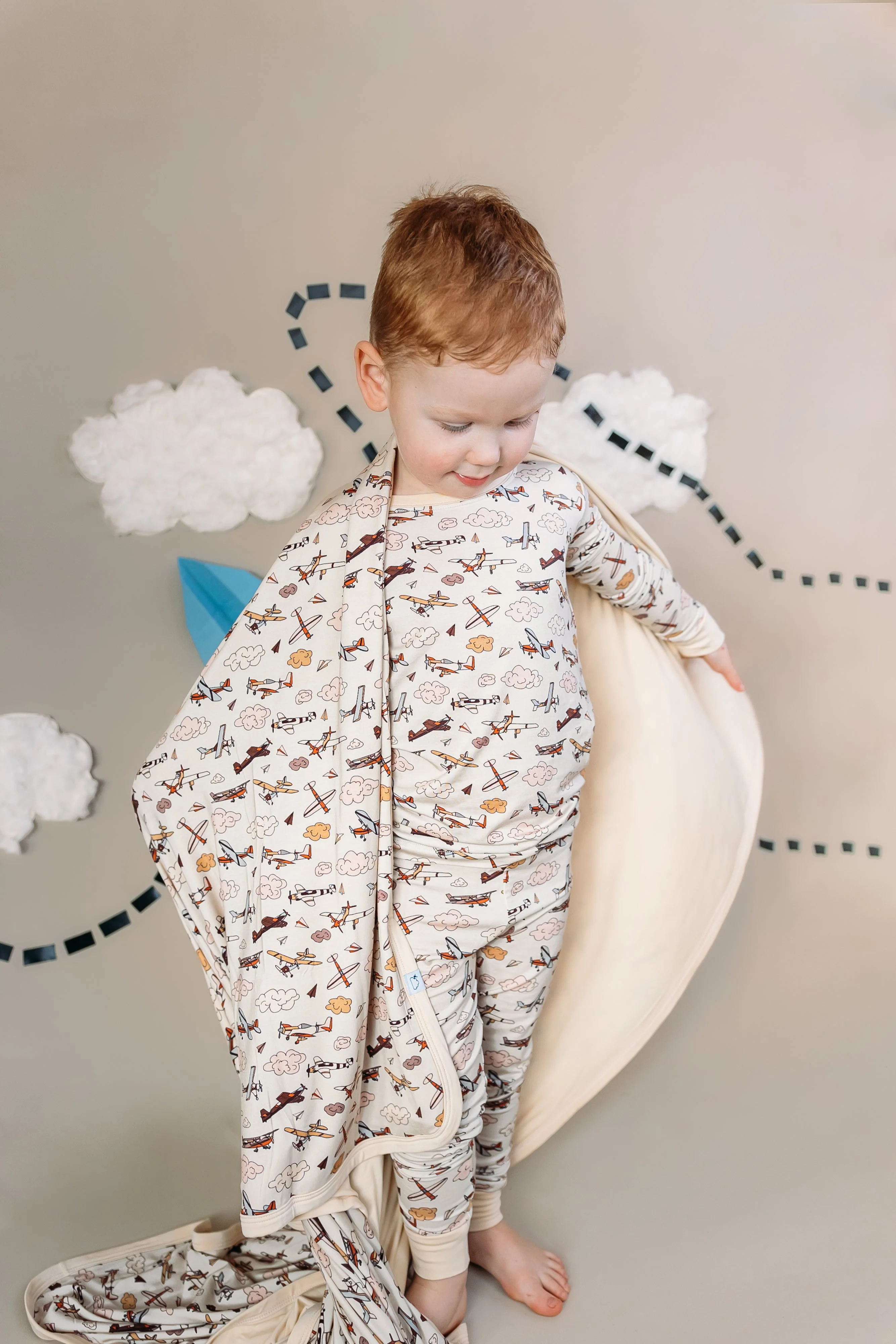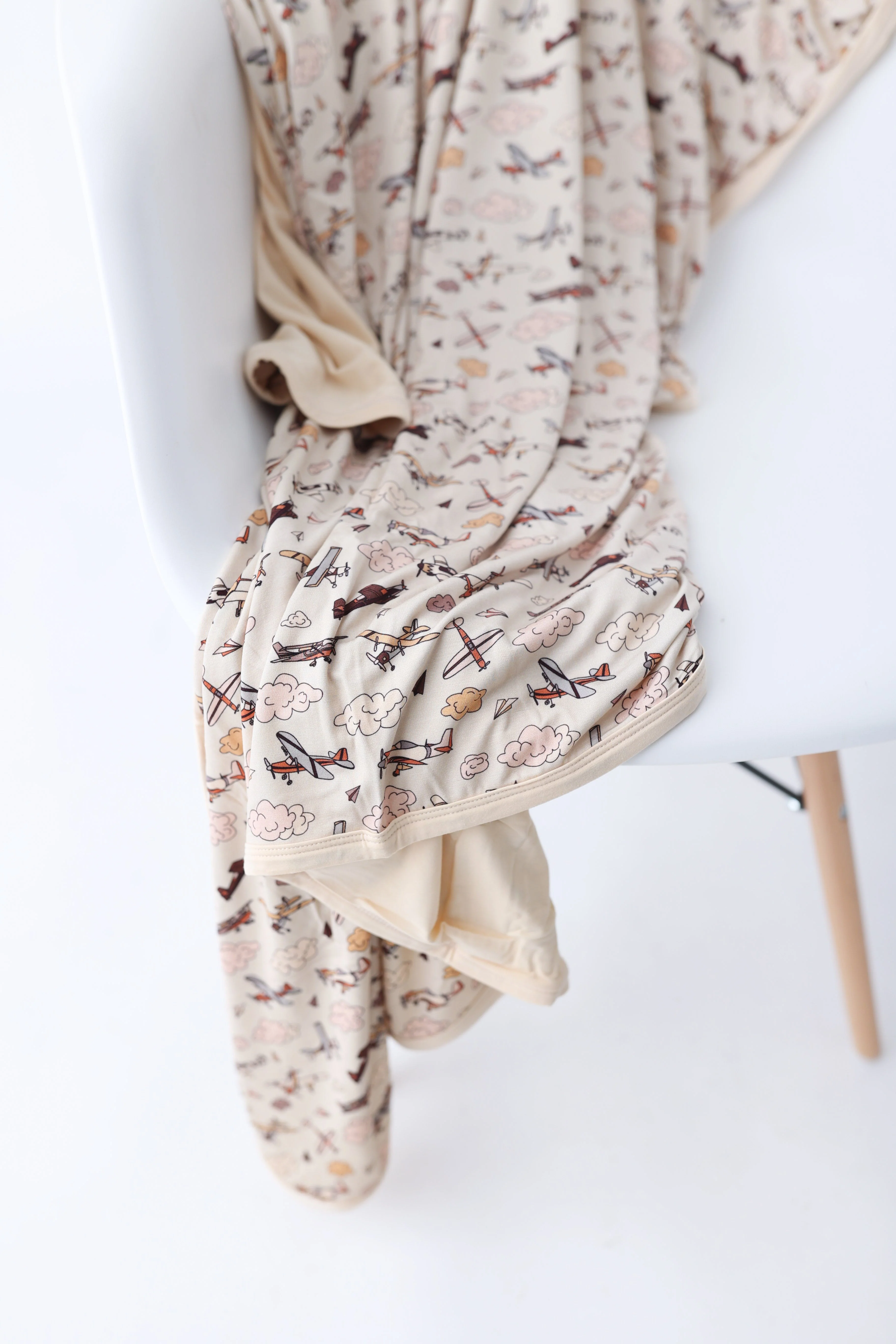 Snuggle up and soar through the night with our So Fly Dream Blanket. Made from bamboo, this soft and comfortable blanket features a playful airplane design to give you fun airplane dreams. Don't miss out on the perfect snuggle buddy!