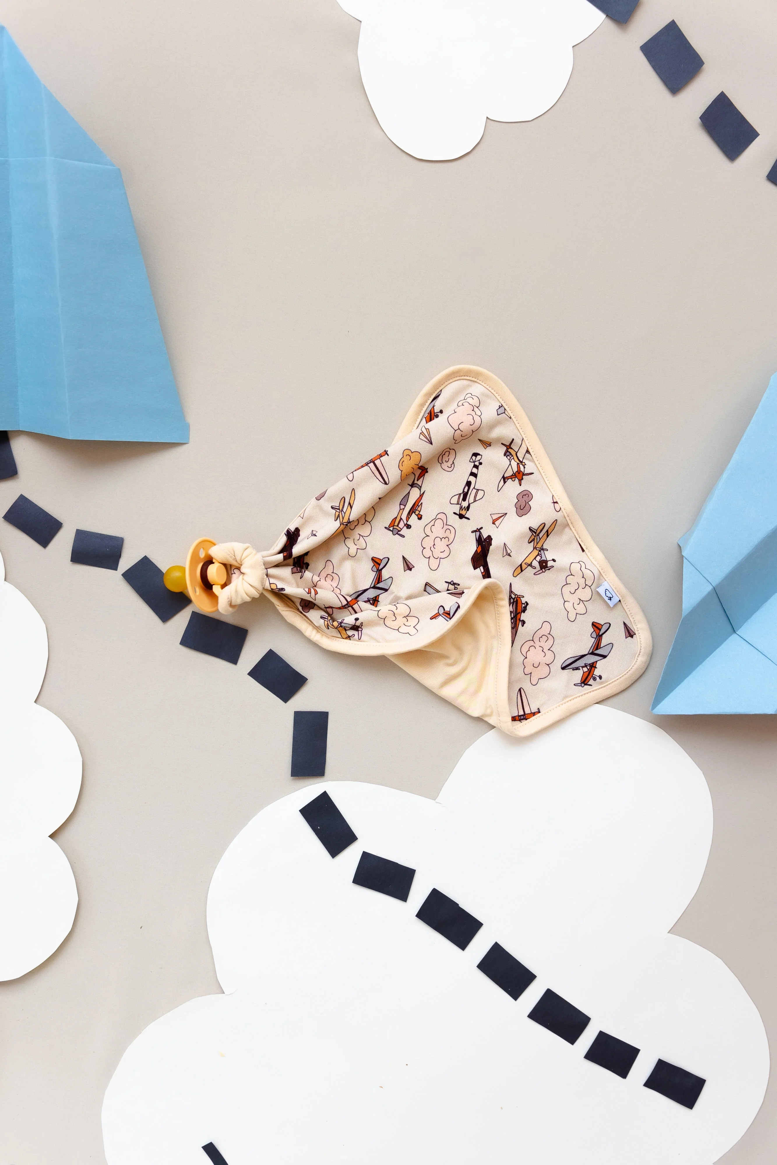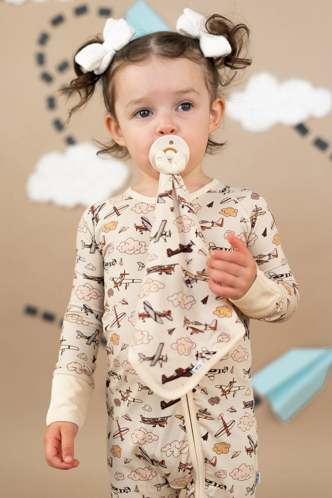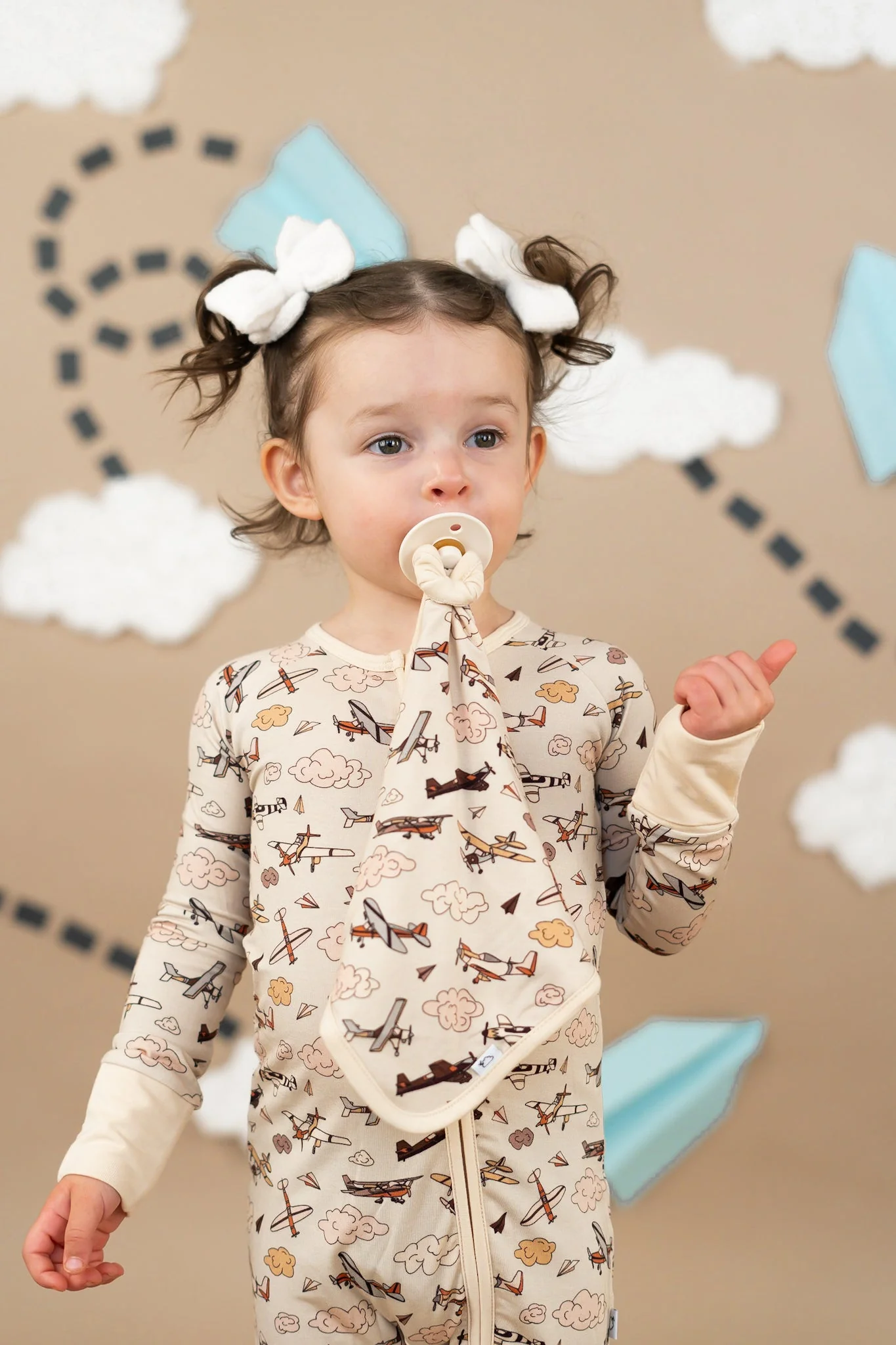 Fly high in style with So Fly Dream Lovey! The airplane design adds a fun touch to this lovey and pacifier holder. Made from soft bamboo material, it's gentle for baby's delicate skin. Say bye-bye to lost pacifiers and hello to a happy baby!