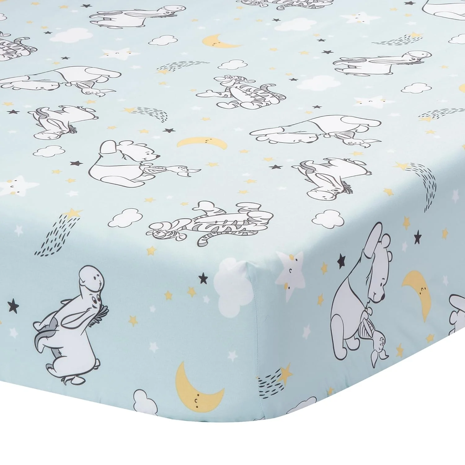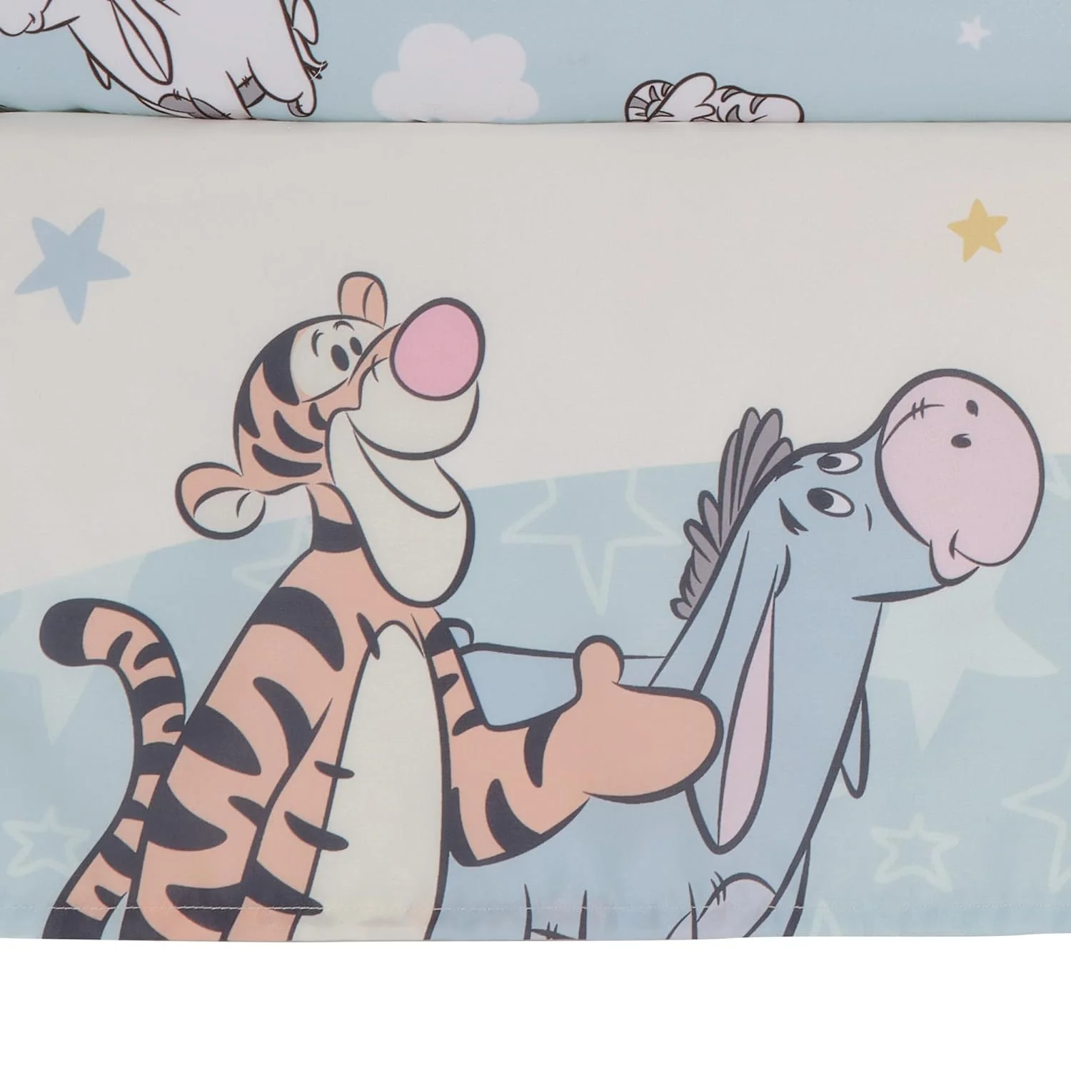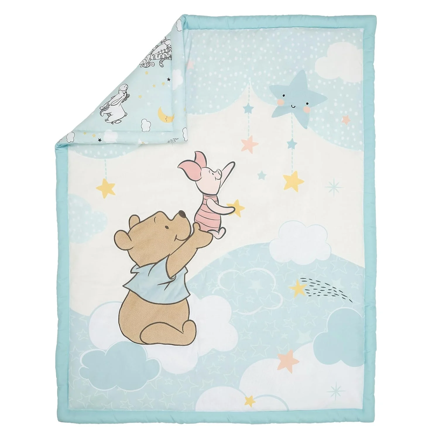 Add a little Disney magic to your child's sleep space with this charming Starlight Pooh Collection. The 3-piece set includes one quilt, one fitted crib sheet, and one crib skirt. It is made of a super soft microfiber material.