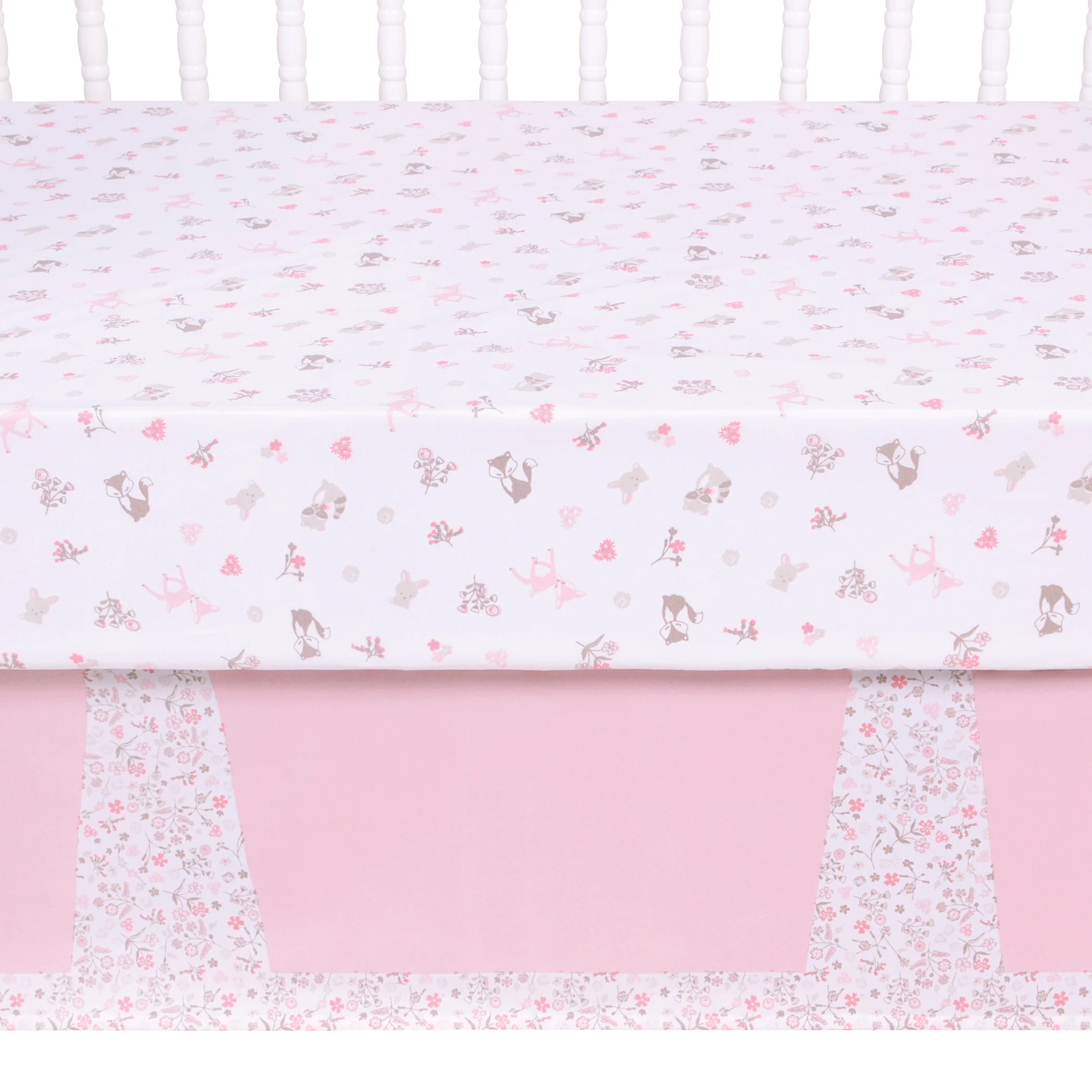 Transform your nursery into a forest full of animal friends with the 4-Piece Sweet Forest Friends Crib Bedding Set from Sammy & Lou. This set will outfit your little one's room with quilt, crib sheet, plush toy, and crib skirt.