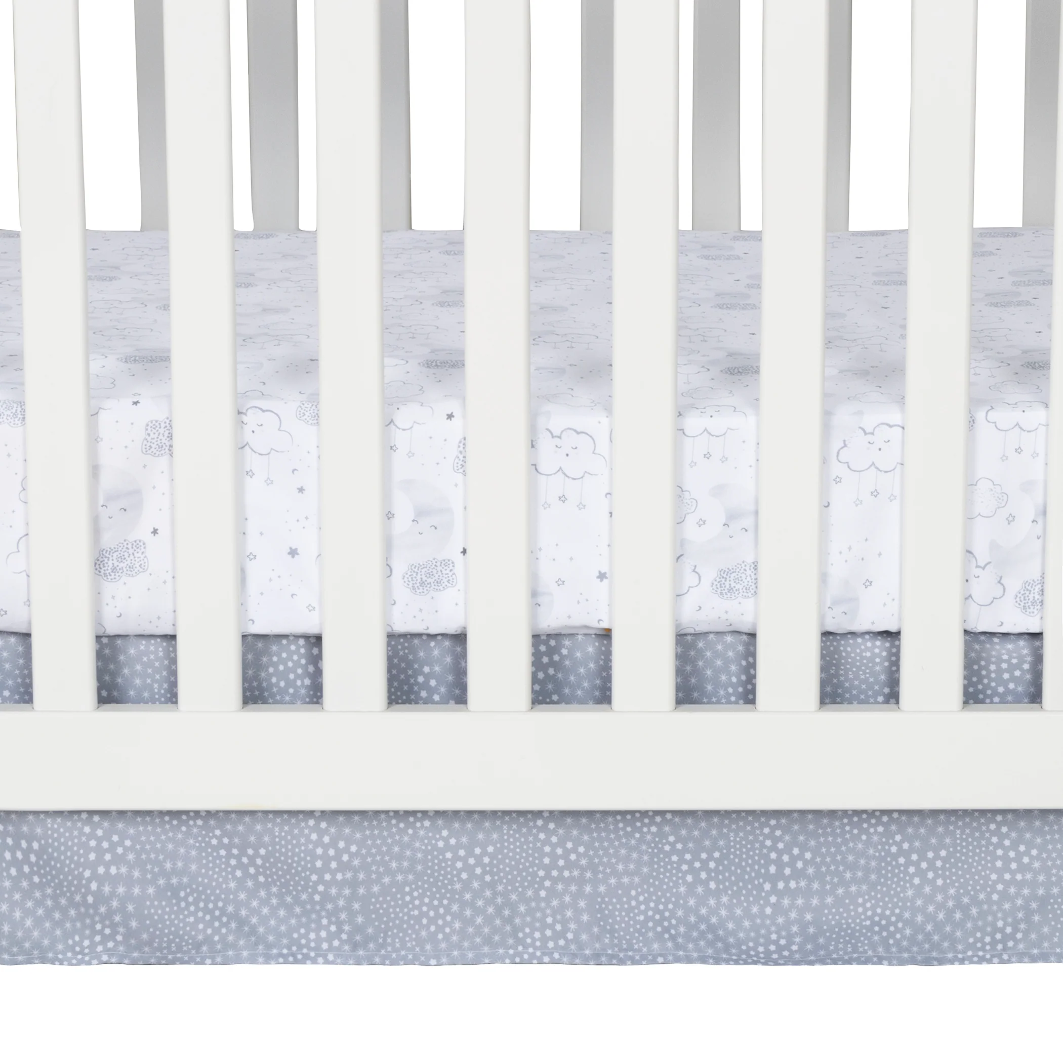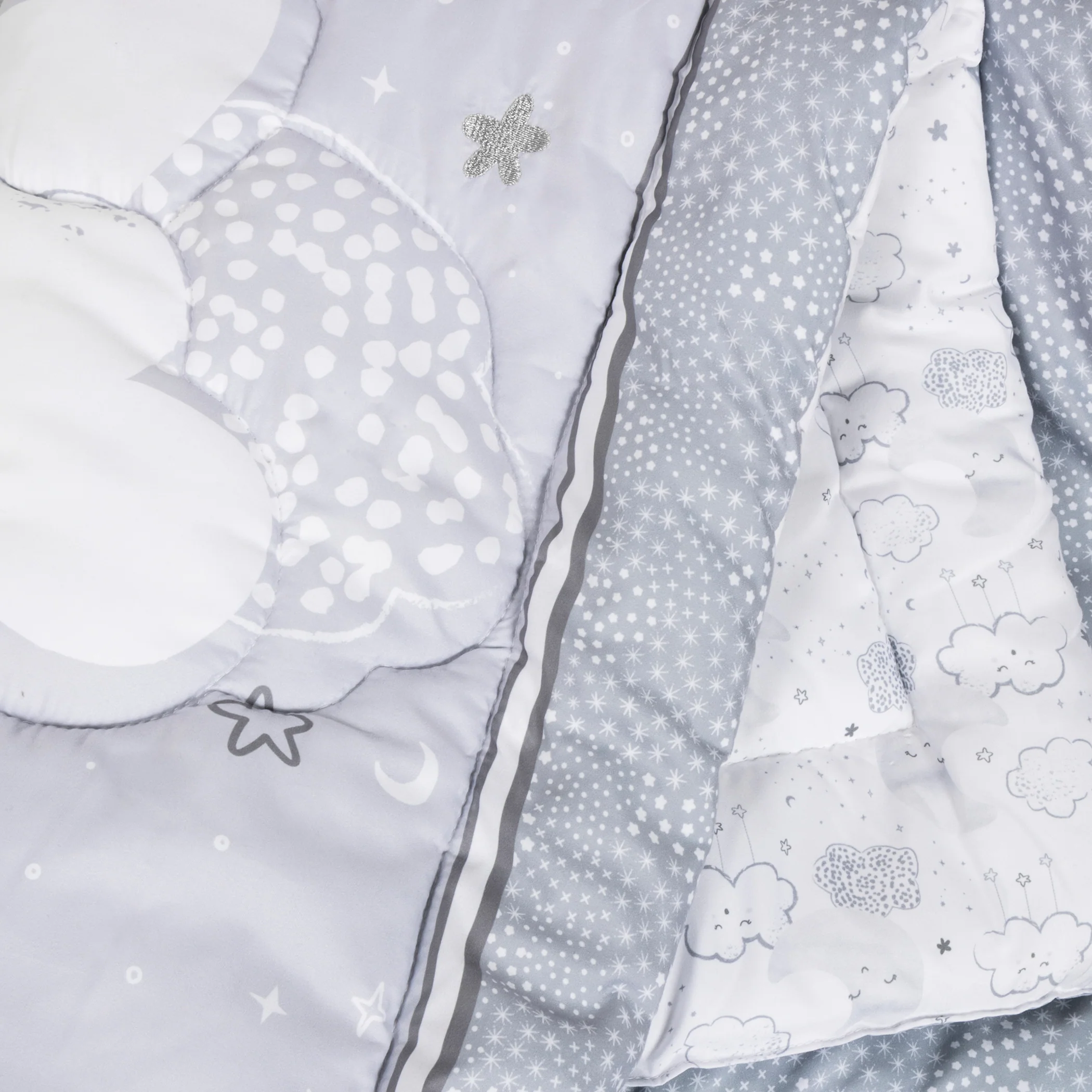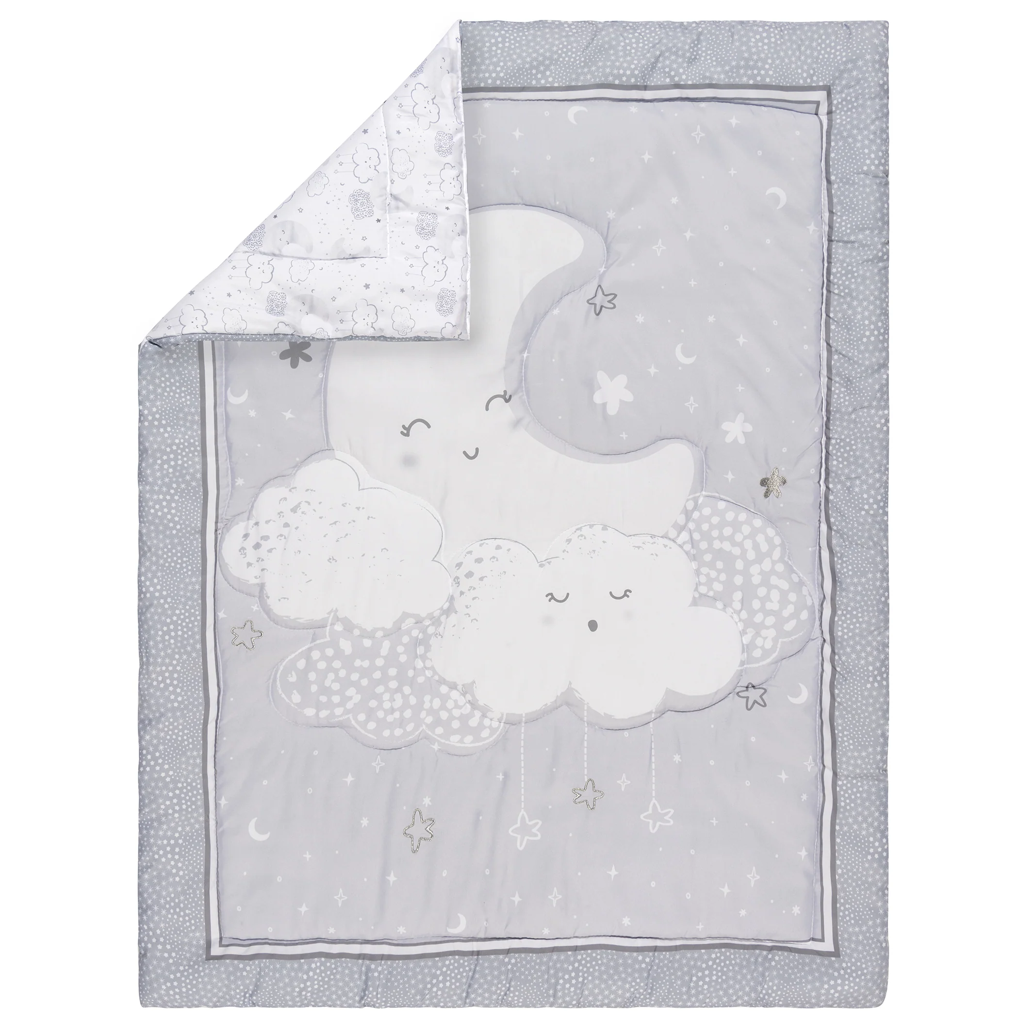 Let your little dreamer drift off to sleep with the Sweet Little Dreamer 4 Piece Bedding Collection from Sammy & Lou. This collection features a calming moon surrounded by clouds and stars. The balance between the soothing gray palette makes this bedding set a perfect pick for any baby boy or girl! The nursery quilt is a great 2-in-1 option and can be used as a blanket or a playmat for tummy time. Coordinating Sweet Little Dreamer 4 Piece Bedding and accessories by Sammy & Lou are sold separately.