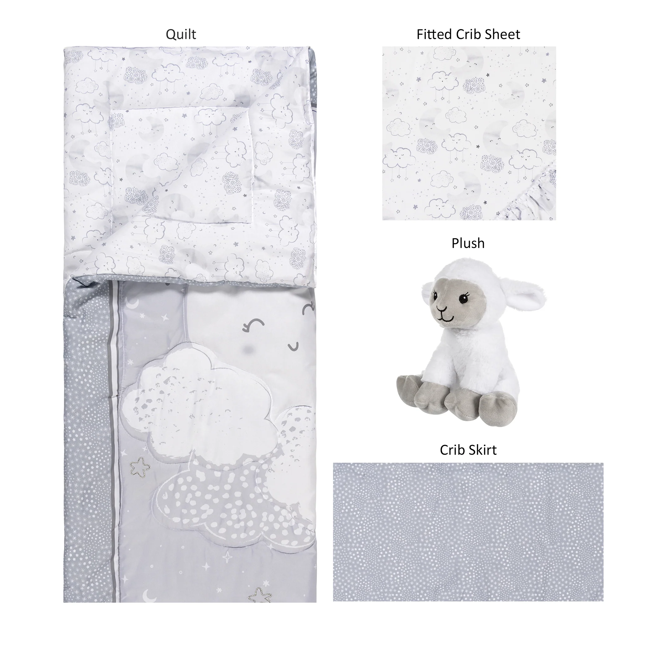- 4 Piece Crib Bedding Set Includes: Nursery Quilt (35 x 45), Fitted Crib Sheet (28 x 52 x 8), Crib Skirt (28 x 52 x 14 Drop), and Plush Toy (9 in)