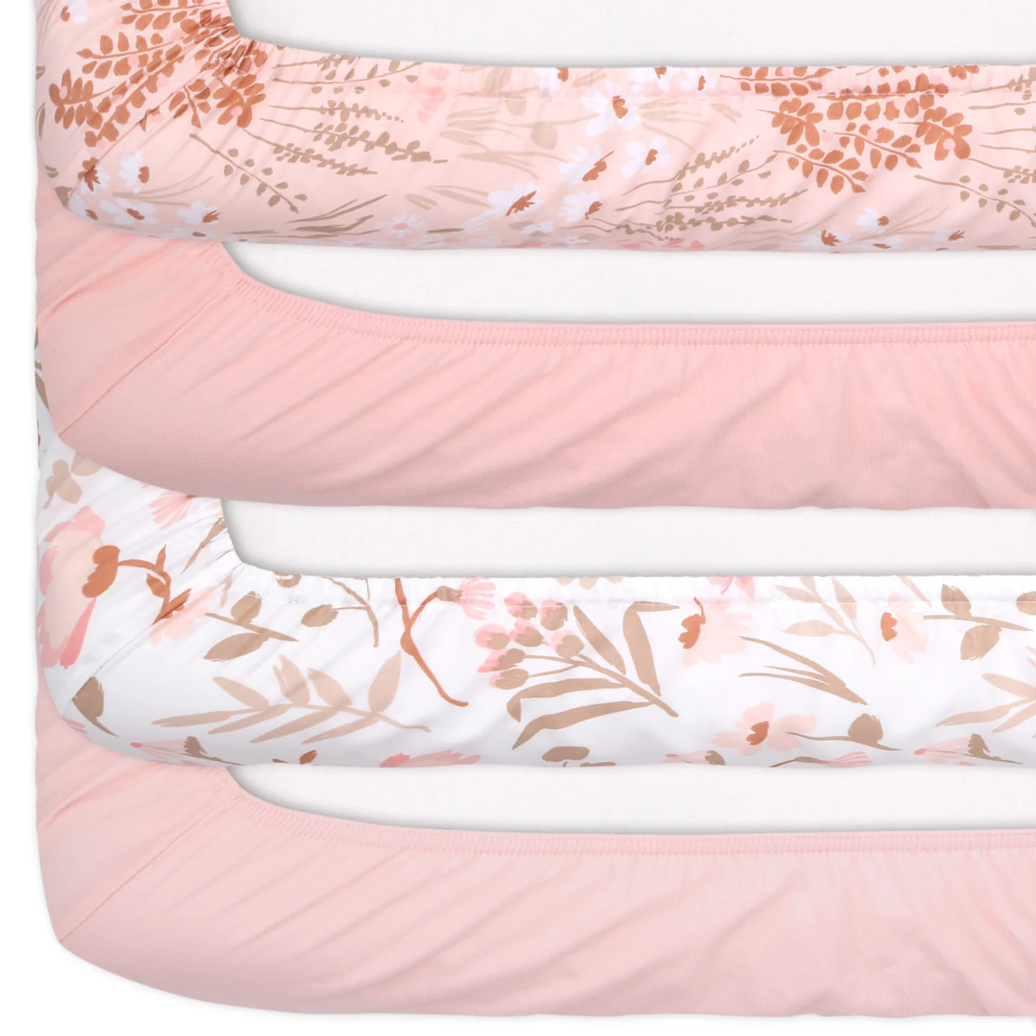 Nurture baby's blossoming dreams with the Whimsical Floral 4-Pack Crib Sheet Set by The Peanutshell. This timeless collection features floral prints in a charming palette of warm pink, beige, and tan, complemented by solid pink options in coordinating hues. Two allover prints and two versatile solids allow for endless style possibilities. Crafted from soft, breathable fabric that's gentle on baby's delicate skin with all-around elastic that ensures a snug fit on most standard crib mattresses. Caring for these sheets is effortless with fade-resistant prints and machine-washability.