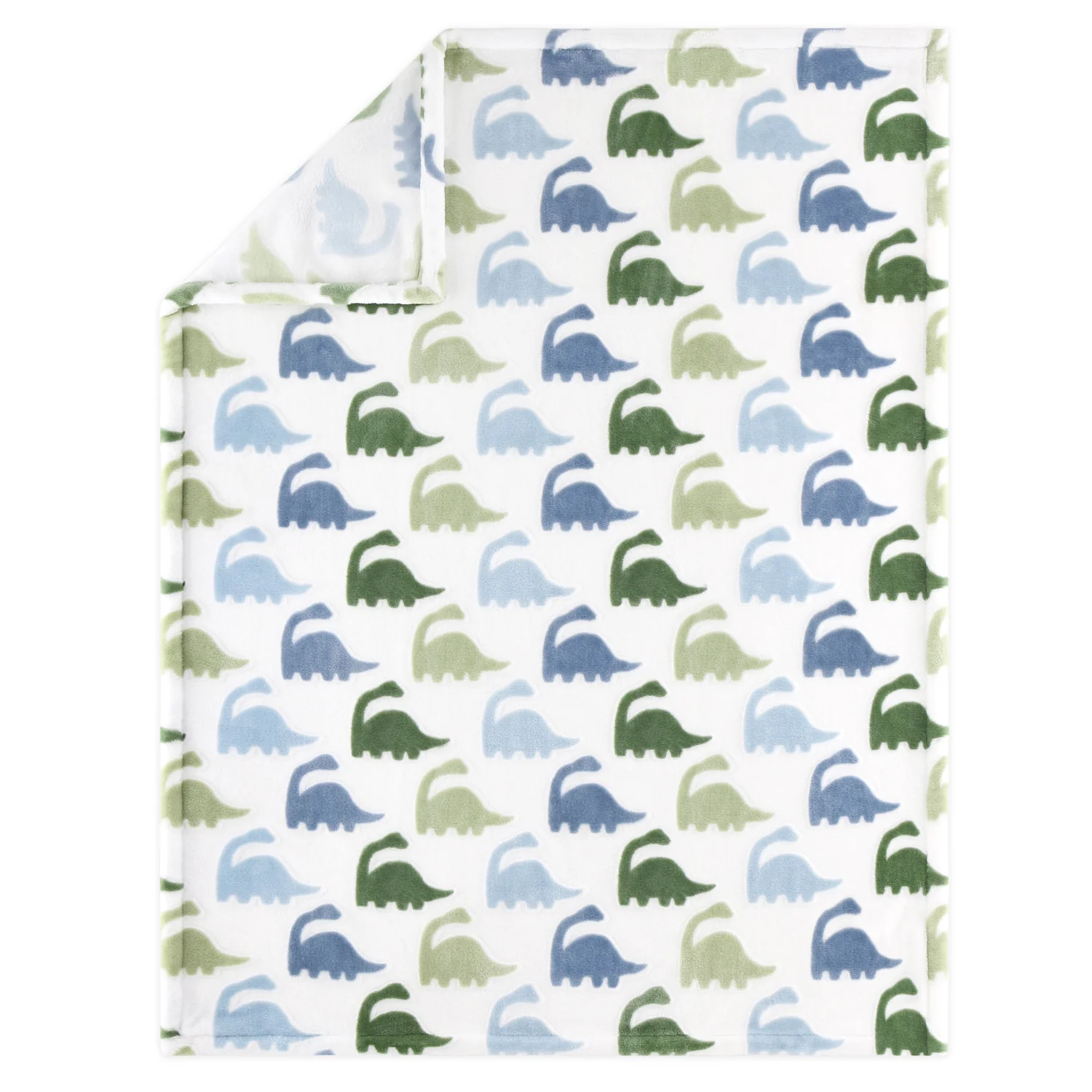 green dinosaur friends with geometric landscape details. The character tossed fitted crib sheet comes in a perfect universal fit, designed for a standard 28” x 52” crib mattress with snug fitting all around elastic. A second fitted sheet print features a linear parade of stegosaurus and triceratops on a light blue background. Our 30” x 40” burnout velour blanket with blue and green dinosaur silhouettes is the perfect accessory for stroller walks or comfy cuddles. The blue dash print bed skirt rounds out this wild look."