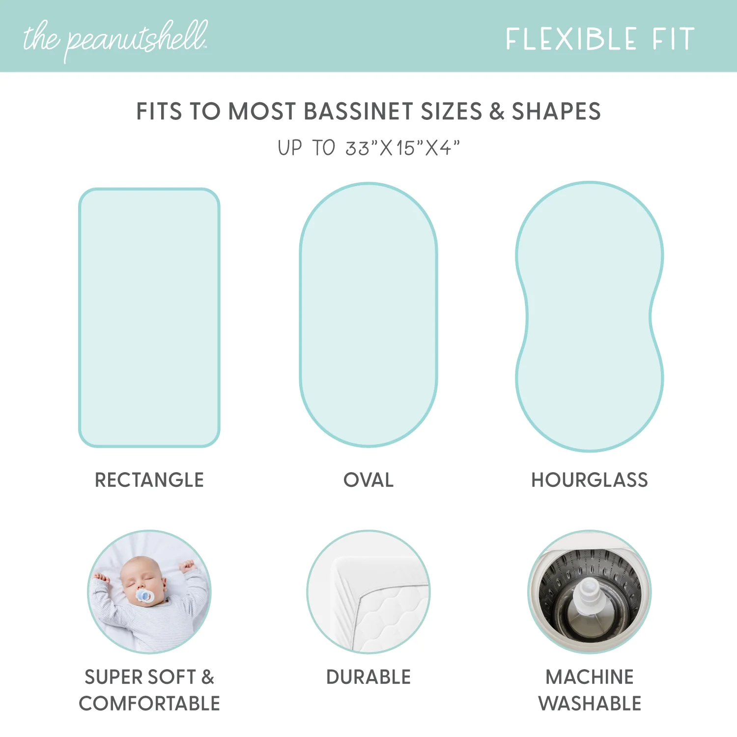 - This set includes four fitted sheets designed to fit most bassinets up to 33"" x 15""x 4"". All-around elastic ensures a safe and snug fit.