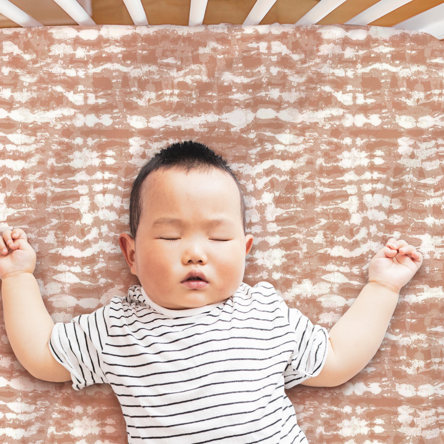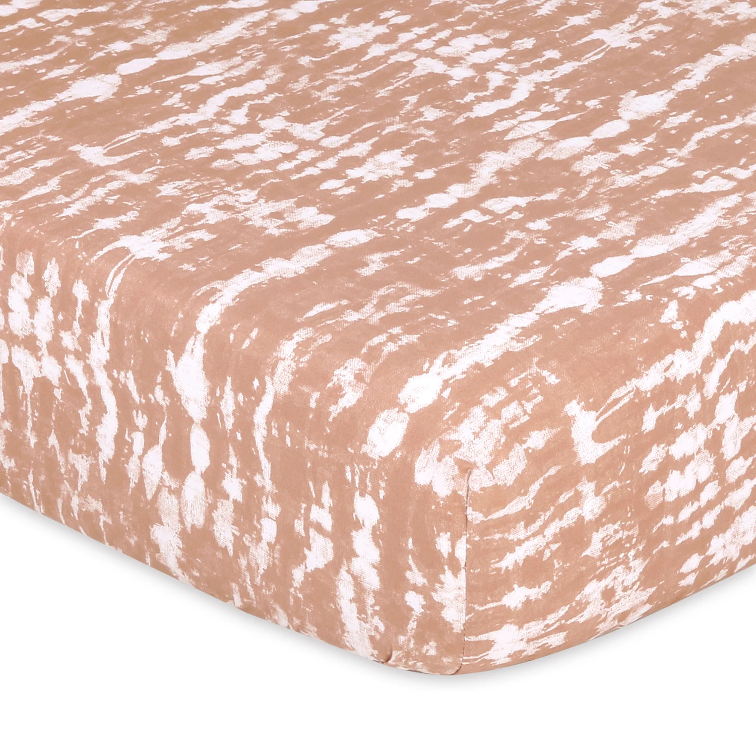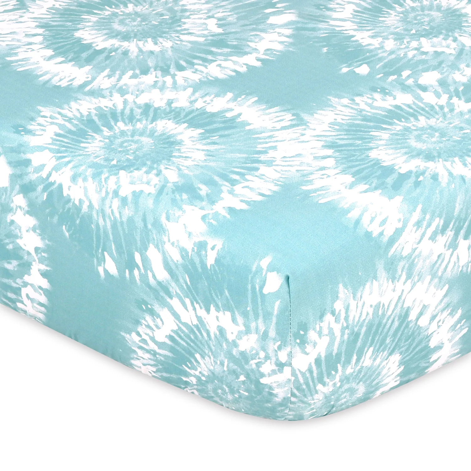 The Boho Tie Dye 4-Pack Fitted Crib Sheet Set by The Peanutshell features a soothing assortment of modern designs. Mix and match the blue and brown tie dye prints or sage and white solids to create various bohemian looks for your little one's nursery. Thoughtful details like all-around elastic ensure a snug fit on most standard crib mattresses, while fade resistant printing and machine washability makes caring for these a breeze.