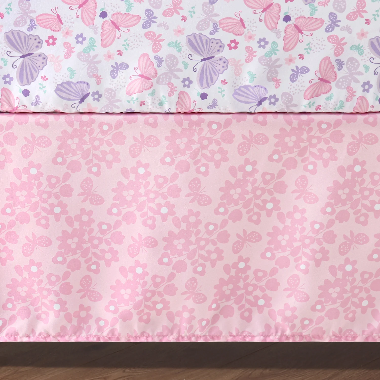 Vibrantly colored and playful butterflies take flight in this 3-piece baby bedding set from The Peanutshell. The multi-functional quilt with pink, purple and aqua center features a large-scale butterfly toss print surrounded by a tonal pink floral border. The crib sheet has the perfect universal fit, designed for a standard 28” x 52” crib mattress with snug fitting all around elastic and is crafted from the same soft and stylish butterfly print. A tonal pink floral bed skirt finishes the colorful collection. Coordinate this set with our floral themed nursery décor, crib mobiles and sheet sets to complete your Butterfly Song baby girl bedroom.