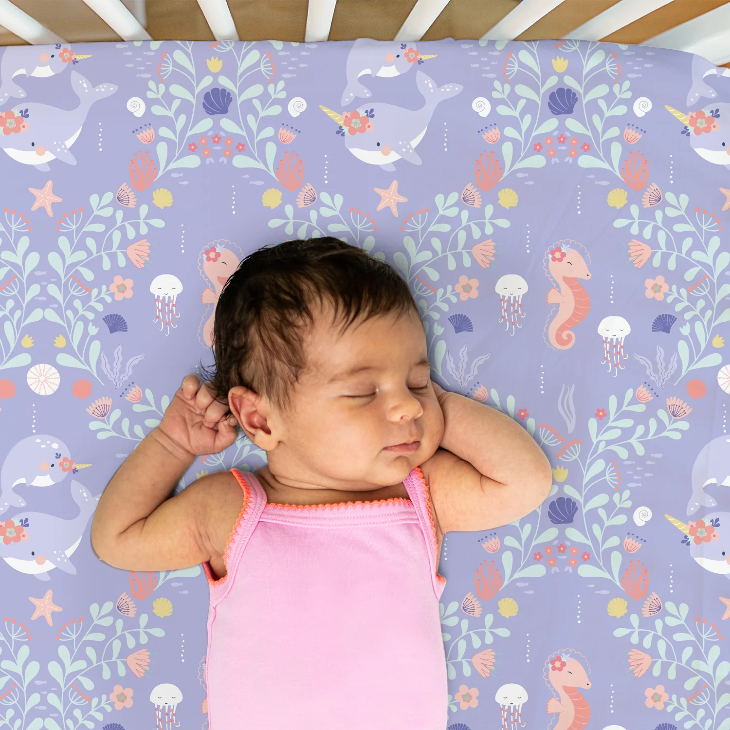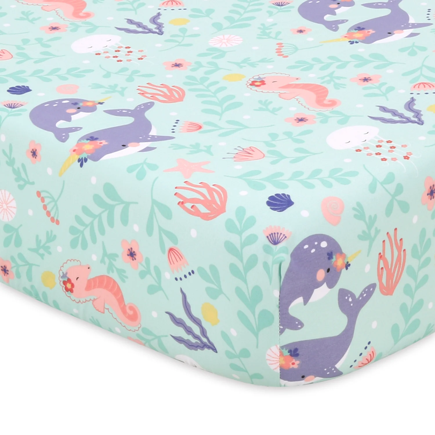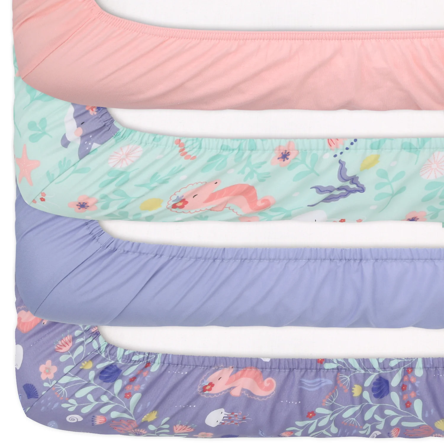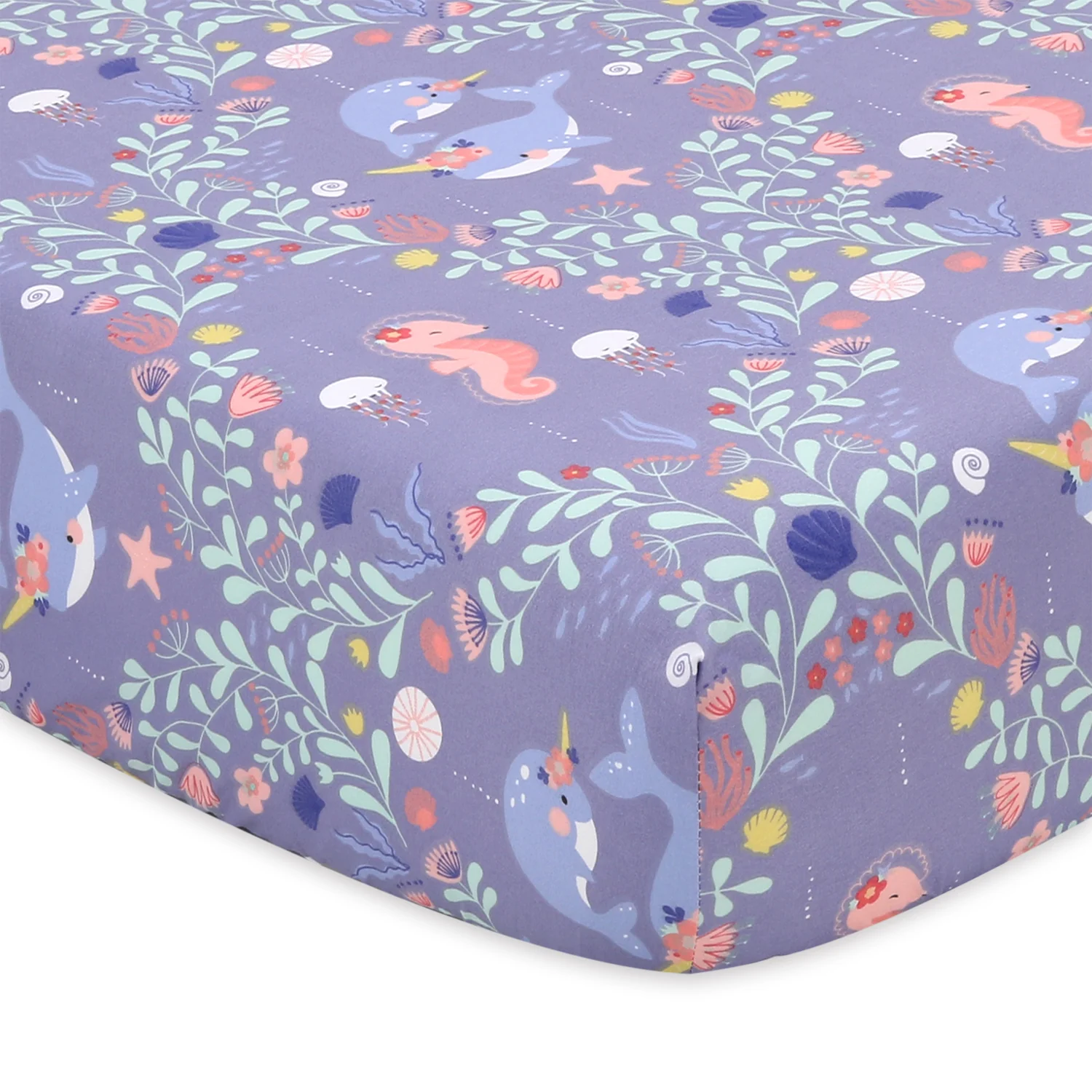 Bring a splash of the sea into your nursery with our 4-pack Ocean Girl Microfiber Sheet Set. This pretty pastel set in lavender, coral, and pale aqua creates a captivating and serene ambience. Dive into enchantment with playful narwhals, graceful jellyfish, and swaying seaweed designs. Carefully curated for baby's comfort and safety, these sheets are crafted from soft and breathable material with durable all-around elastic for a snug fit.