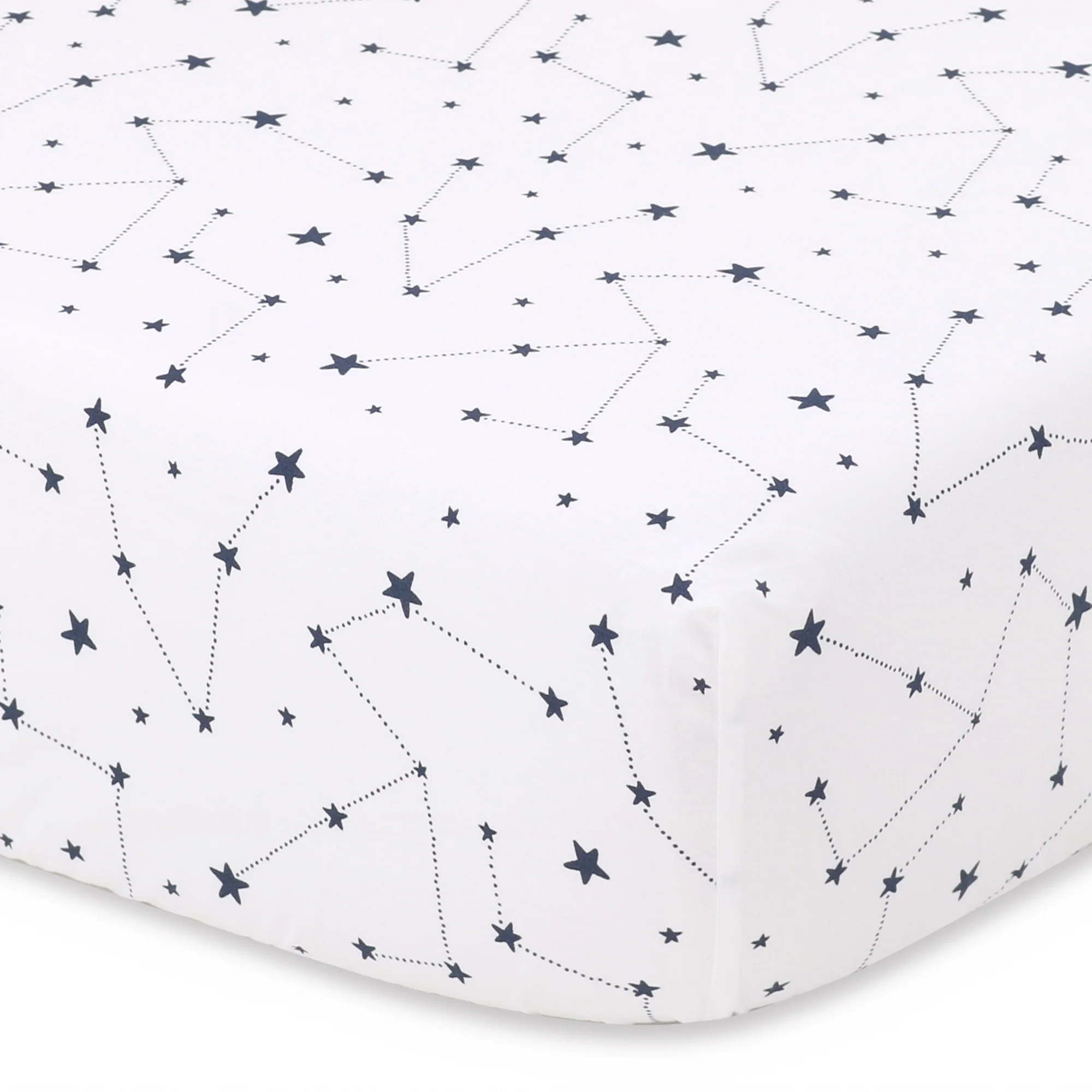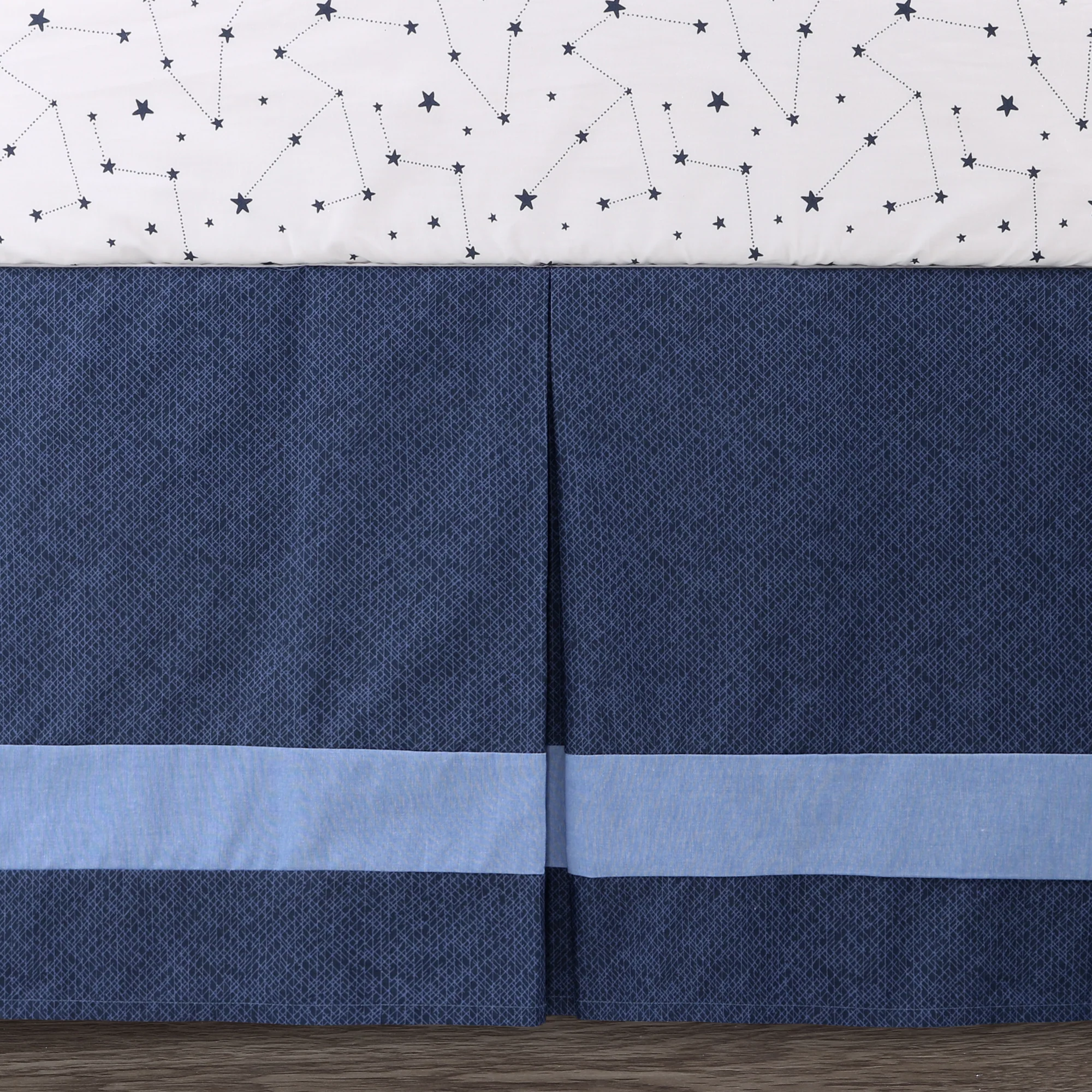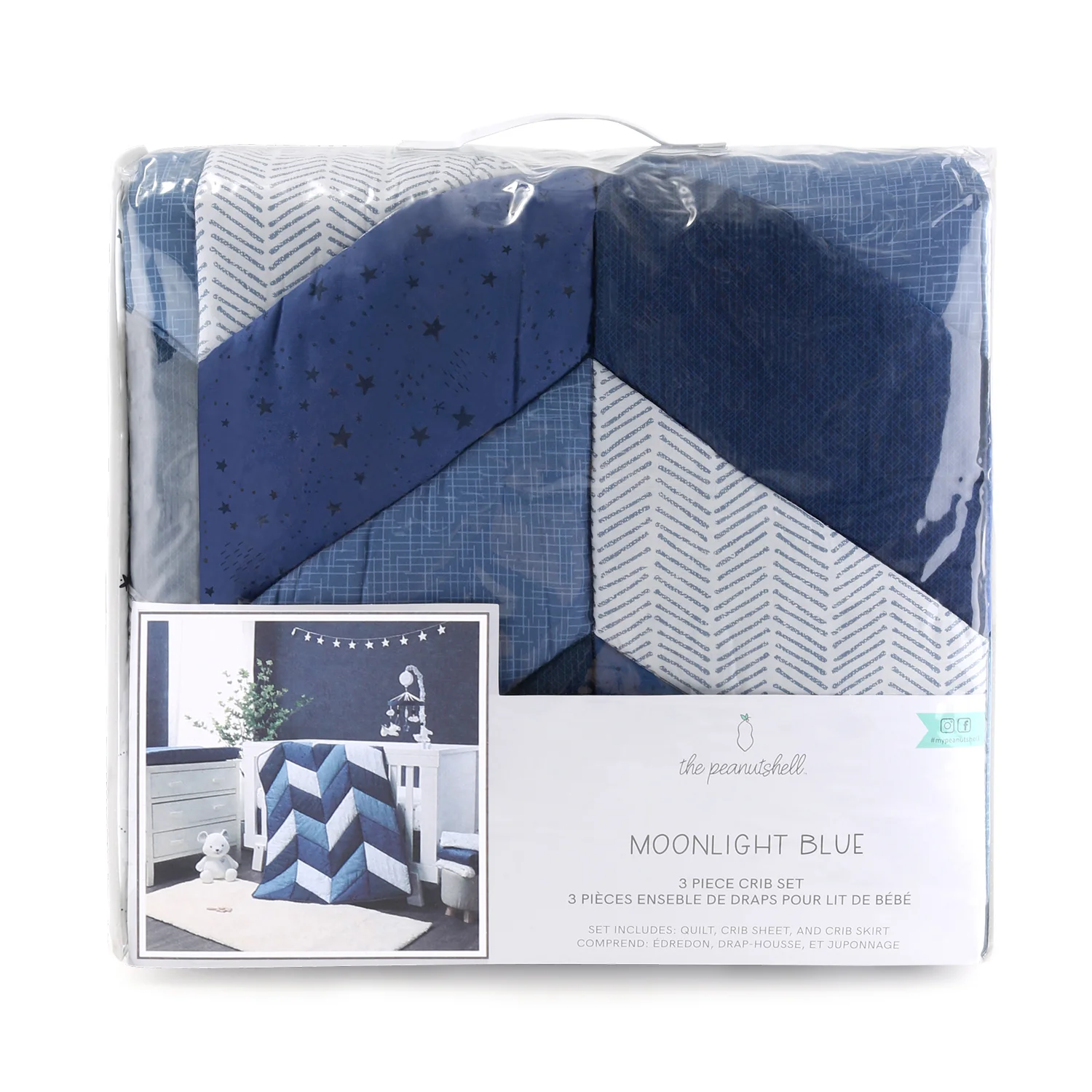 Send your little one to dream amongst the stars, while snuggled up in The Peanutshell Moonlight Blue 3 piece Crib Bedding Set. This beautiful set features an all-over printed quilt in 100% cotton, with quilting details to highlight the playful herringbone pattern of textured prints in shades of blue, white, navy, and black. Quilt is paired with an out of this world printed sheet featuring constellations in the sky, made of dark blue stars on a crisp white background, and a stunning crib skirt. Pair with other items from The Peanutshell's Moonlight Blue collection.