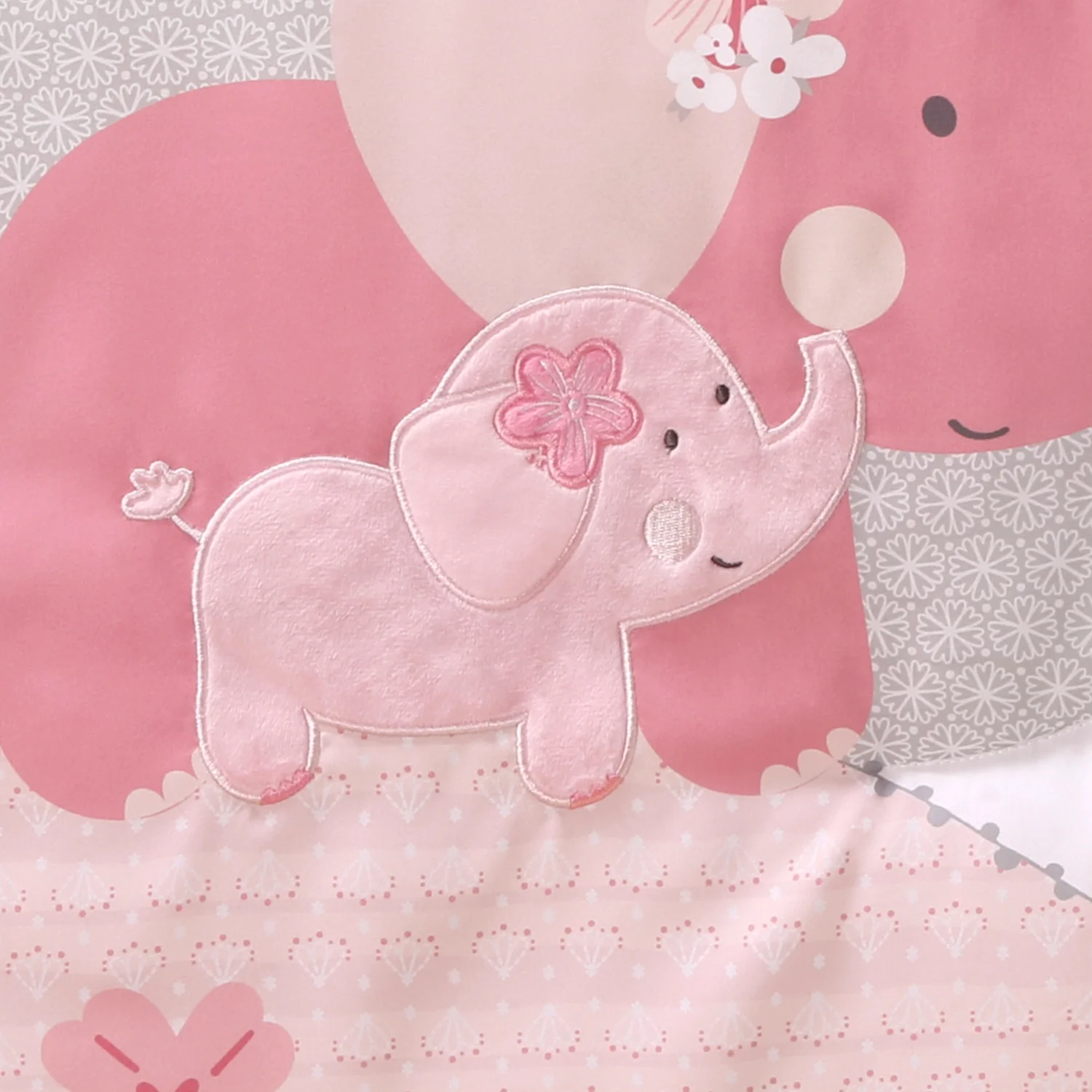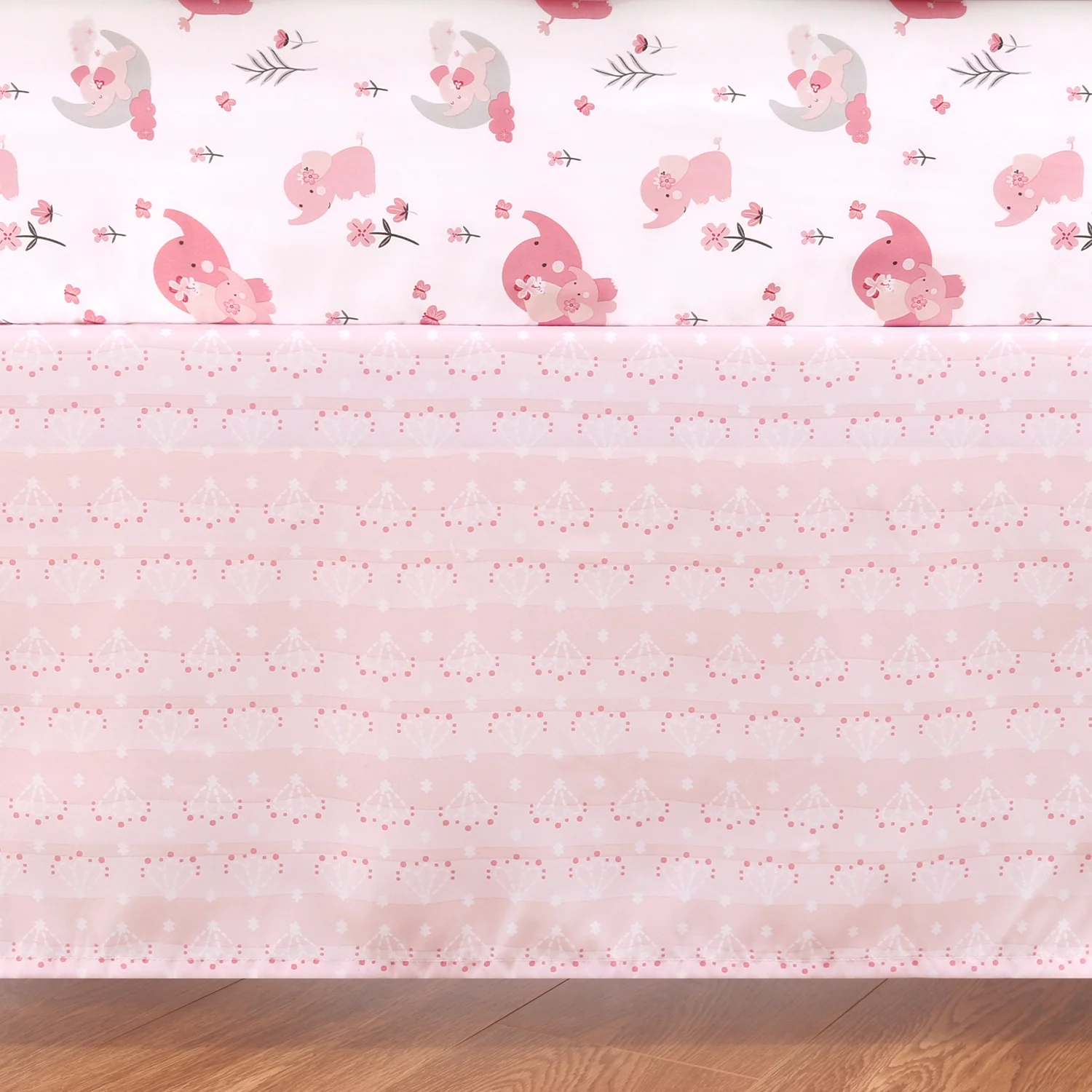 Cheerful pink elephants relax and play in a magical moonlit meadow. This 3 Piece Baby Bedding Set by The Peanutshell features a soft pink and gray color palette with botanical elements. Our crib quilt scene features sweet butterflies and celestial details inside a multi-tiered frame border with printed scallop edging. Reverse the quilt to showcase the pink tonal coordinating print. The multi-functional quilt works as a soft tummy time surface or decorative accent. One small elephant adds lush texture in velour applique. The fitted crib sheet is soft and stylish for the perfect universal fit, designed to fit a standard 28" x 52" crib mattress with snug fitting all around elastic. A tonal bohemian striped bed skirt completes the collection. Coordinate this crib set with our other adorable items to complete your nursery.