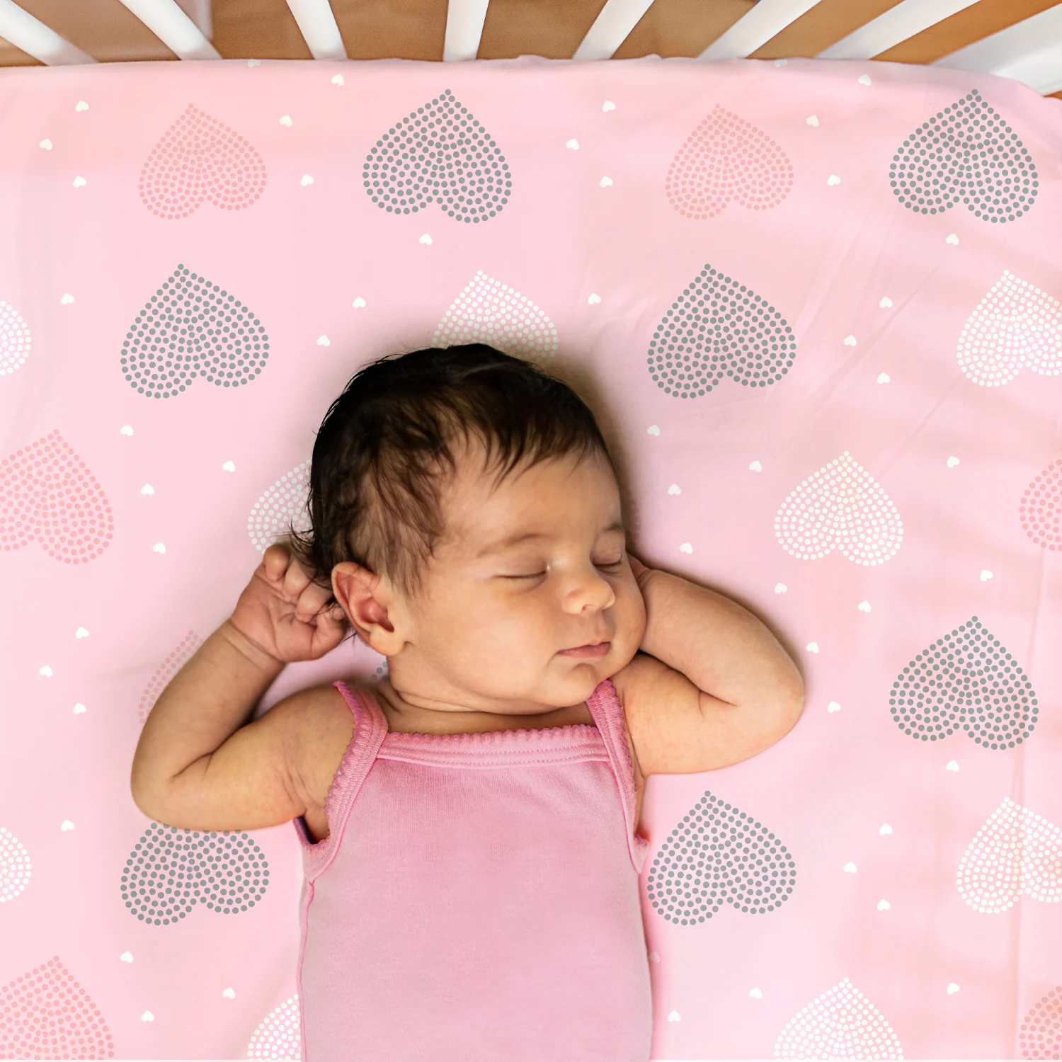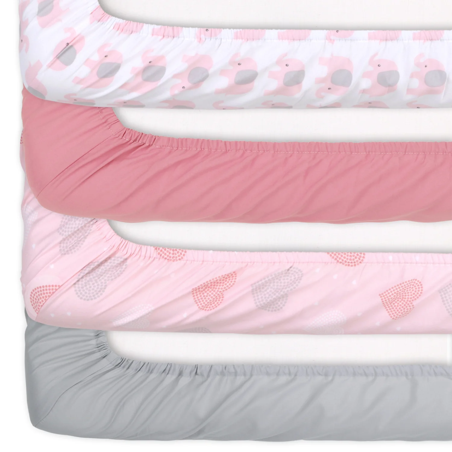 The Peanutshell Pink Elephants 4-Pack Fitted Crib Sheet Set for Baby Girls will lead the way to dreamtime. One pattern features pink elephants marching on a crisp white background. The second print has hearts in shades of pink and grey on a soft pink background. Two coordinating solid colored sheets are included. This set is sure to surround your baby girl with soft comfort as she sleeps soundly. Set of four makes for quick and easy changes, with simple machine wash/tumble dry care.