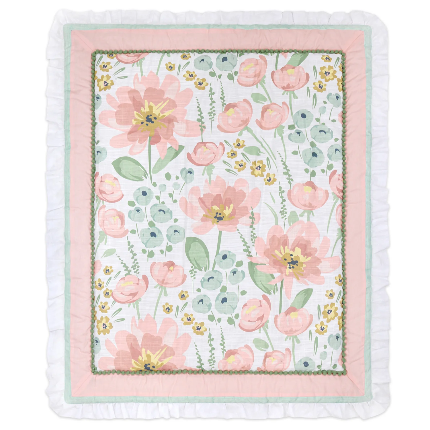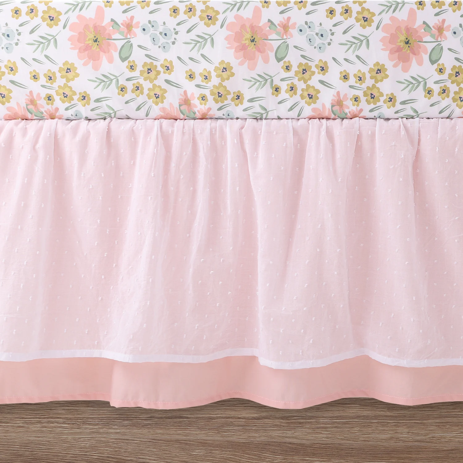 Create a warm and inviting nursery with our 4-piece Wildflower bedding set from The Peanutshell. This beautiful collection includes a quilt with ruffled border, a crib skirt, and two 100% organic cotton fitted sheets. Pastel shades of pink, green and blue petals create a calming and soothing atmosphere. The intricate floral designs on the quilt and organic cotton sheets add a touch of elegance and feminine flair to the room. Our tiered pink ruffled crib skirt beautifully complements the quilt. Made with high-quality organic materials (exclusive of decoration), this bedding set is not only stylish but also durable and easy to clean.