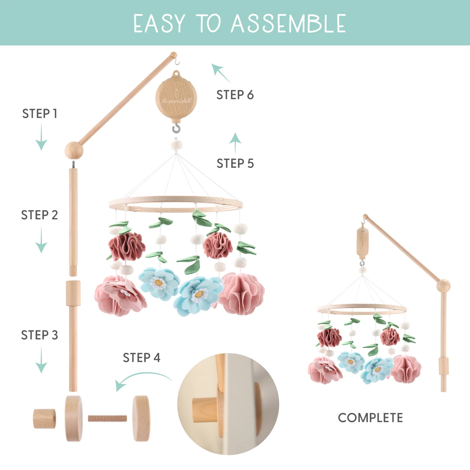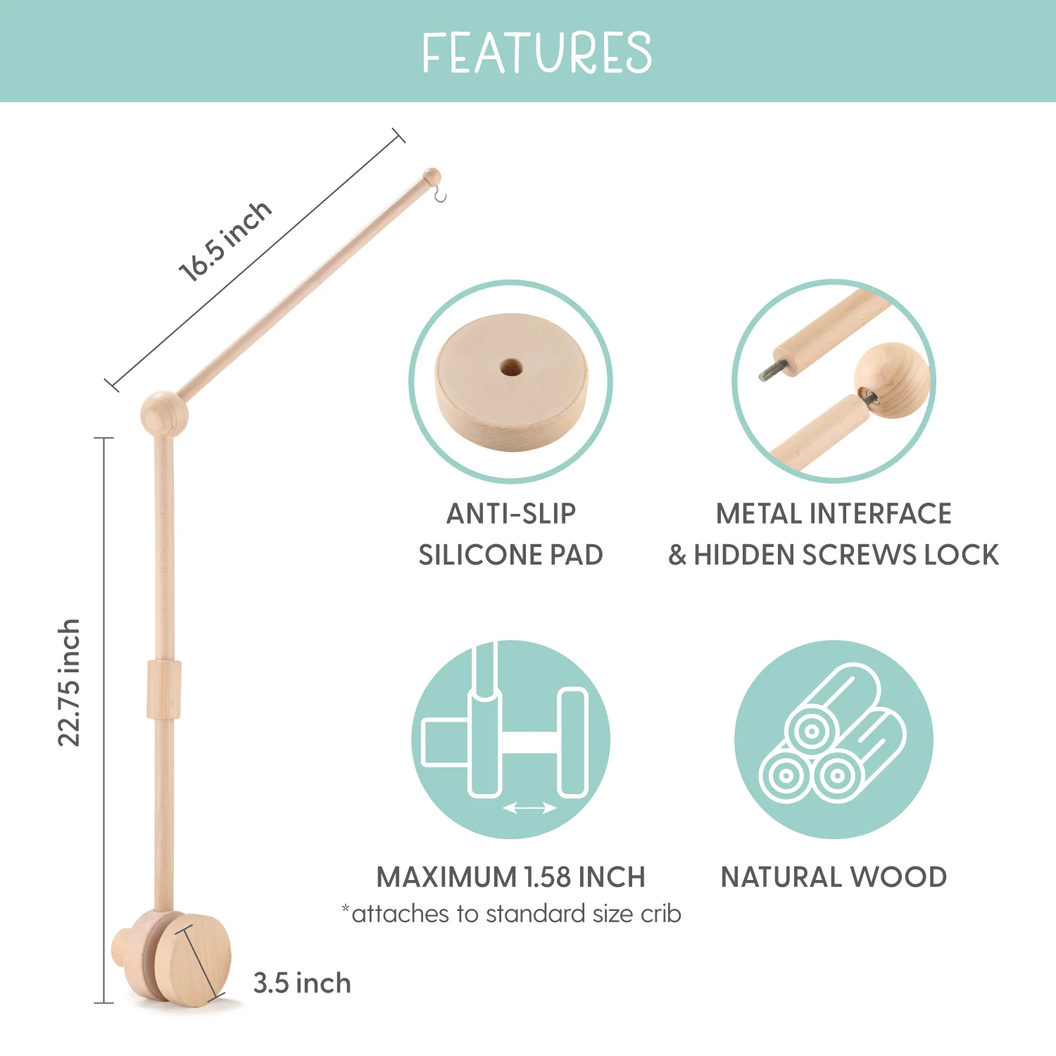 - Deluxe natural wood crib arm and mobile ring