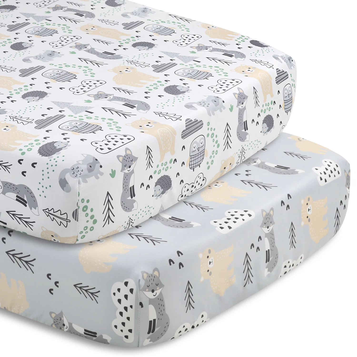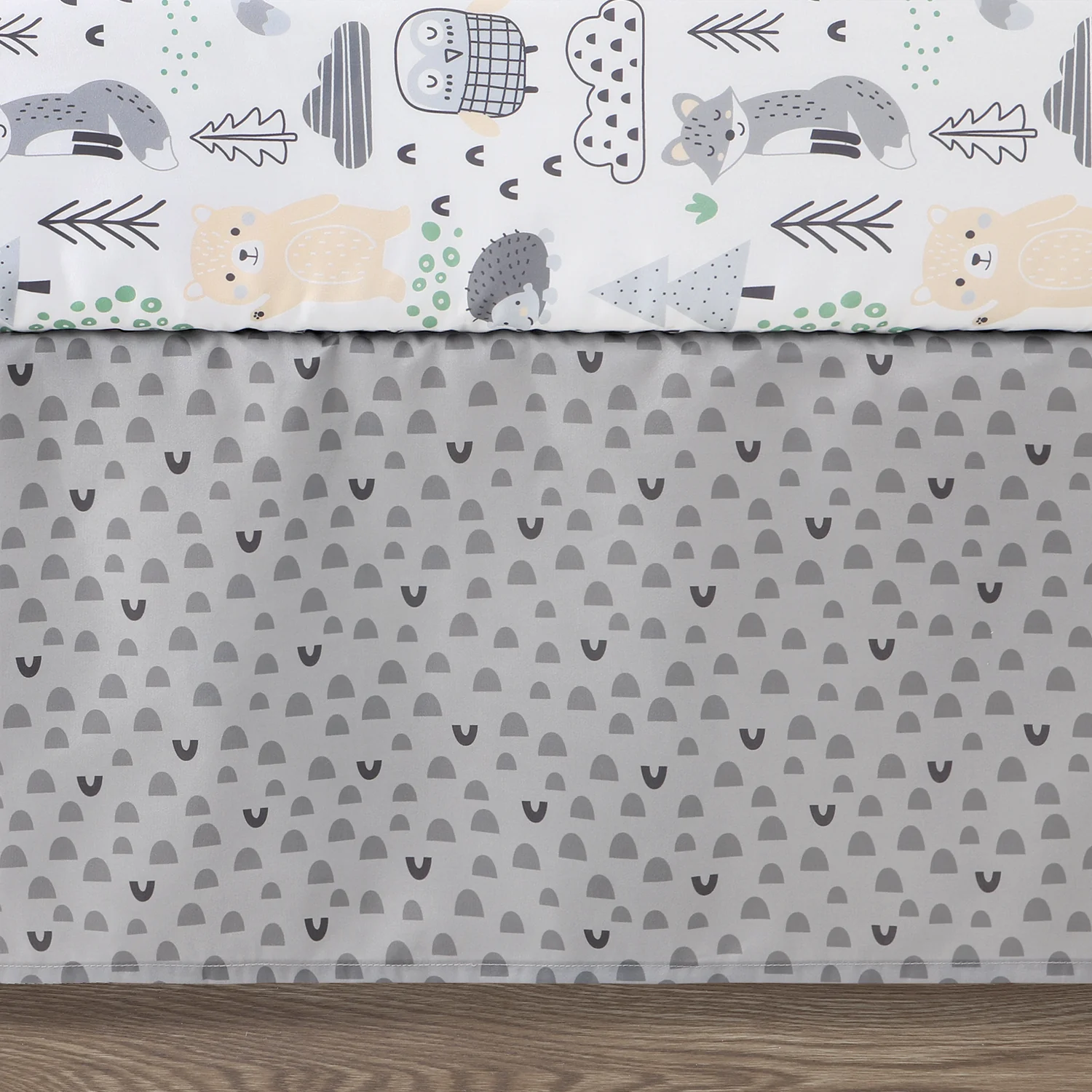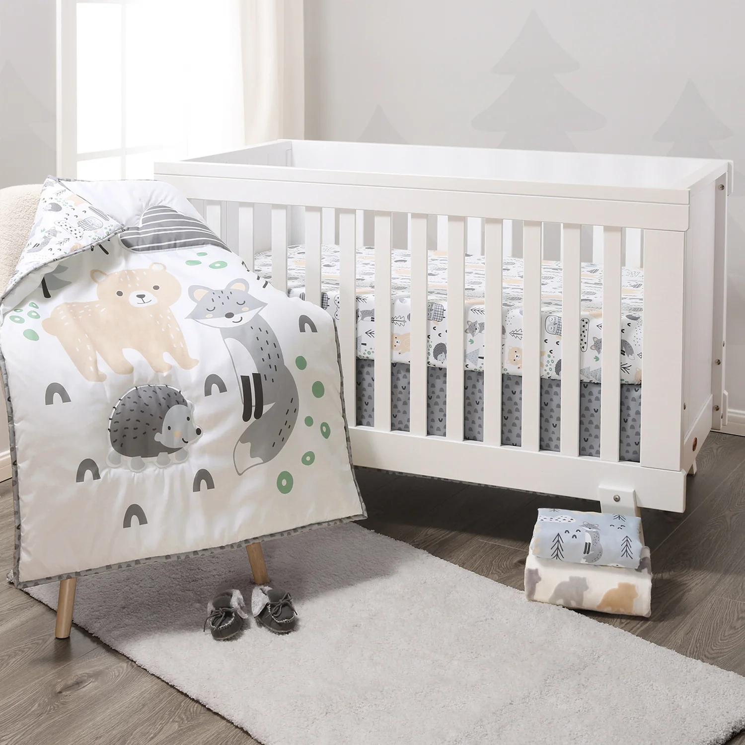 Bring the friendly forest right to your little one's nursery with this 5-piece Woodscape baby bedding set from The Peanutshell. Our generously sized 32" x 41" soft and cozy quilt features a bear, fox and hedgehog hanging out amid the clouds and trees in various shades of gray and green, framed in a gray border. The tossed character fitted crib sheet comes in a perfect universal fit, designed for a standard 28" x 52" crib mattress with snug fitting all around elastic. A second fitted sheet print features adorable bears and foxes surrounded by clouds, trees and small geometric details on a light gray background. The tonal gray geometric print bed skirt rounds out this woodsy look. Our 30" x 40" burnout velour blanket with tan and gray bear silhouettes is the perfect accessory for stroller walks or comfy cuddles.