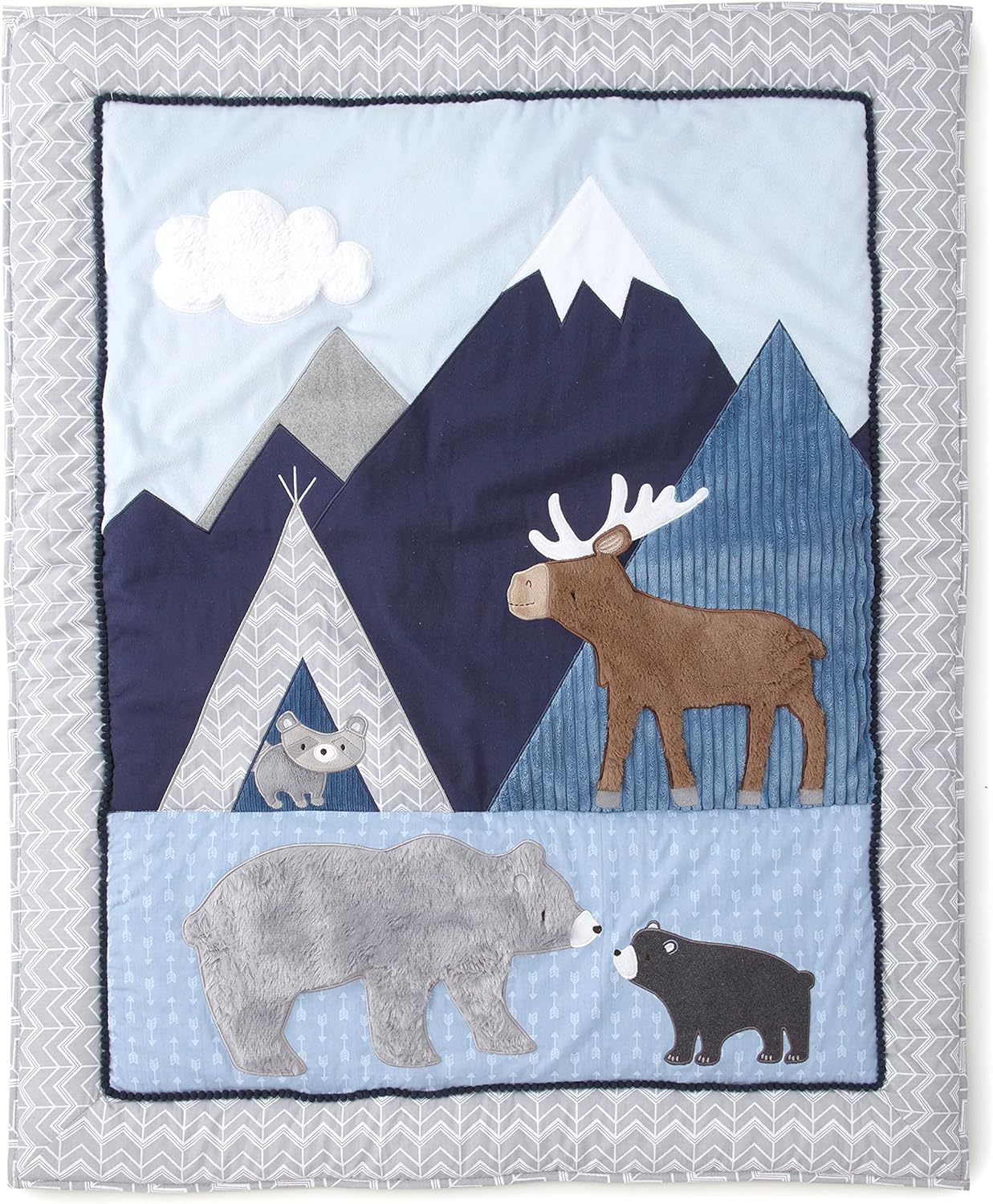 - ADORABLE MOUNTAIN BEAR THEME: You will think you are a fun mountain camping adventure with a bear, her cub and a friendly moose with our adorable moutain bear look. The fitted sheet is white arrows on a blue ground