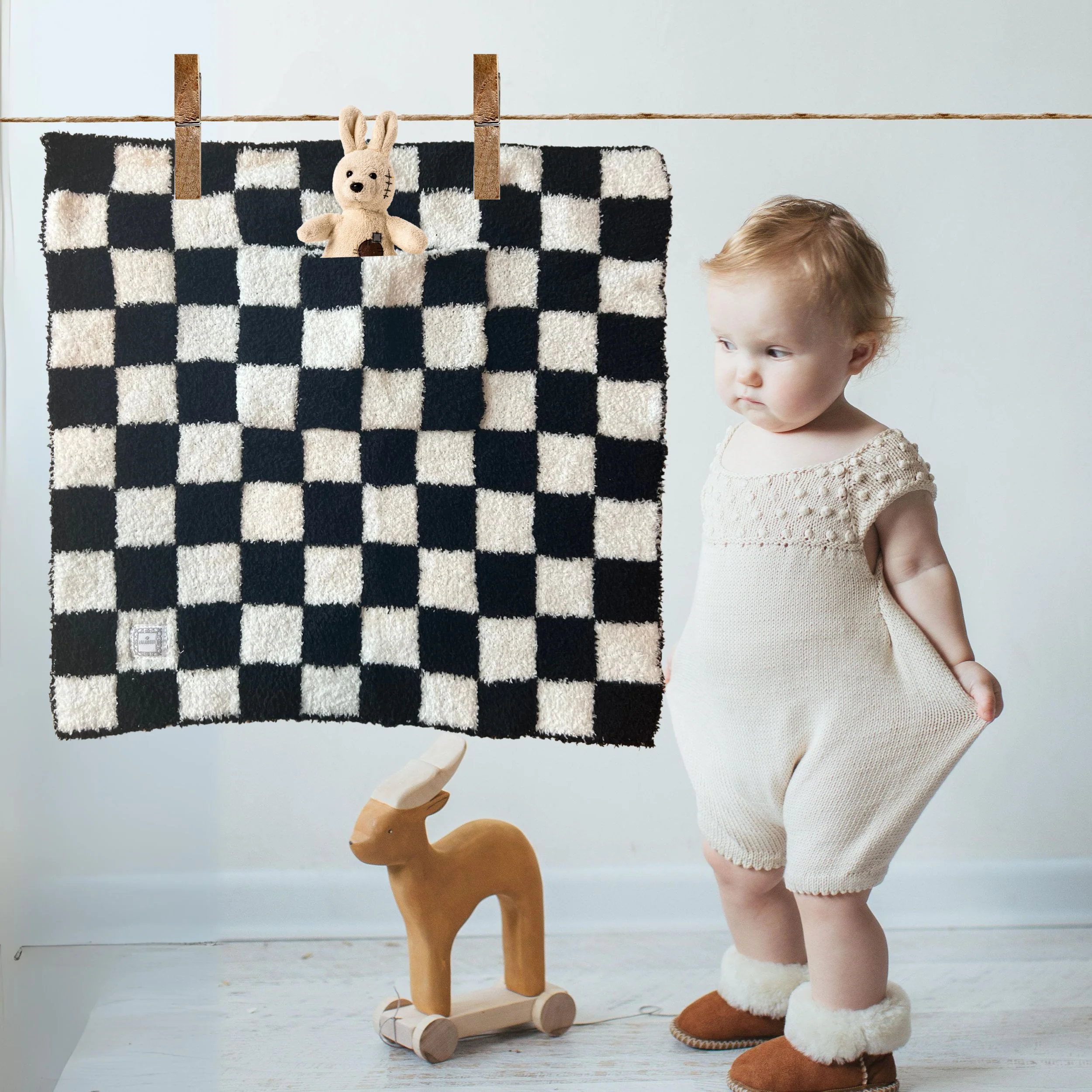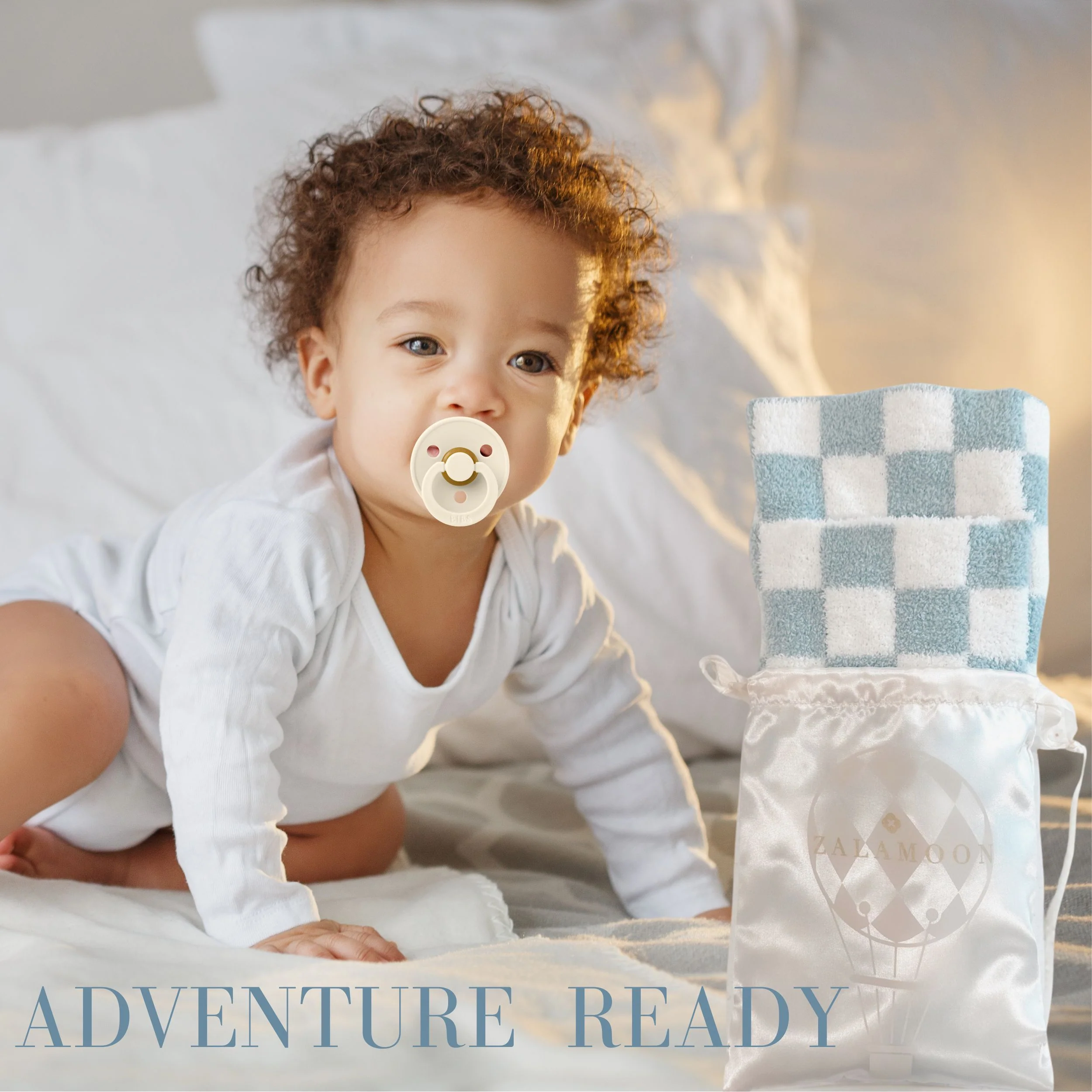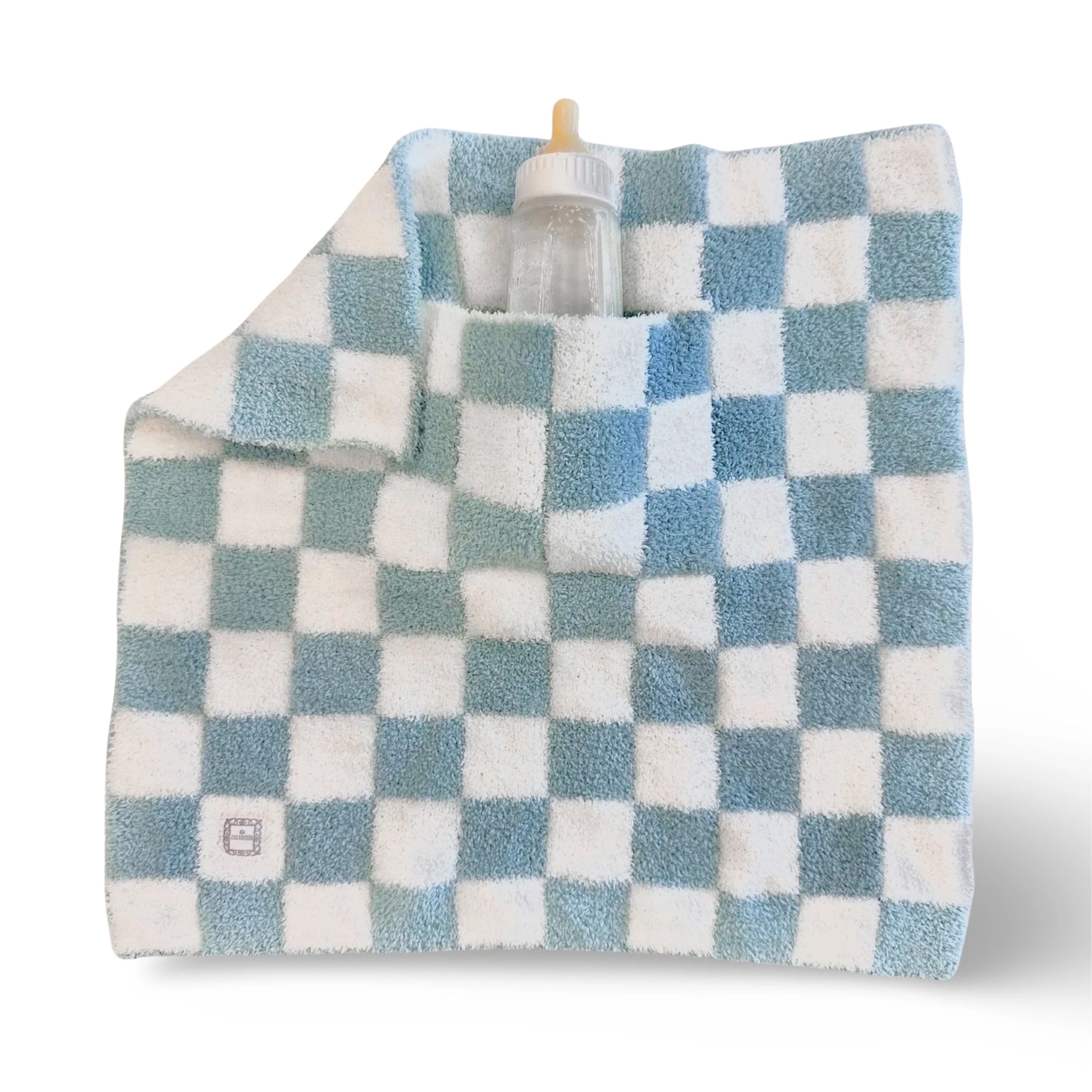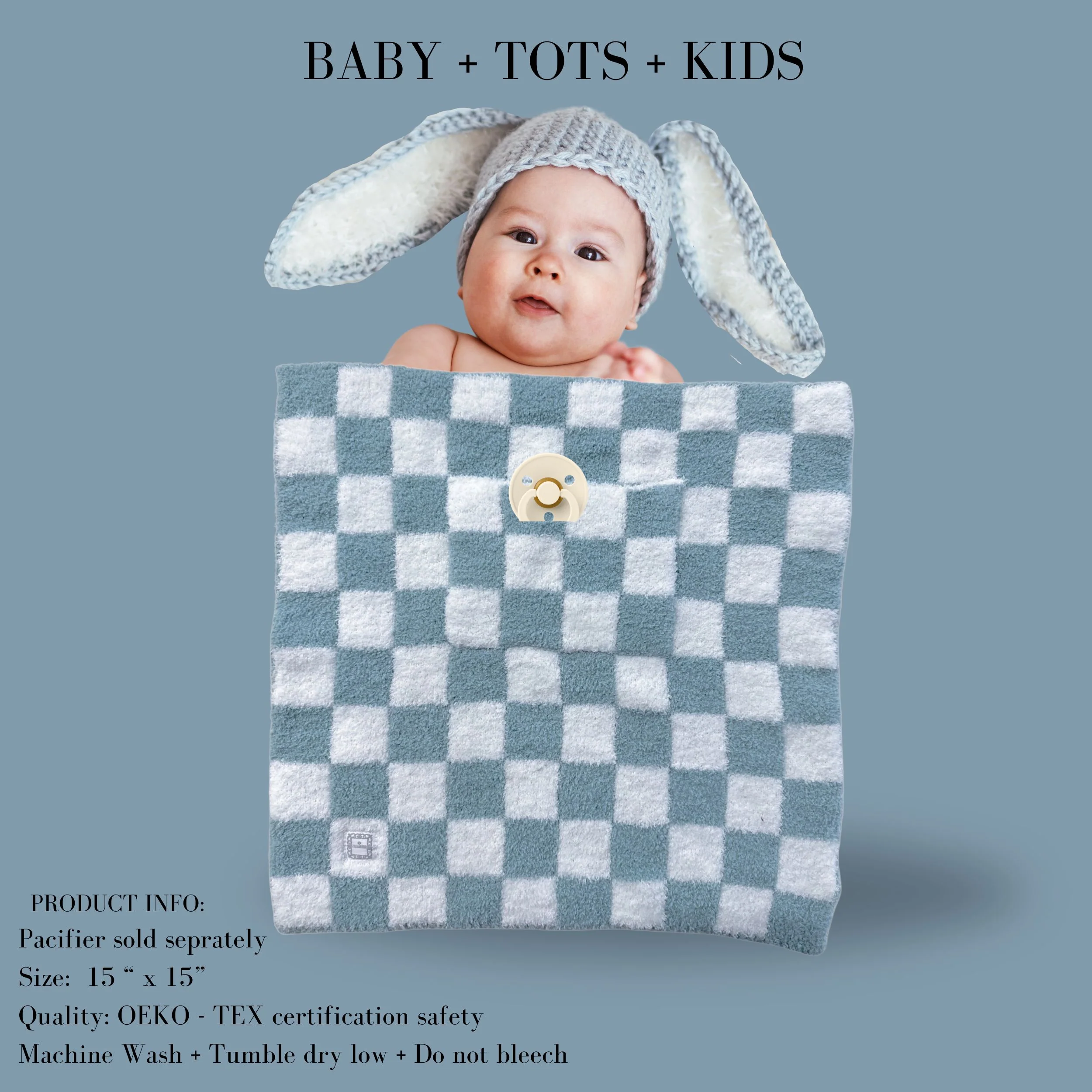 This plush checkered ZALAMOON mini-blanket has a sweet pocket for stashing their favorite toy, pacifier or snack. The smaller size makes it great for on-the-go soothing.