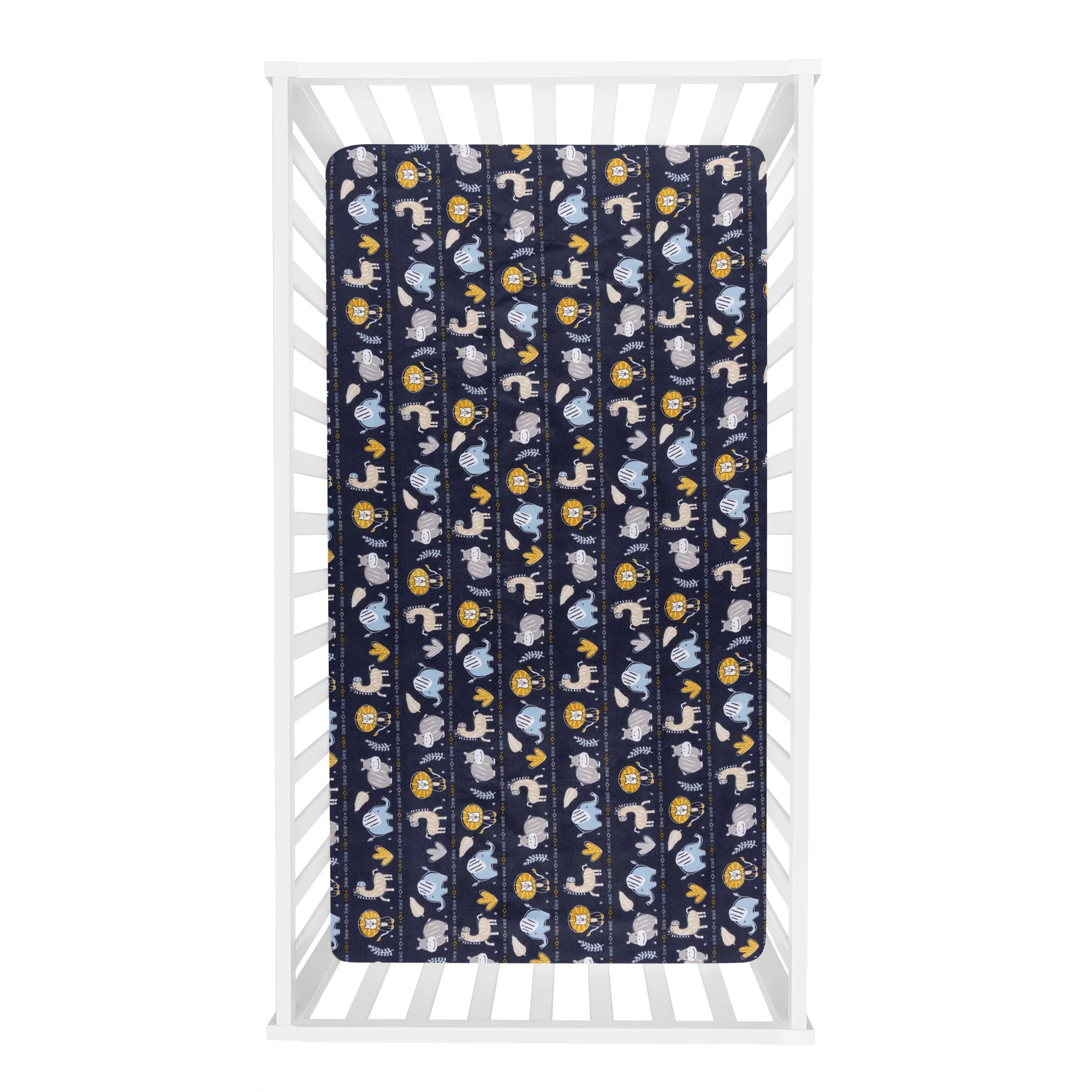 Follow the safari parade with the Zambia 2-Pack Microfiber Fitted Crib Sheet Set by Sammy & Lou. This set of 2 wonderful soft crib sheets includes a directional safari print featuring a hippo, zebra, lion, elephant and plants, separated by a line and diamond print in cool blue, tan, orange, glacier Gray, white on a navy-blue background. A coordinating sheet features dot stripes with a hippo, lion and elephant scattered in a cool blue, orange, navy blue, white on a glacier Gray background. Crib sheets fit a standard 28 in x 52 in crib mattress with 8-inch-deep pockets and elastic surrounding the entire opening ensuring a more secure safer fit. Coordinating Zambia bedding and accessories by Sammy & Lou are sold separately.