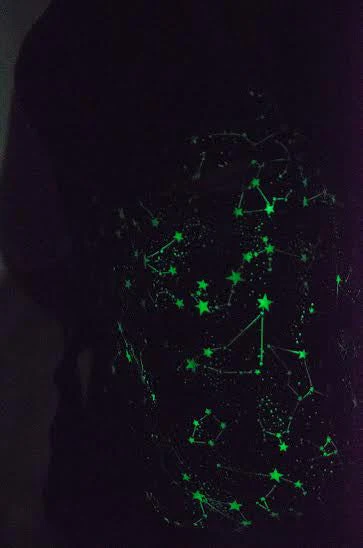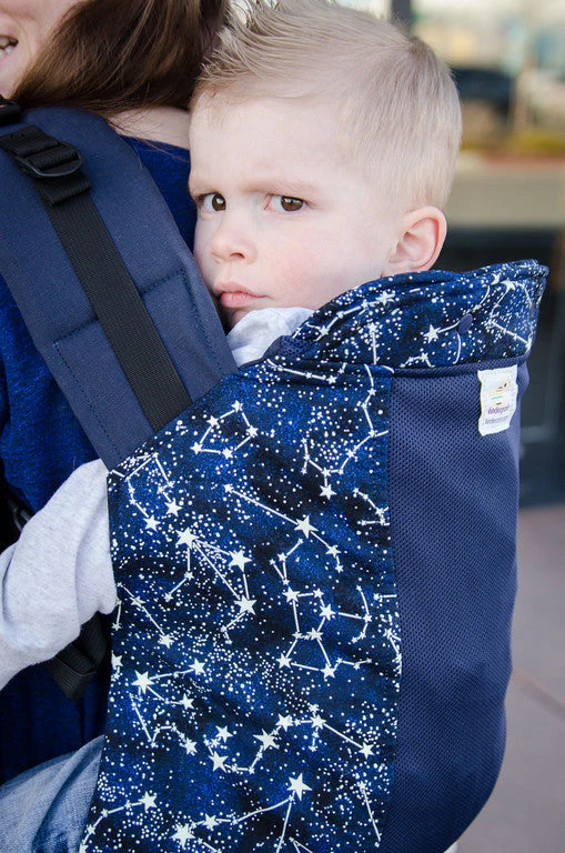 Glow-in-the-dark stars that line up as the constellations on a navy and black swirled galaxy style background. It is paired with navy straps and navy Koolnit with a stuffable Koolnit sleep shade. A classic Kinderpack print.