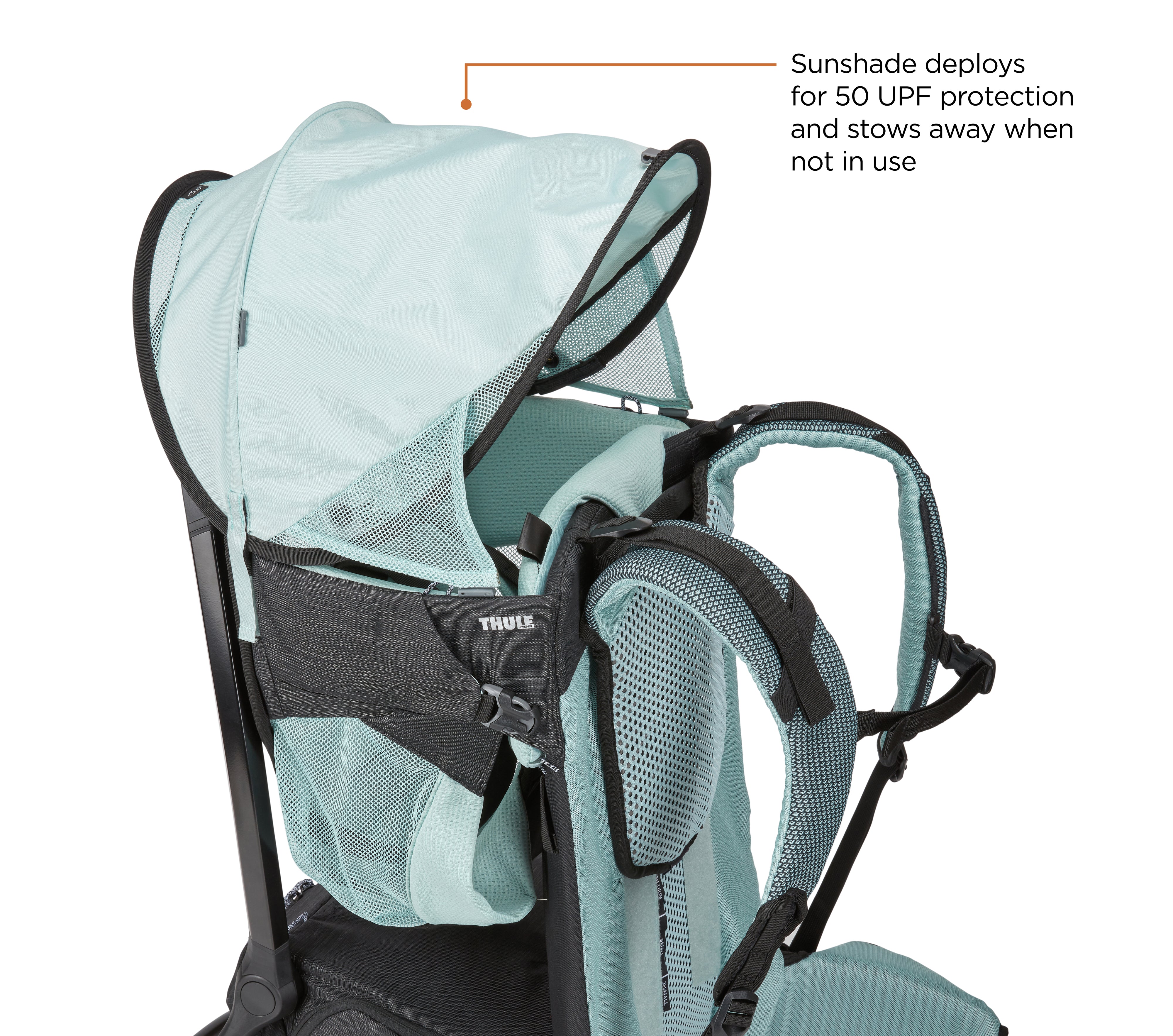 - Ample sunshade, A deployable UPF 50 sunshade protects your child and keeps it cool -Access gear compartment on the go, Easily access the 22L gear compartment while wearing the pack through convenient side zippers