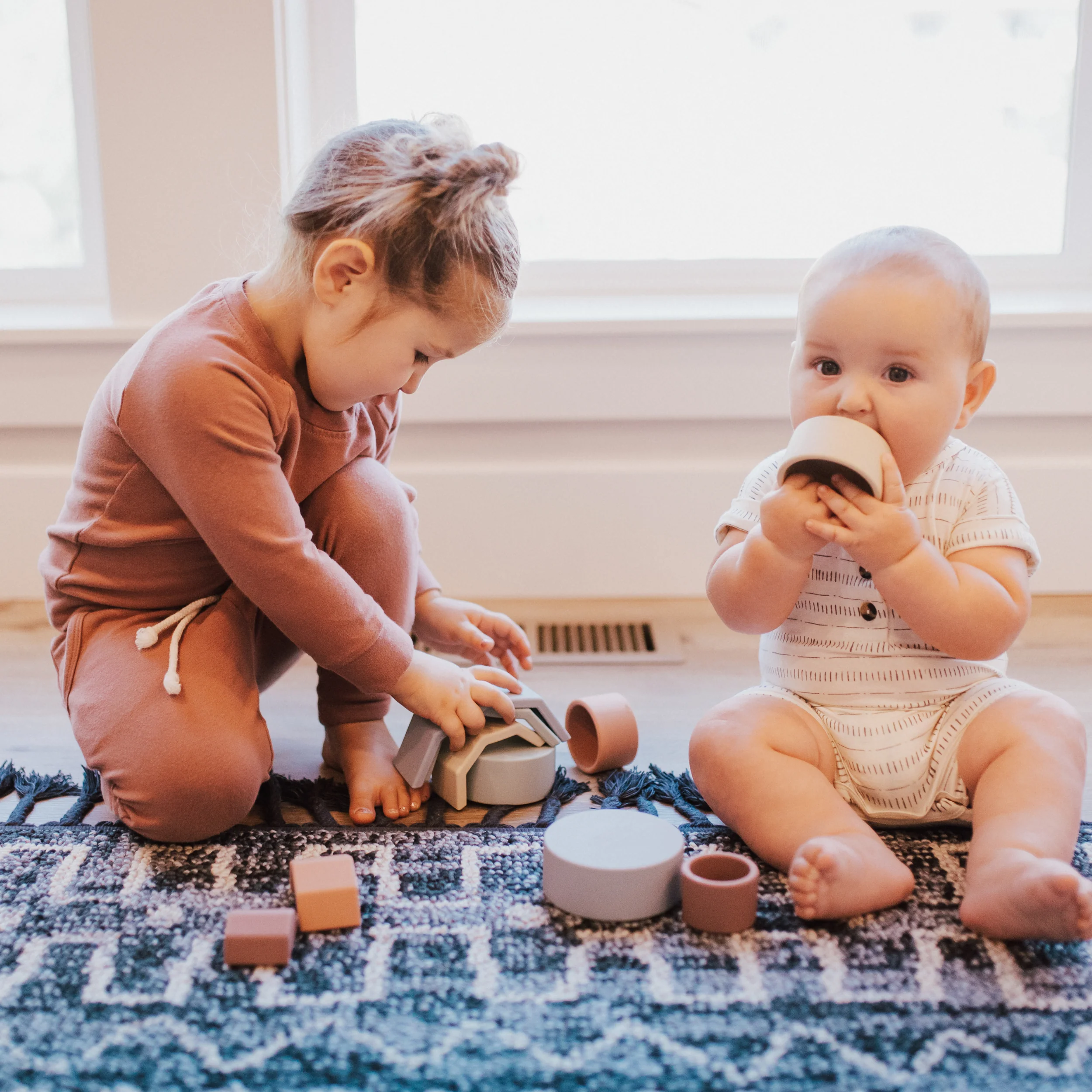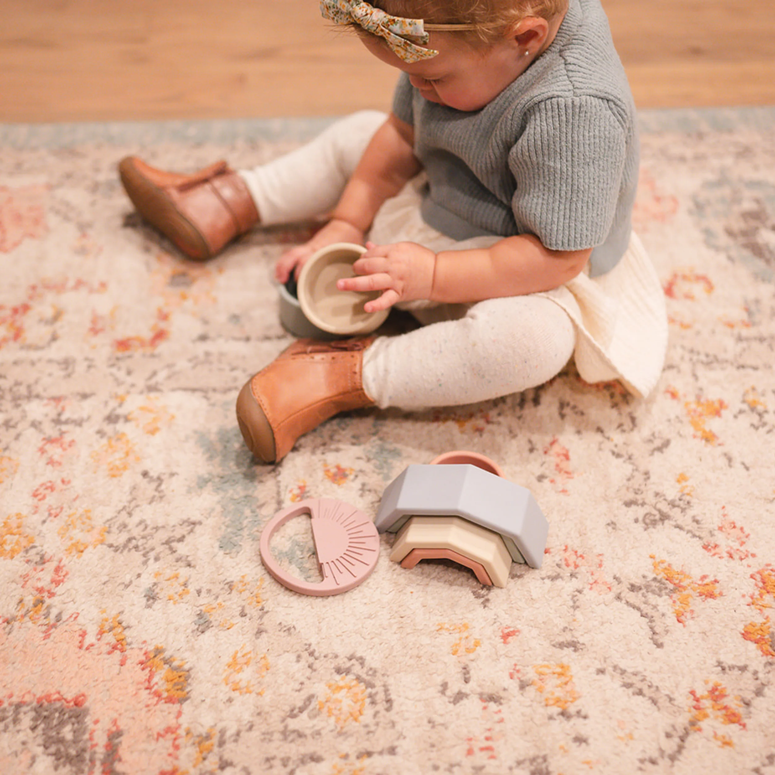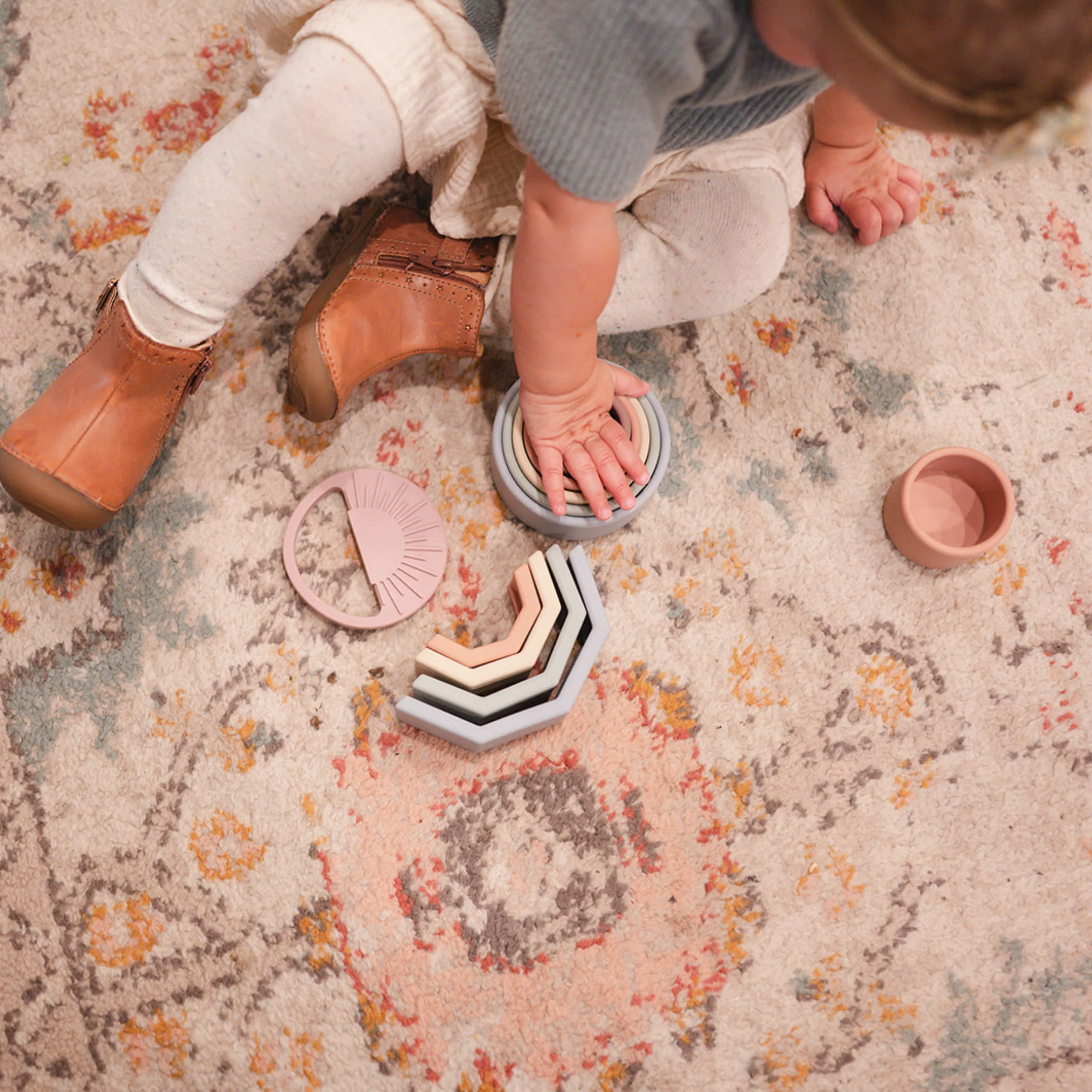 Stacking toys help develop both the body and the brain starting around six months