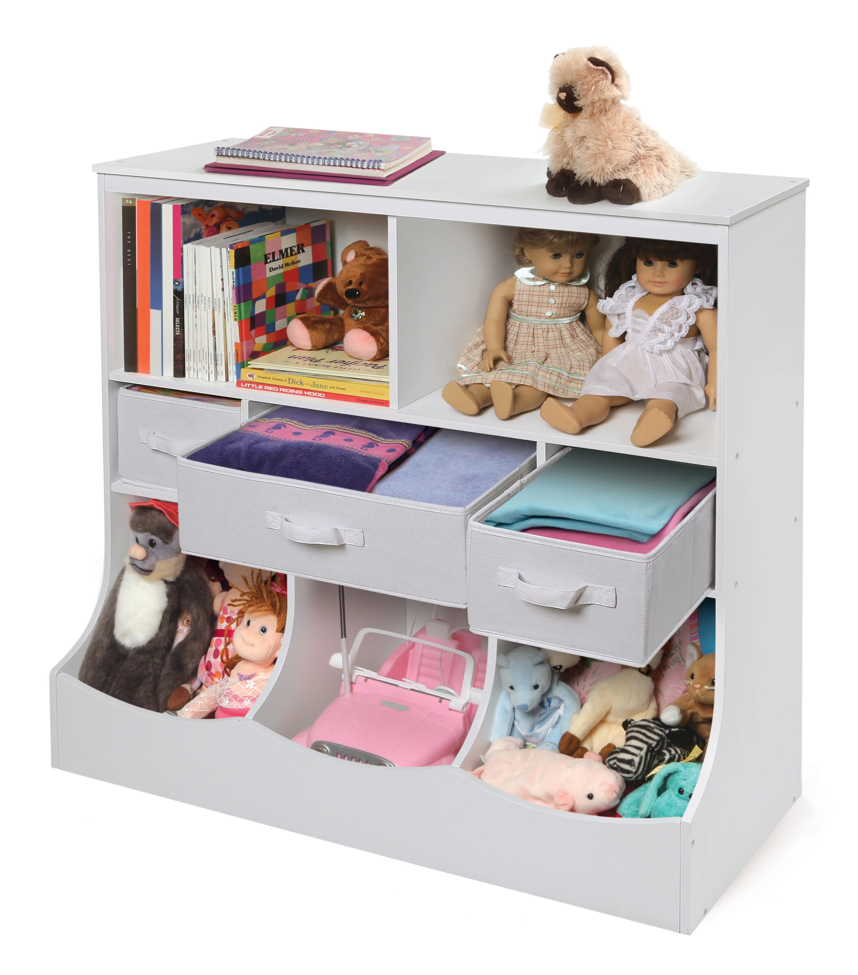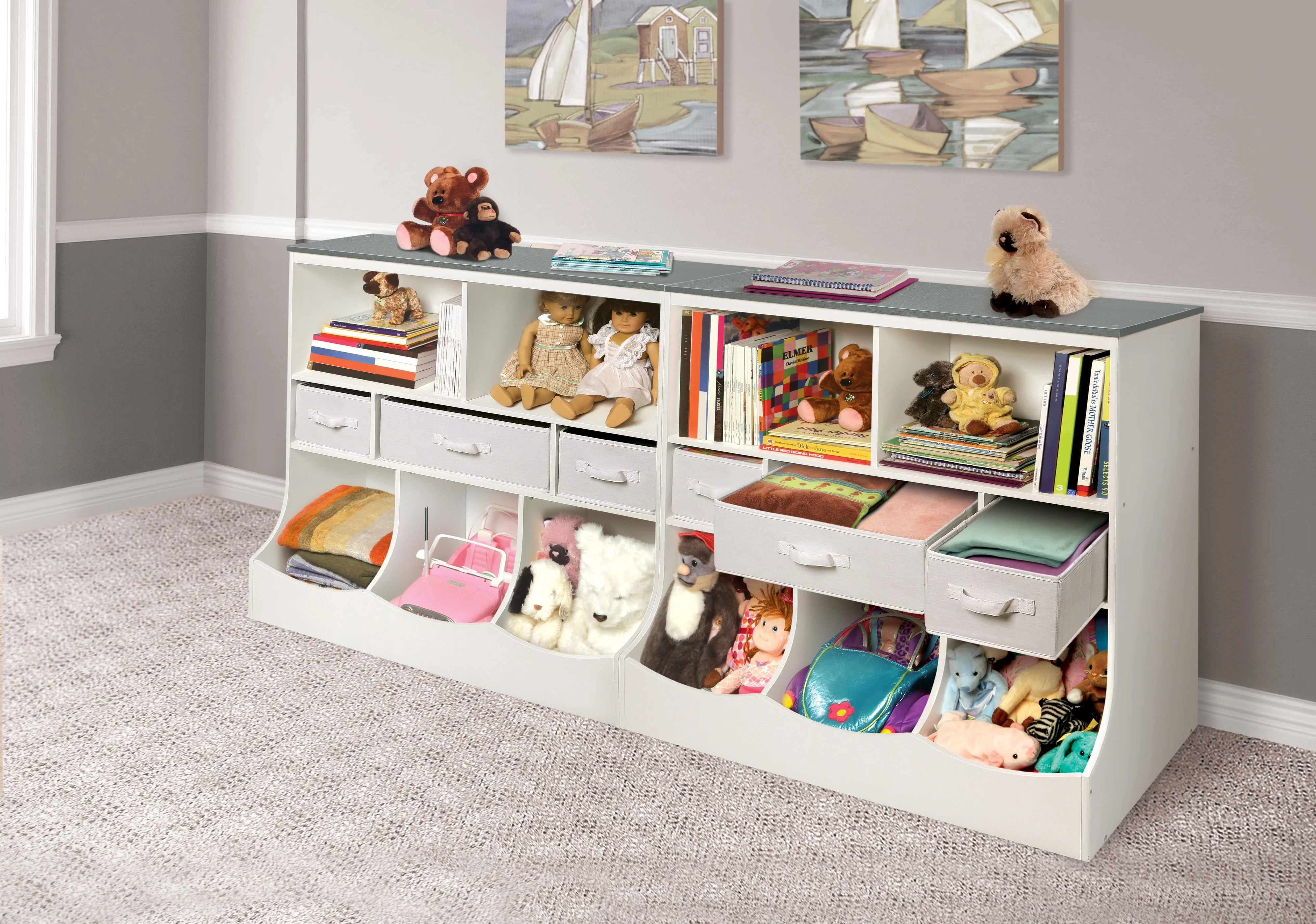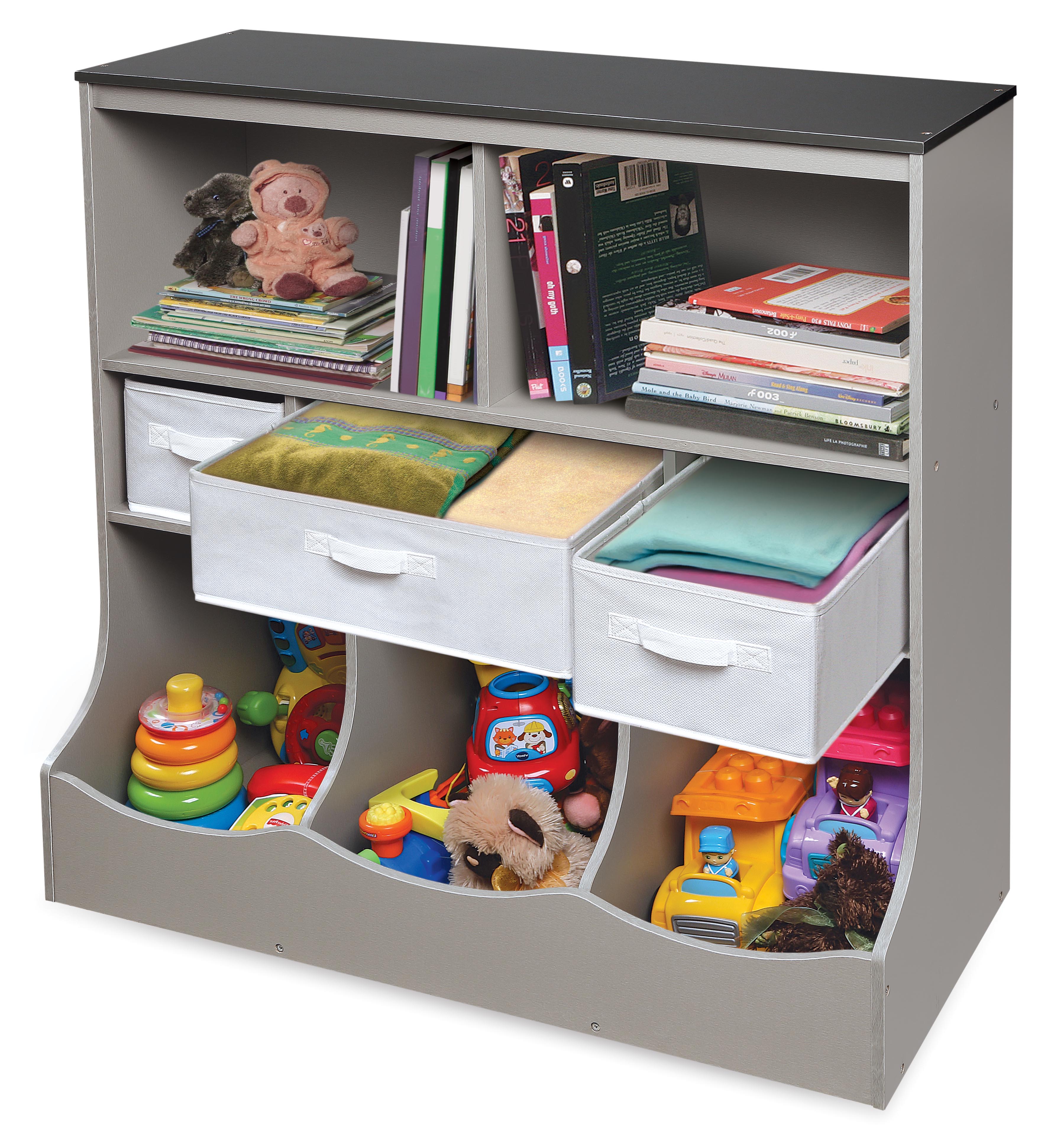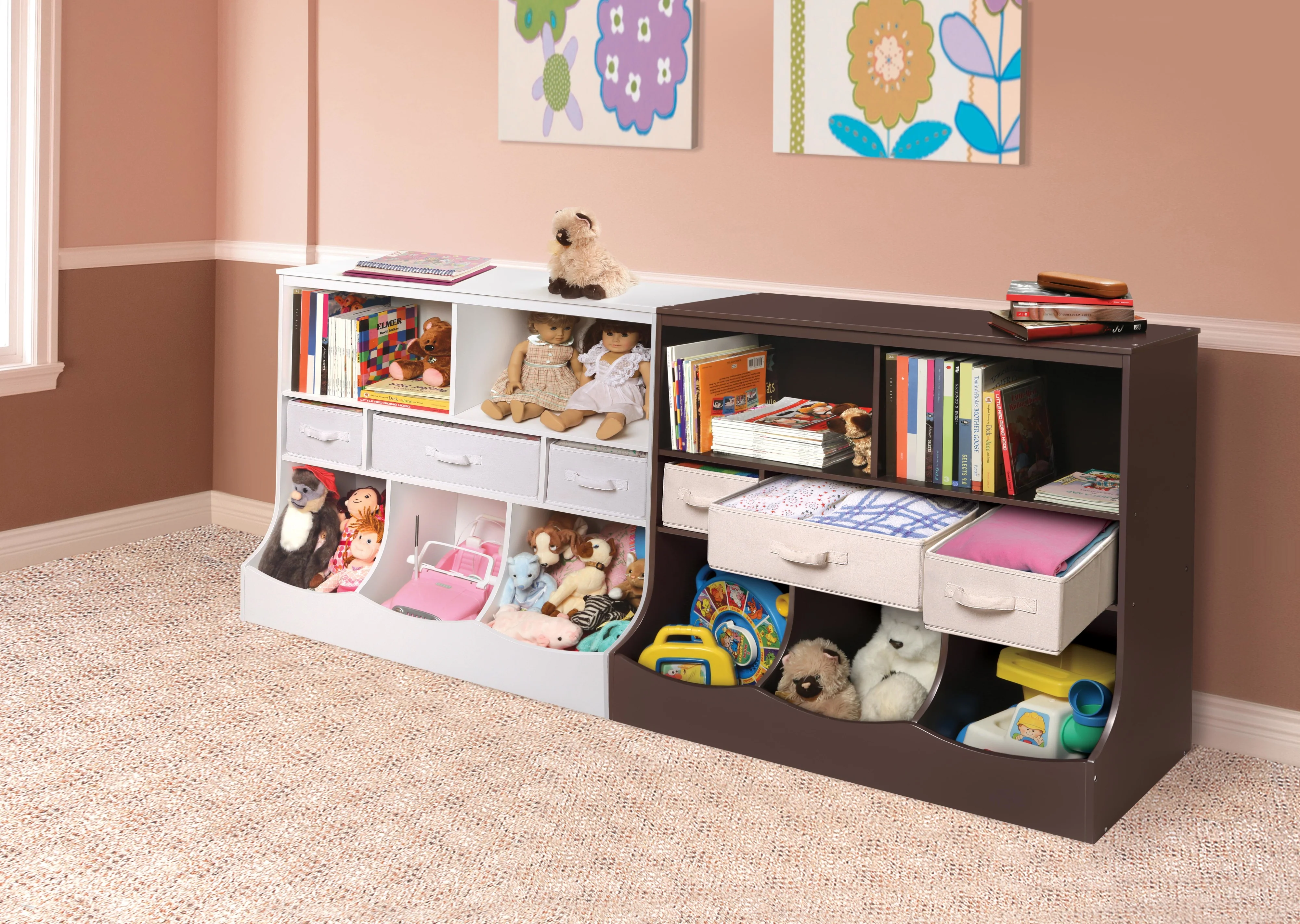 Badger Basket's orderly Combo Bin Storage Unit pulls together toys, school books, crafts, sports gear and more. Use the shelves, baskets, and bins to gain control of a variety of items in any room of the house, particularly messy playrooms and foyers.