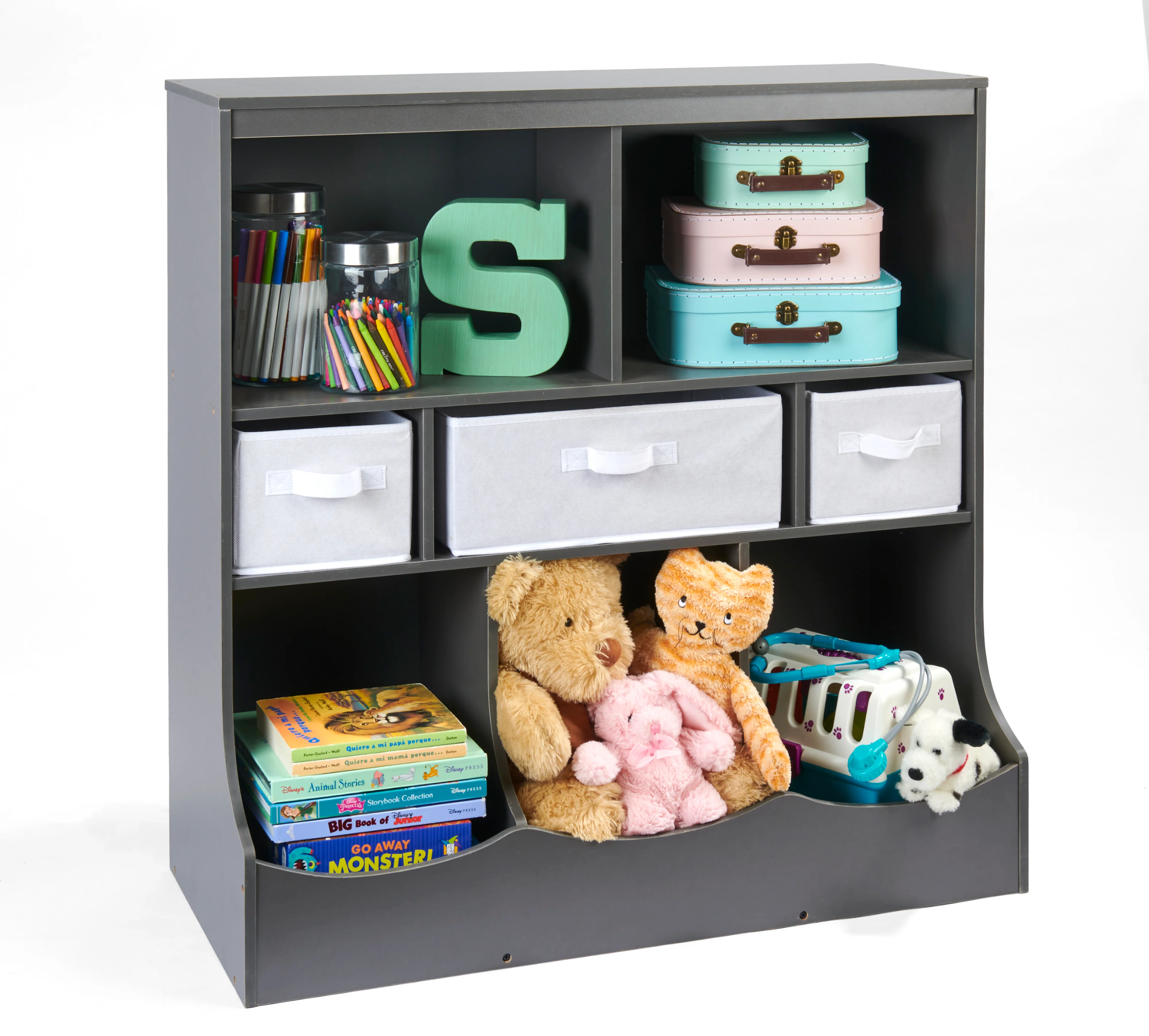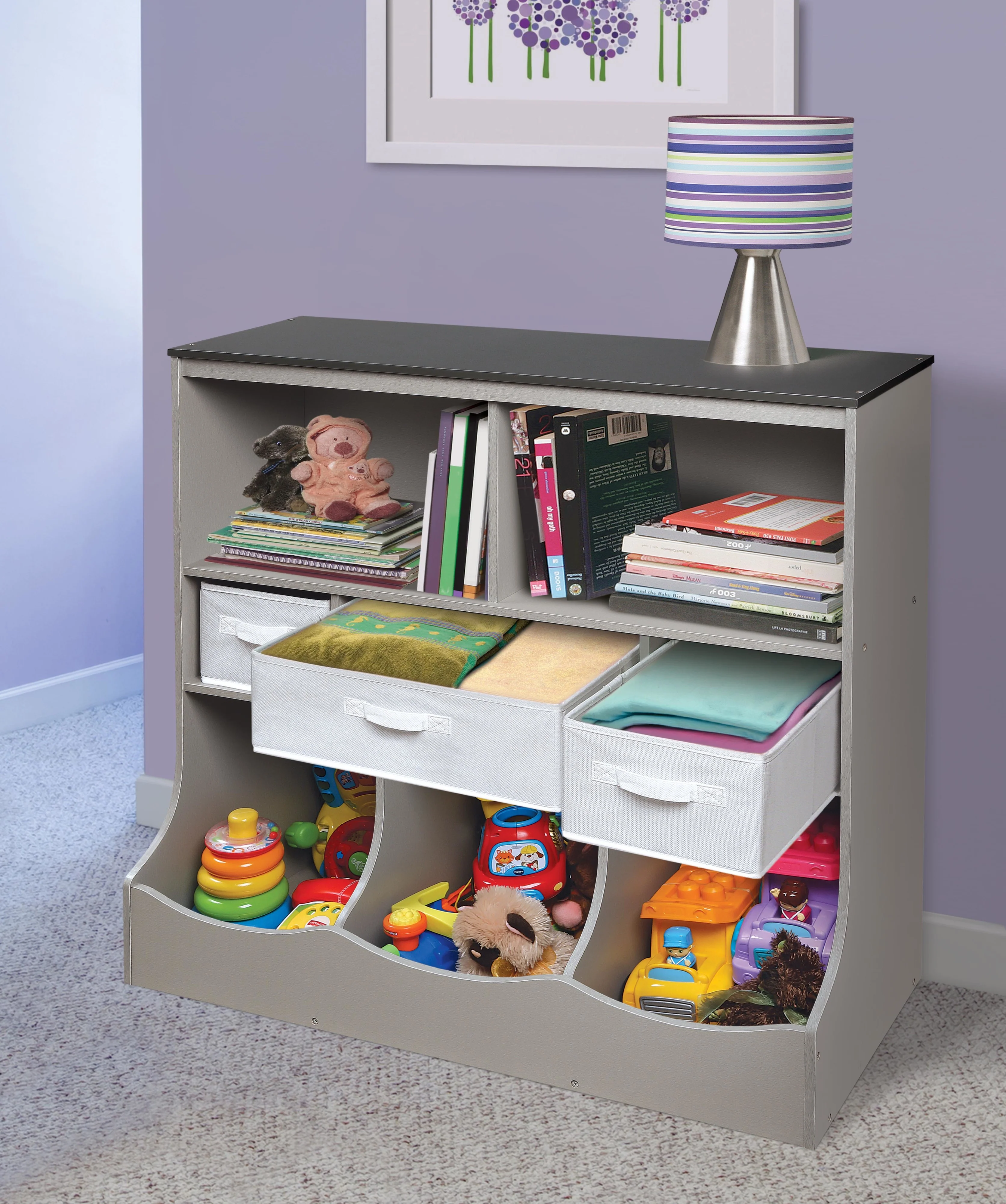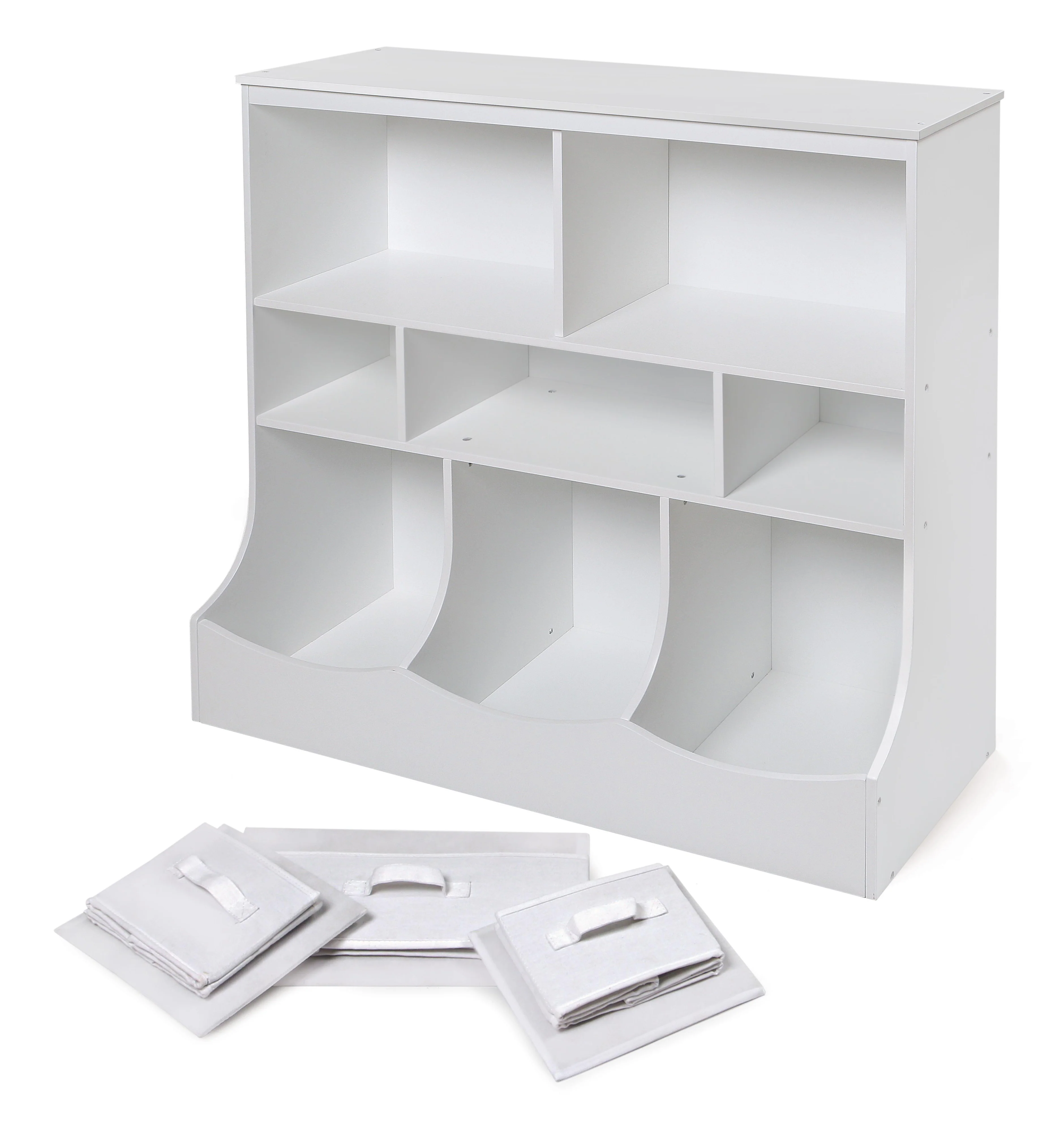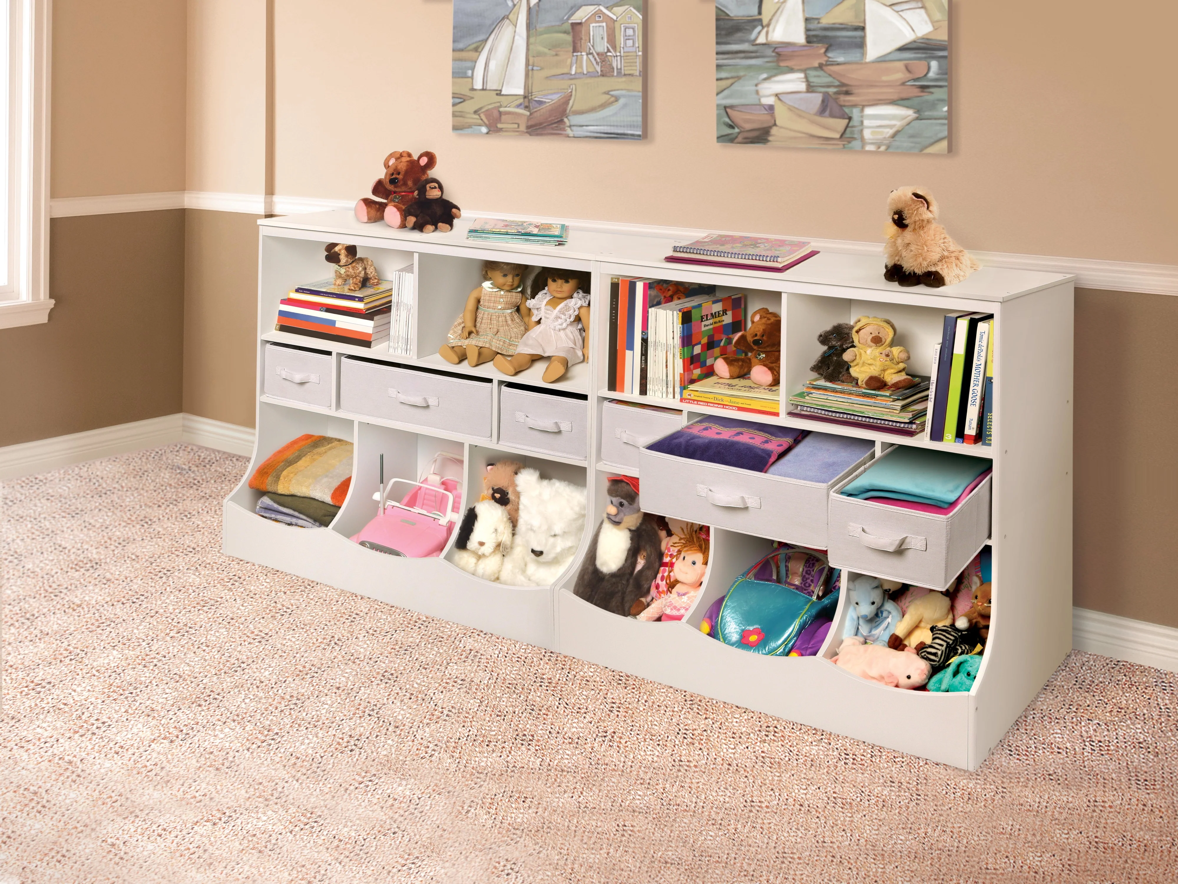 Badger Basket's orderly Combo Bin Storage Unit pulls together toys, school books, crafts, sports gear and more. Use the shelves, baskets, and bins to gain control of a variety of items in any room of the house, particularly messy playrooms and foyers.