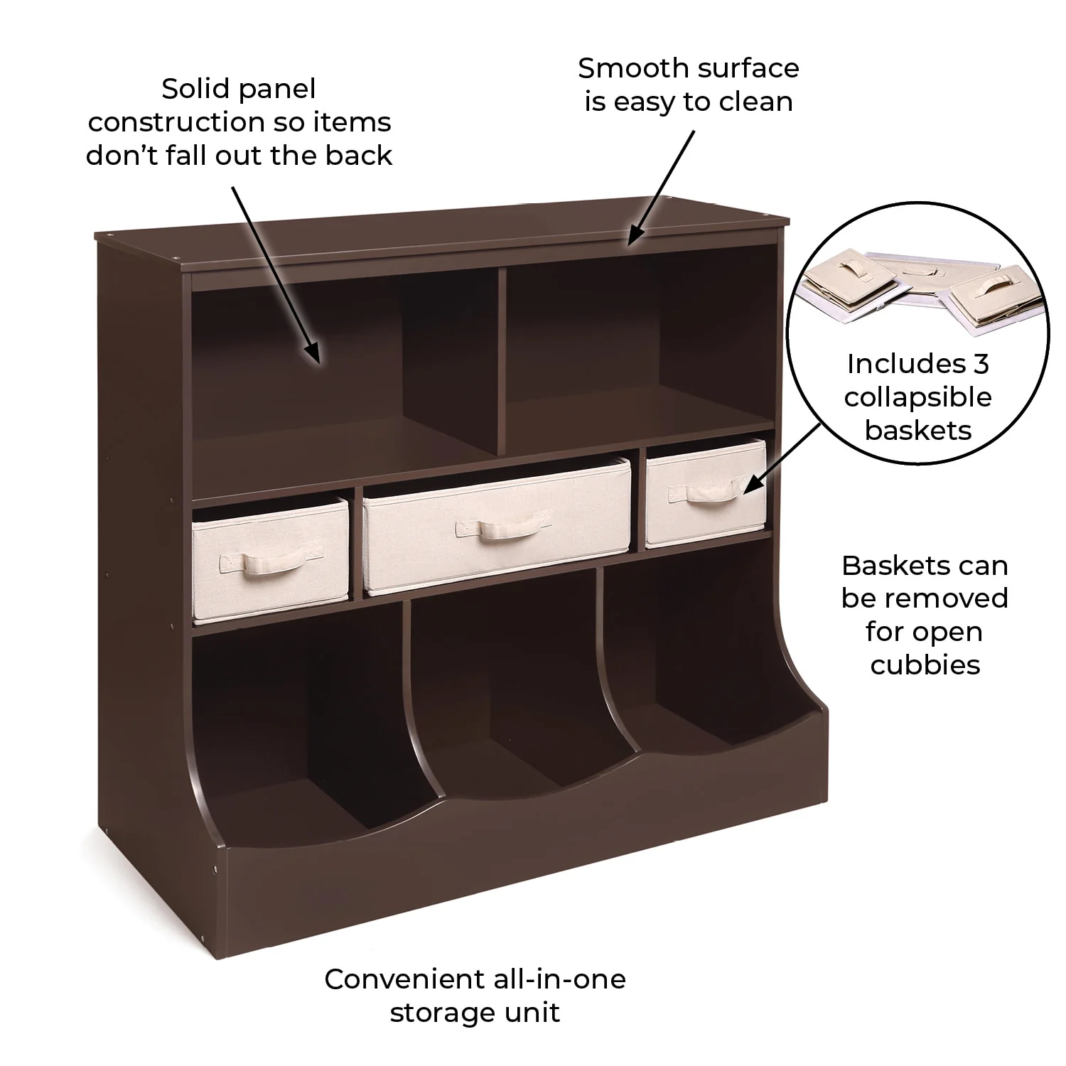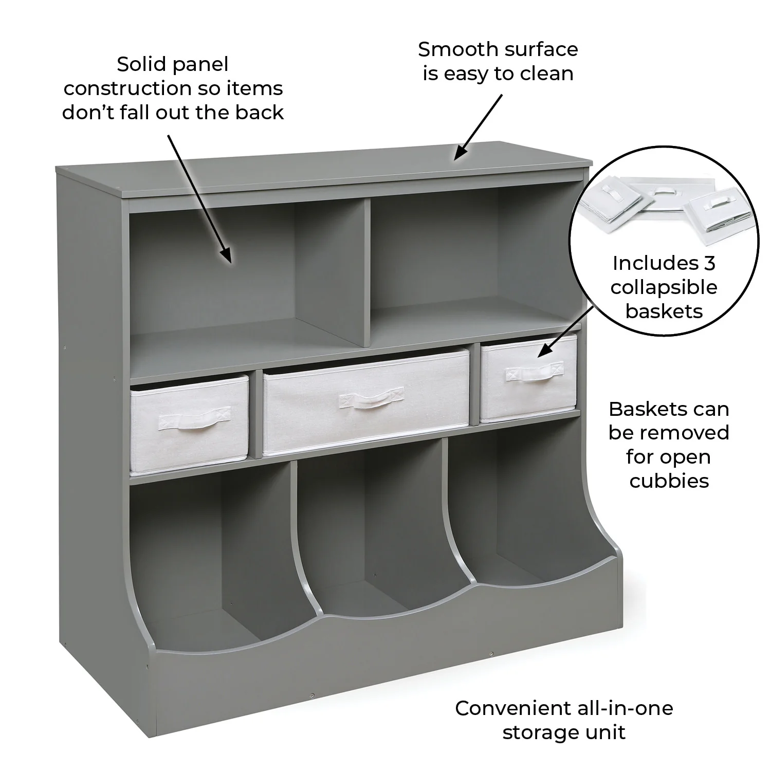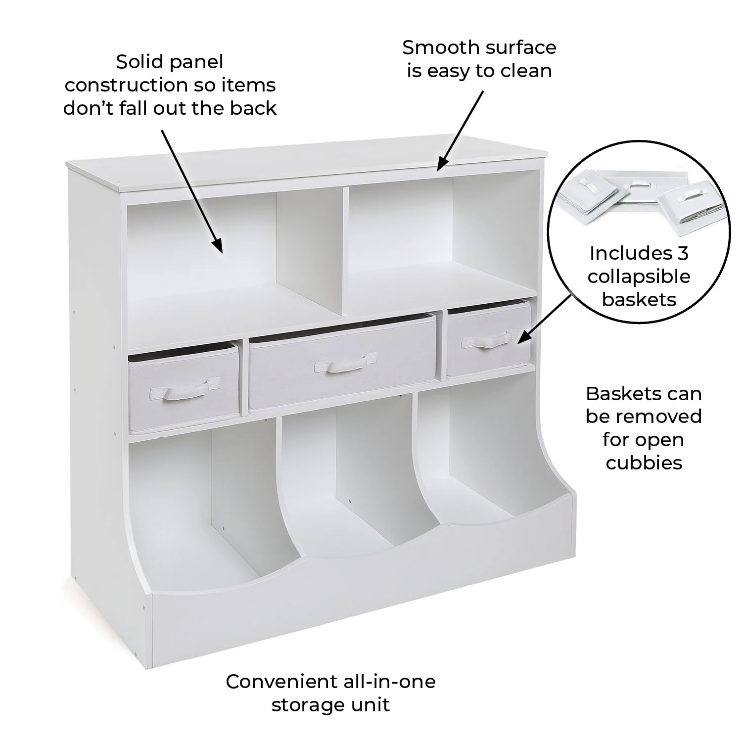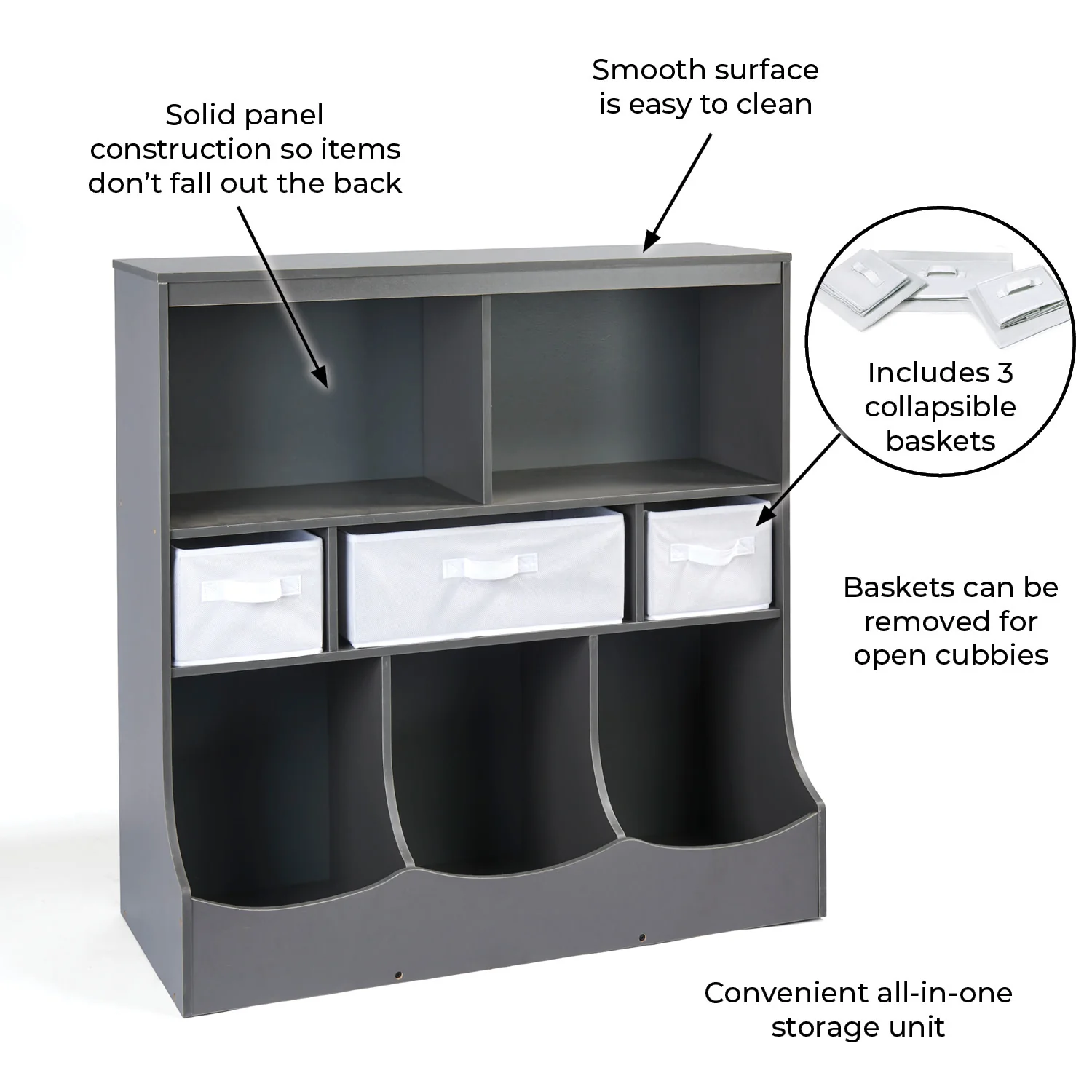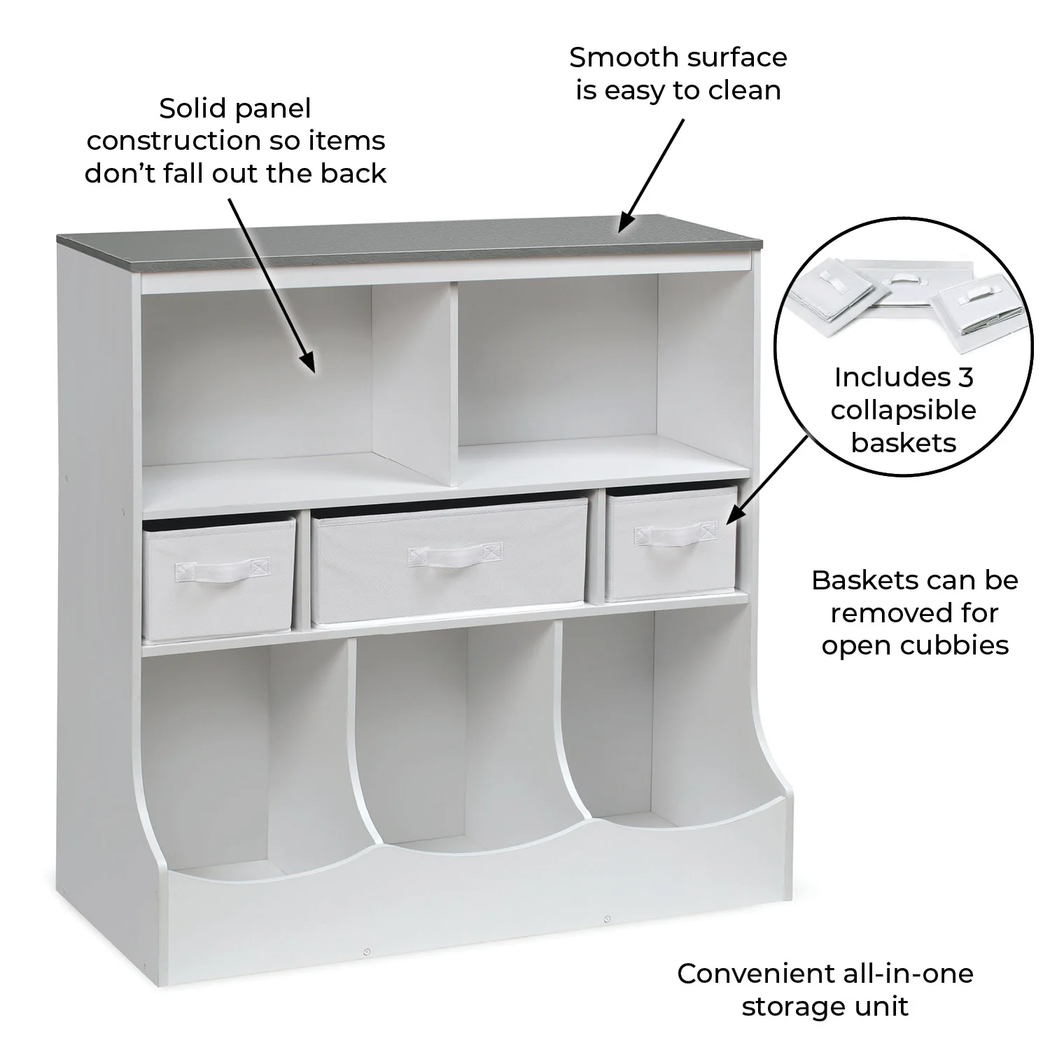 - Features two open shelves, three baskets in two different sizes, and three cubby bins.