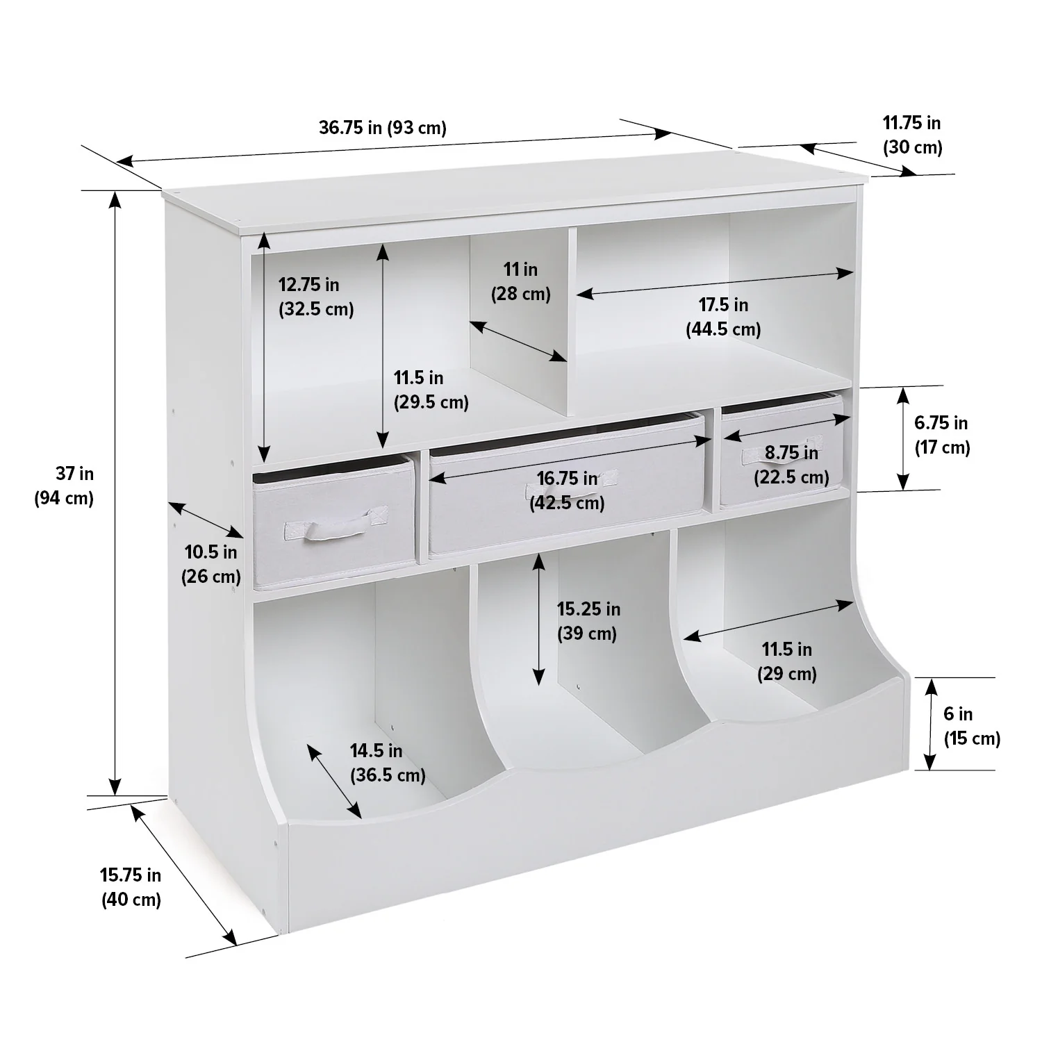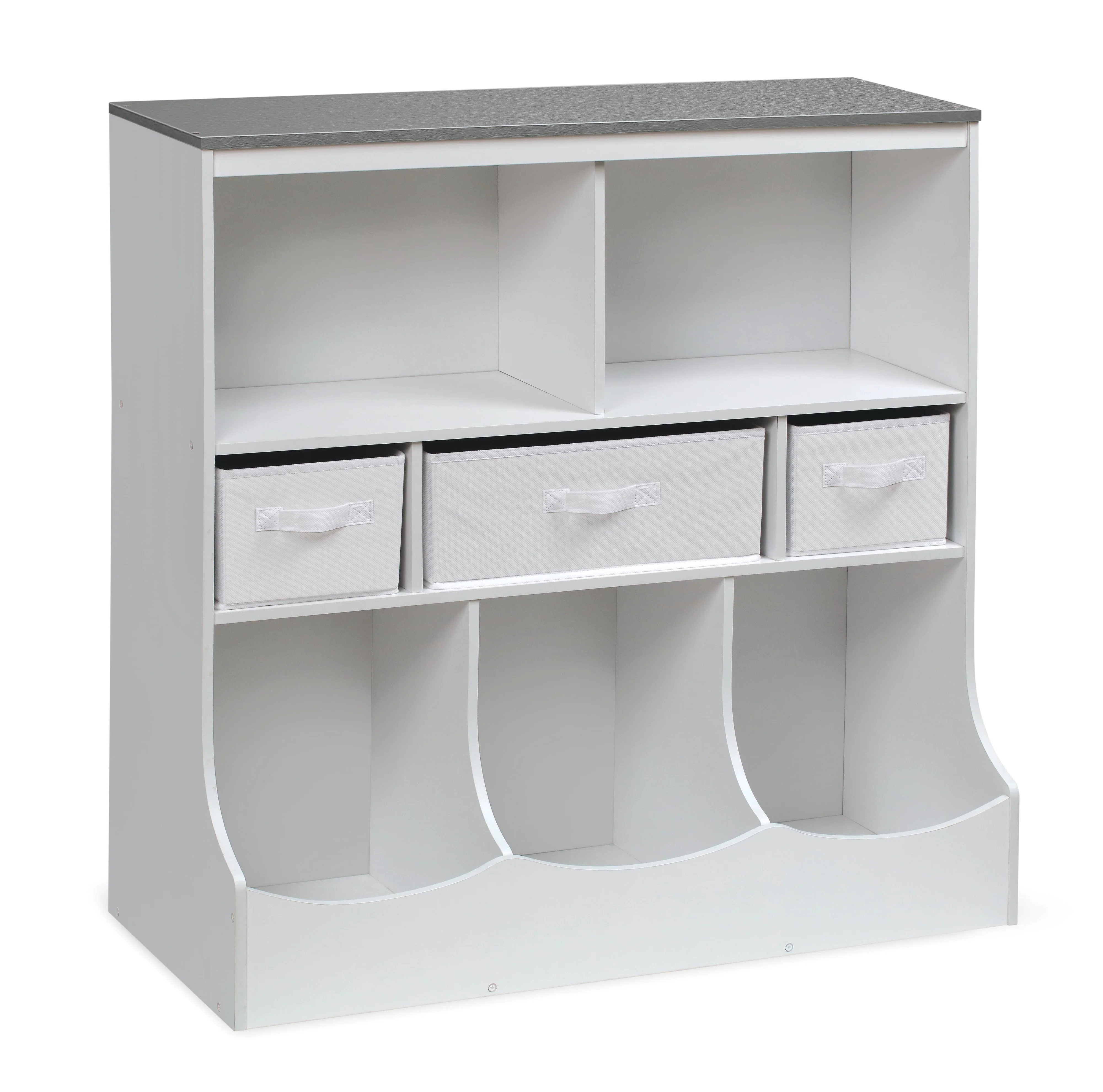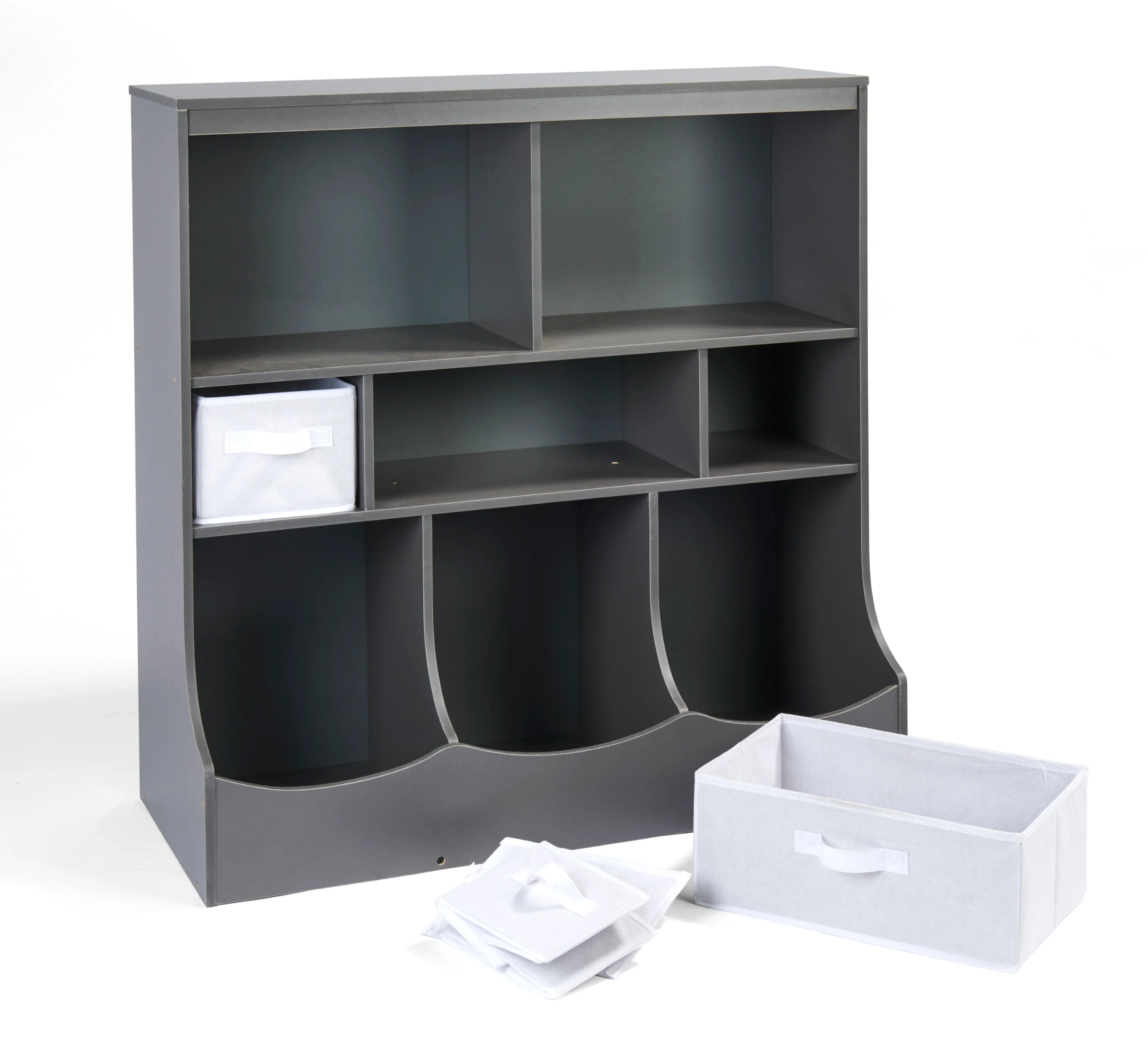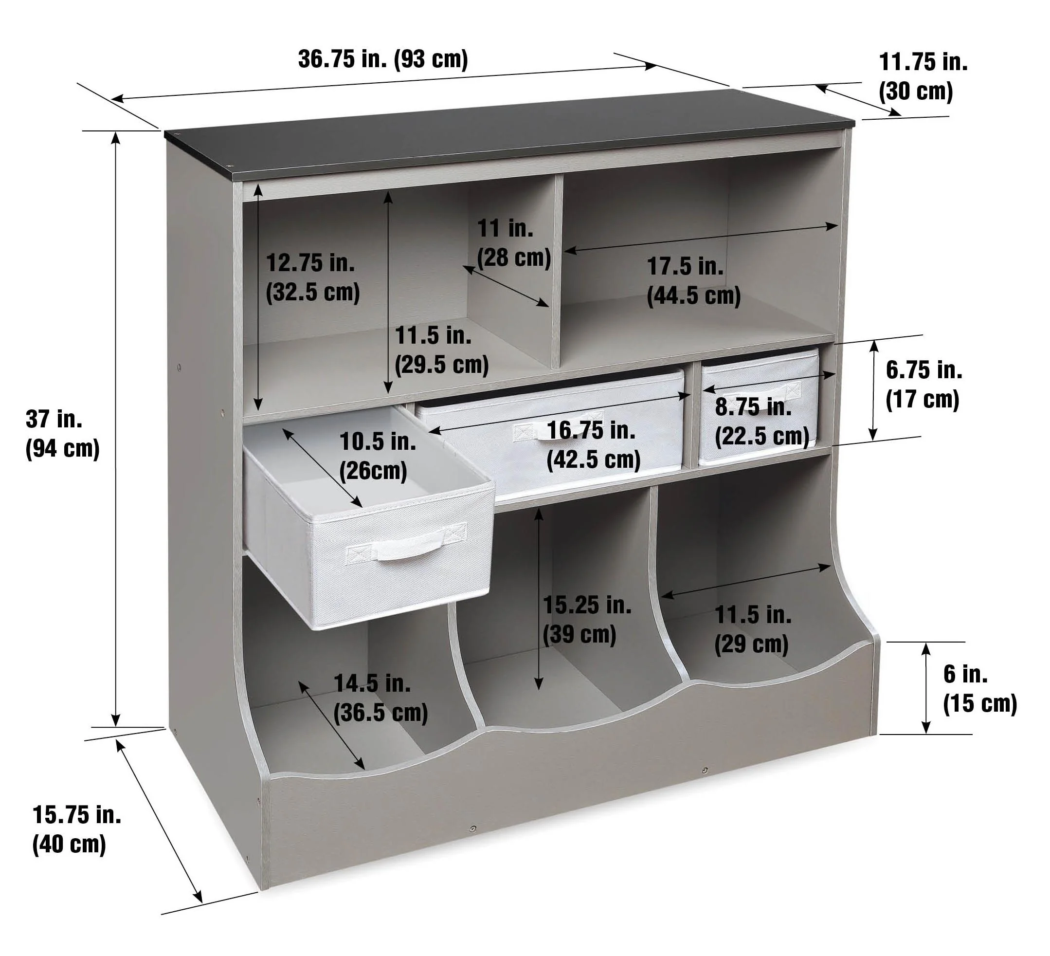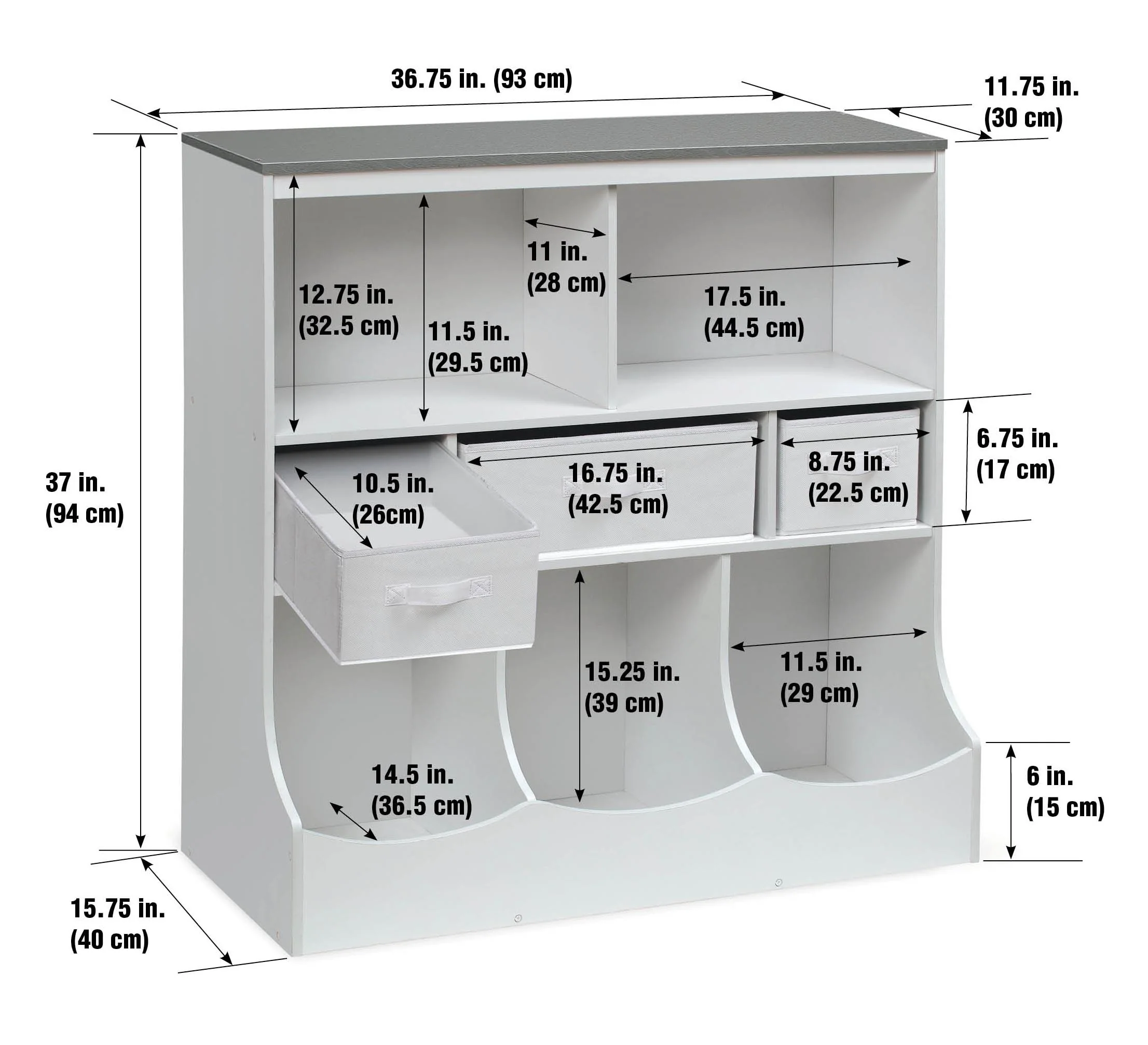 - Features two open shelves, three baskets in two different sizes, and three cubby bins.