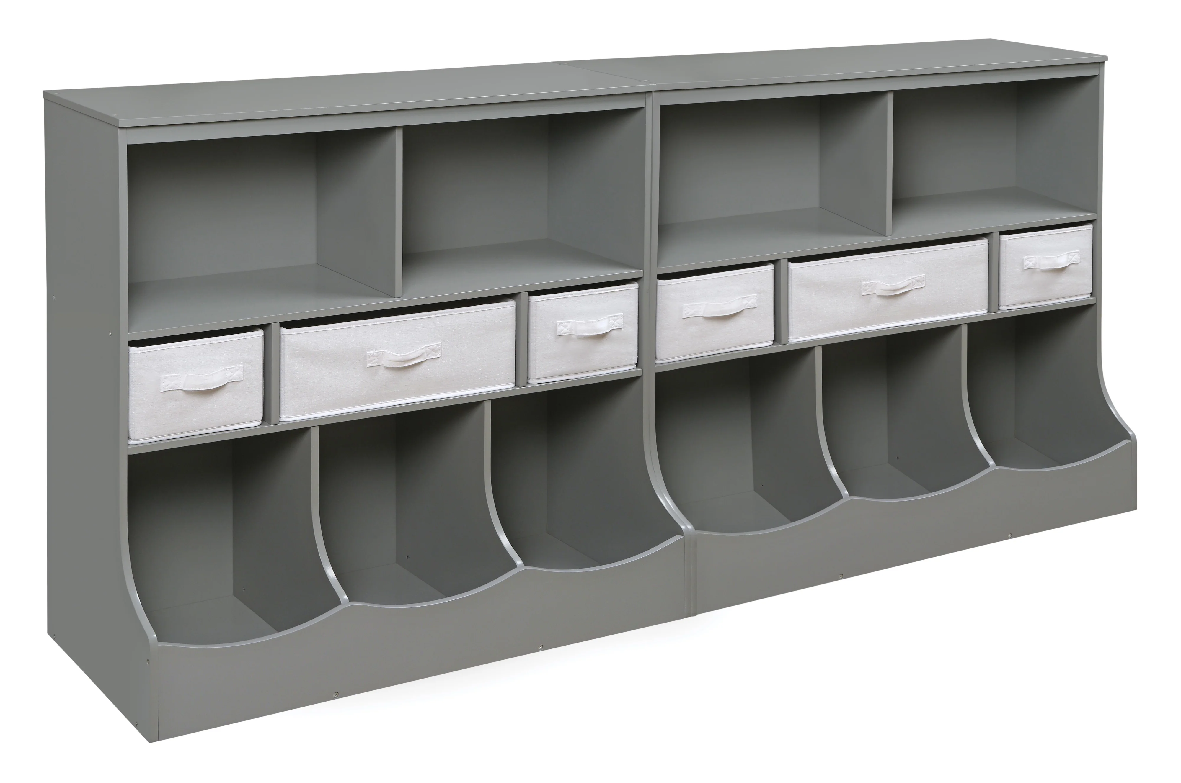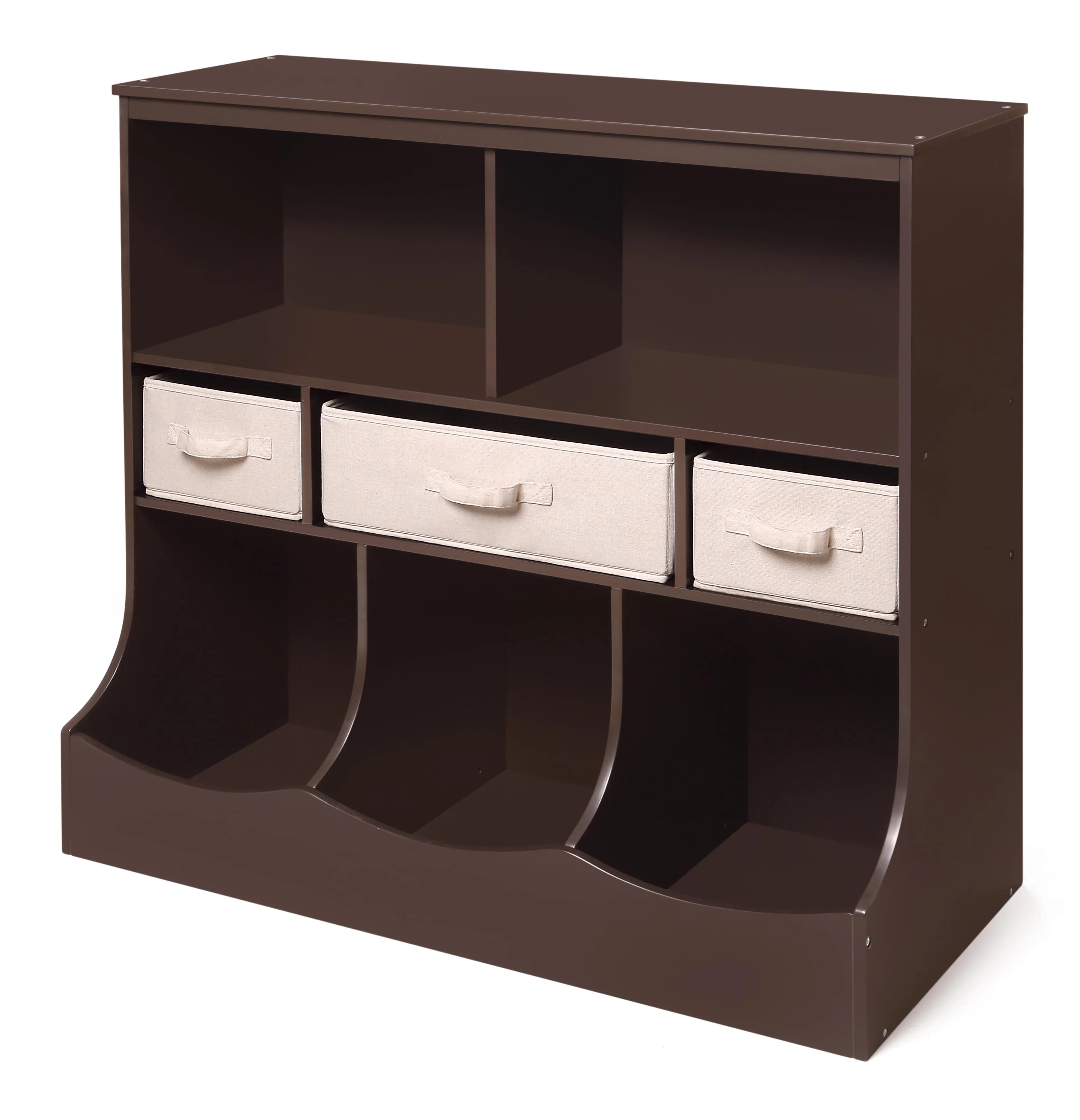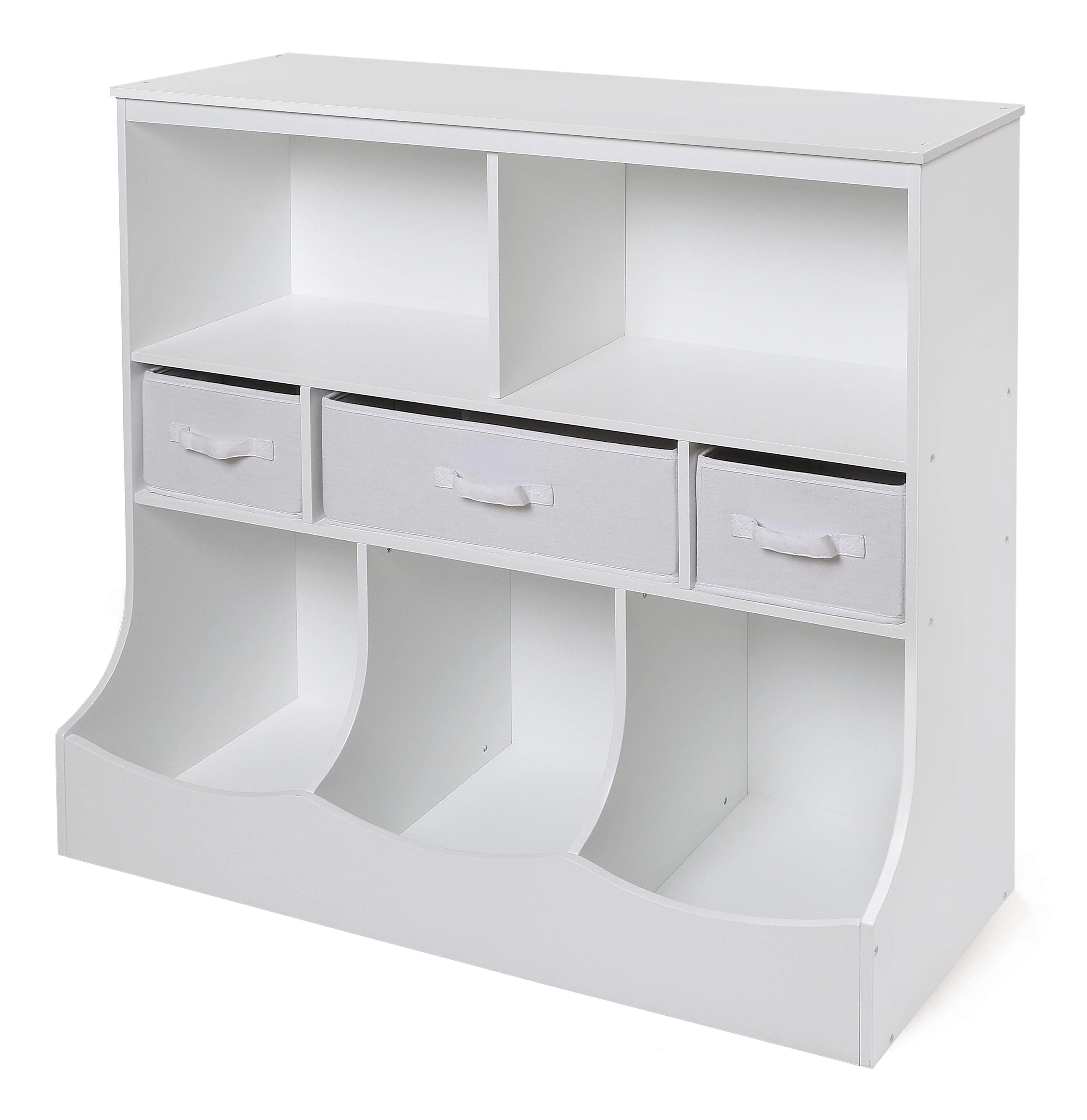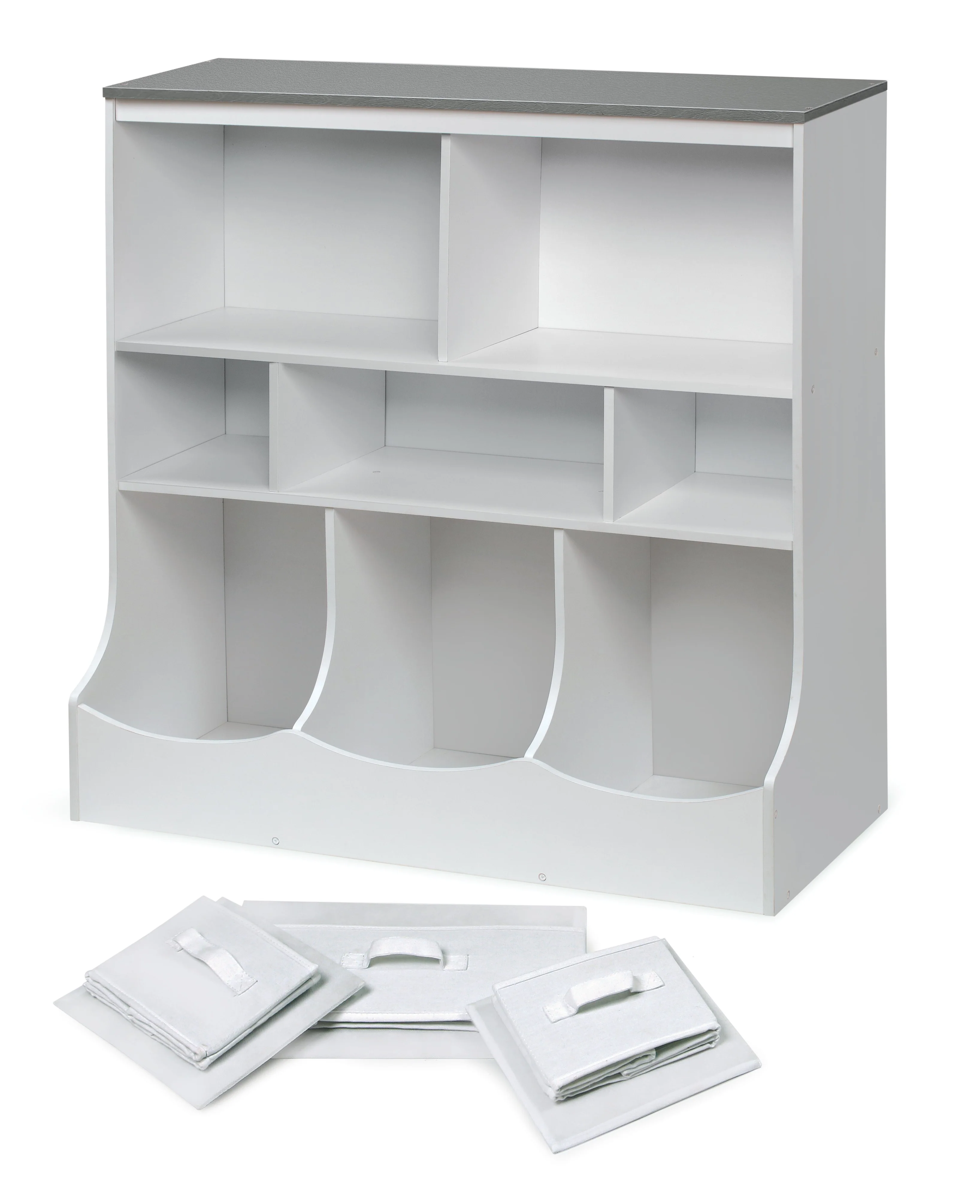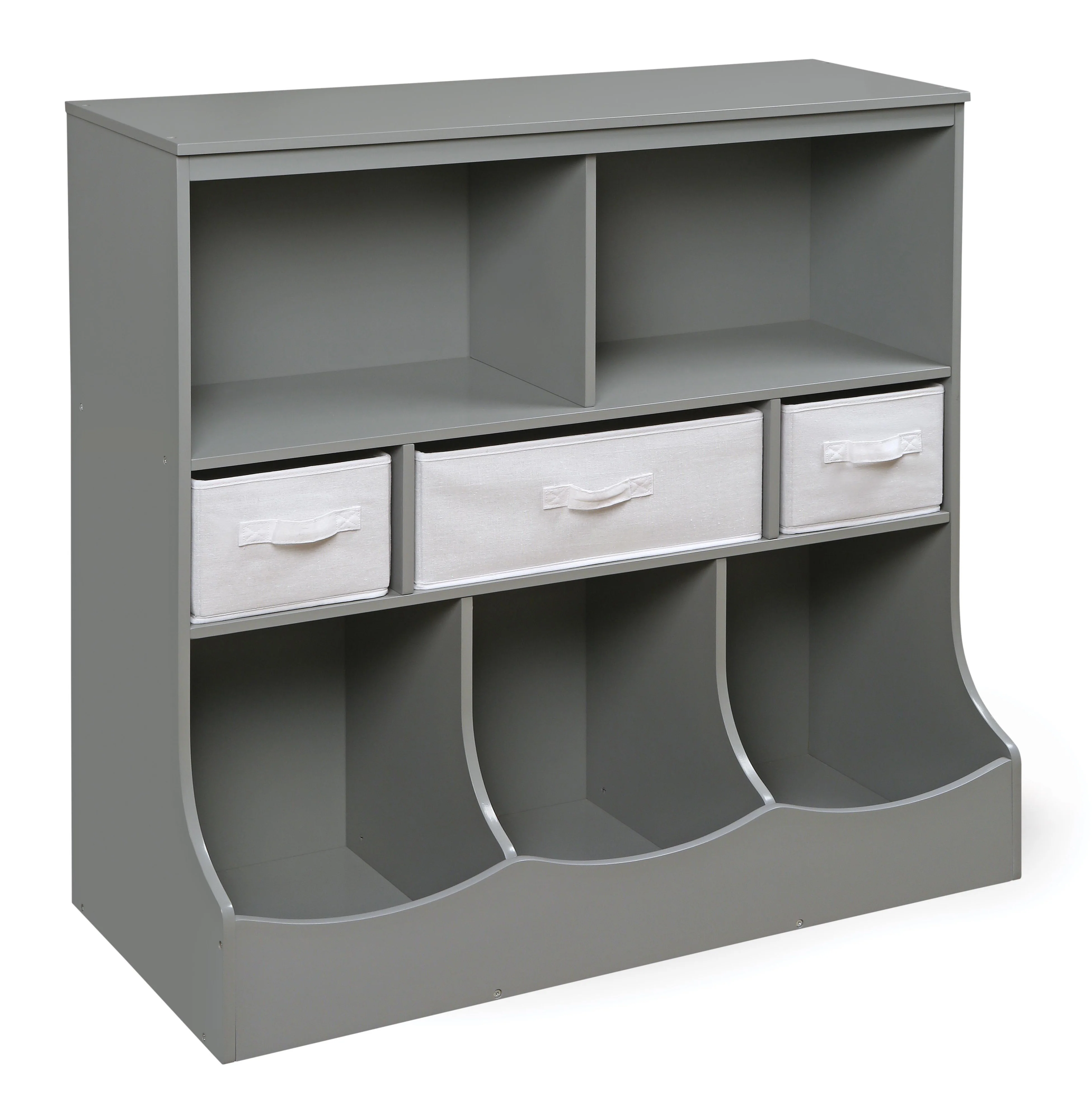 - Features two open shelves, three baskets in two different sizes, and three cubby bins.