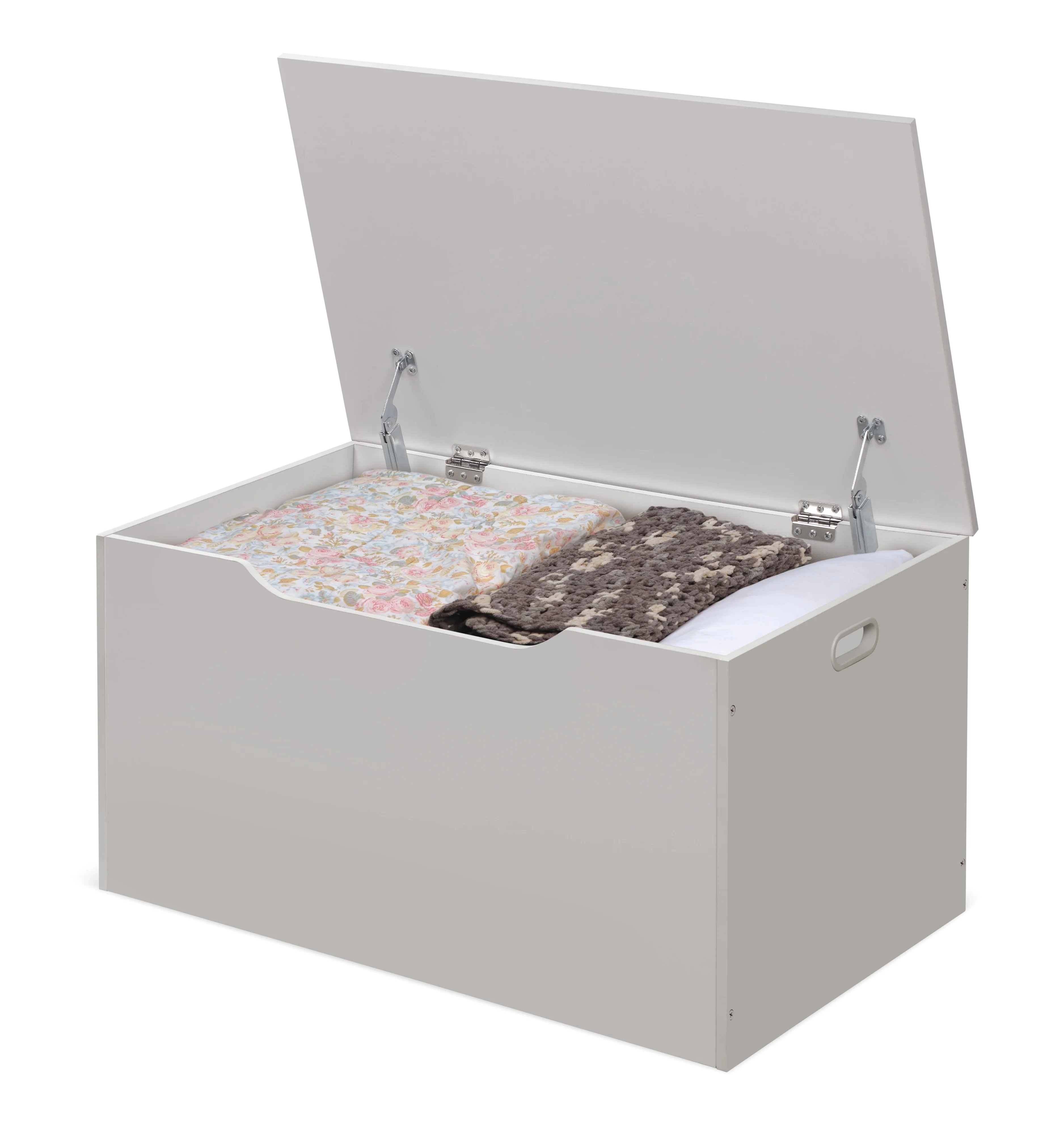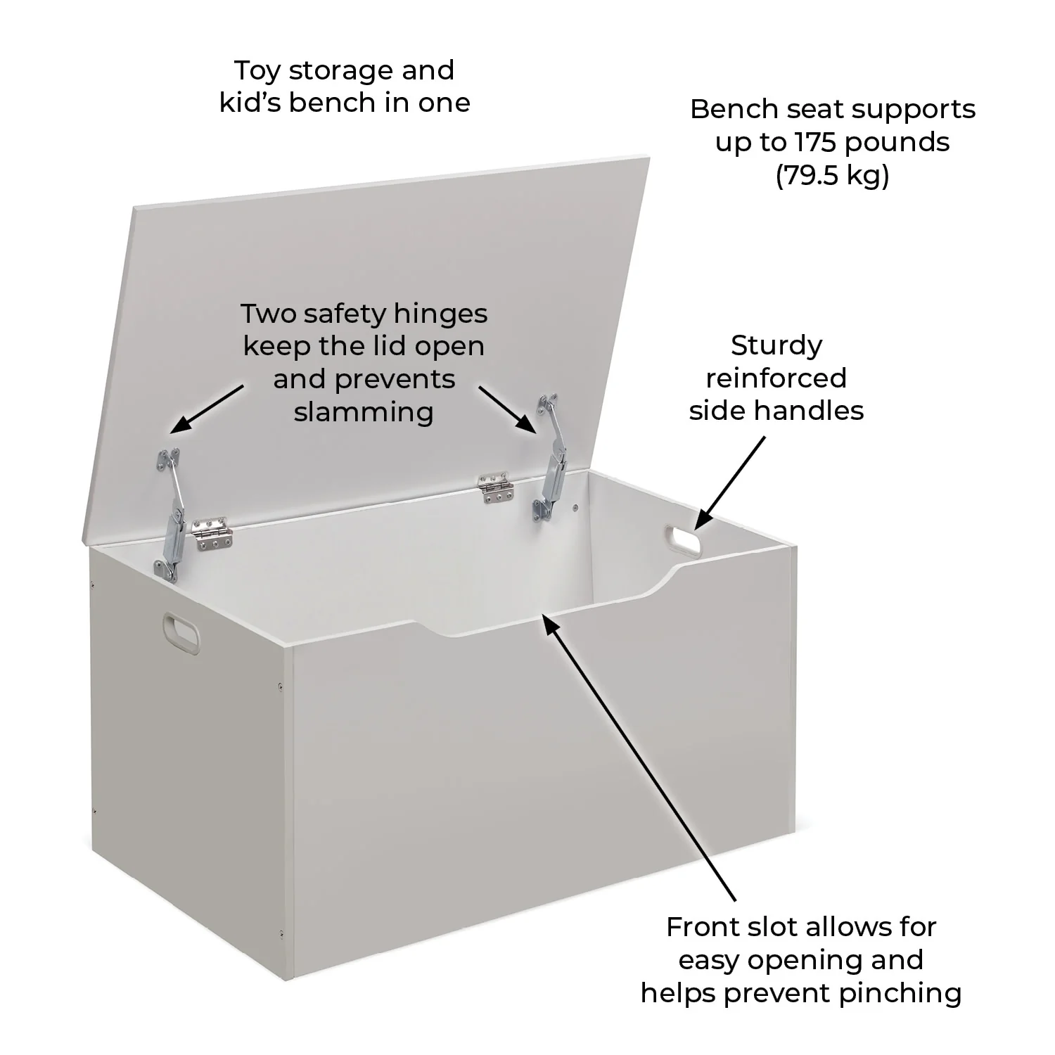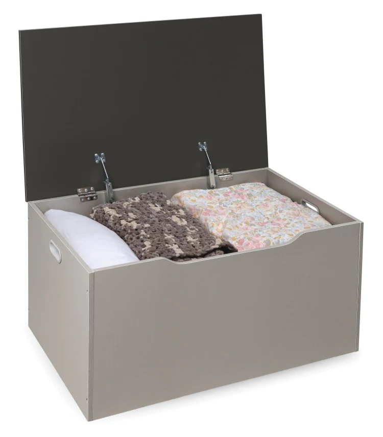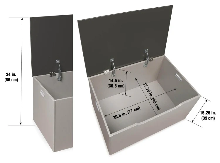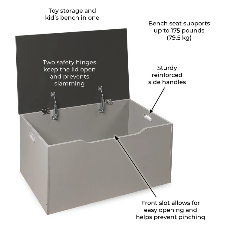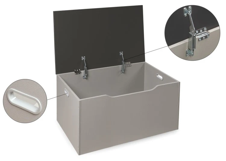 - Quality hardware with two safety support hinges that hold the lid open, preventing slamming, finger crushing, or pinching.