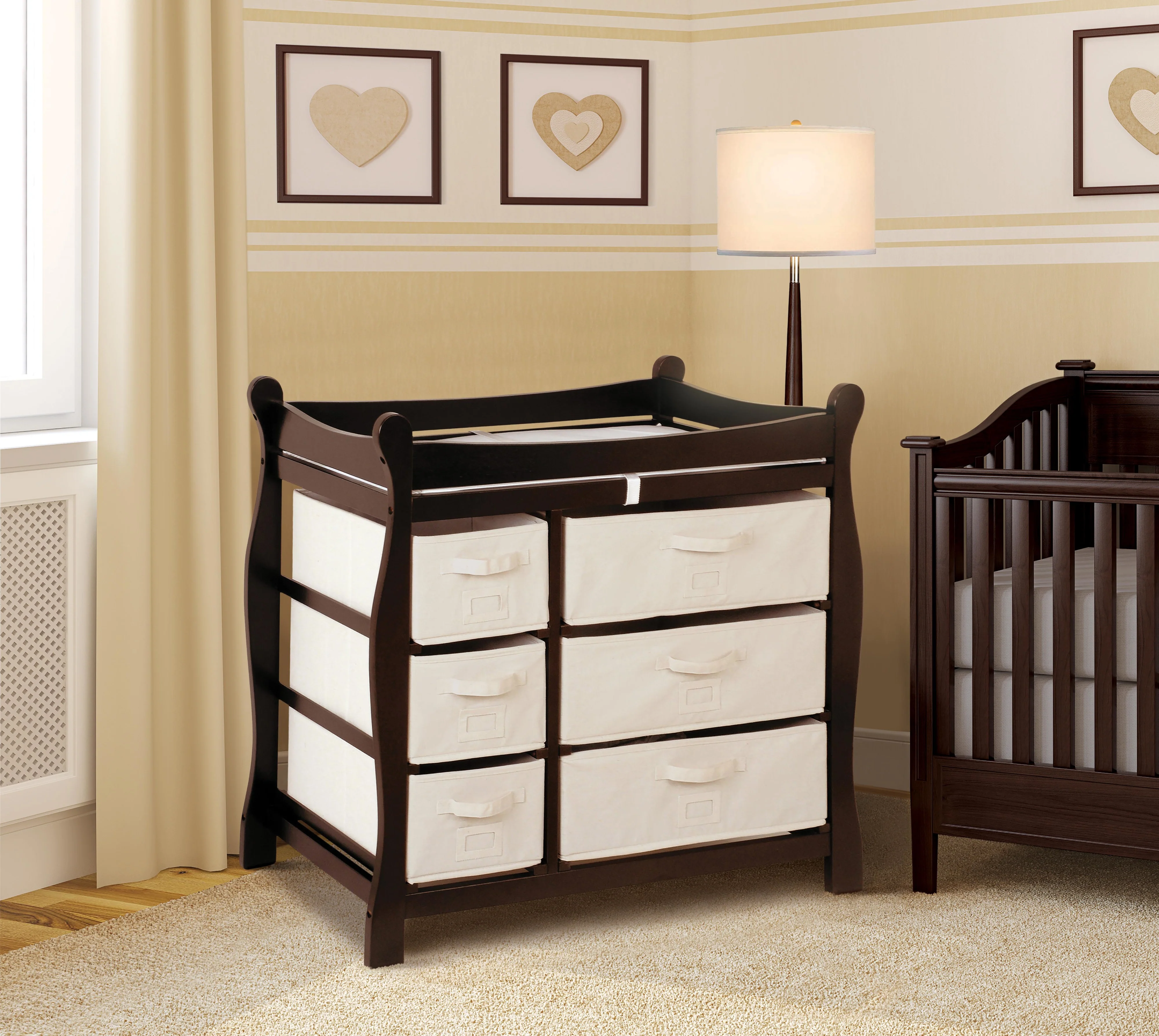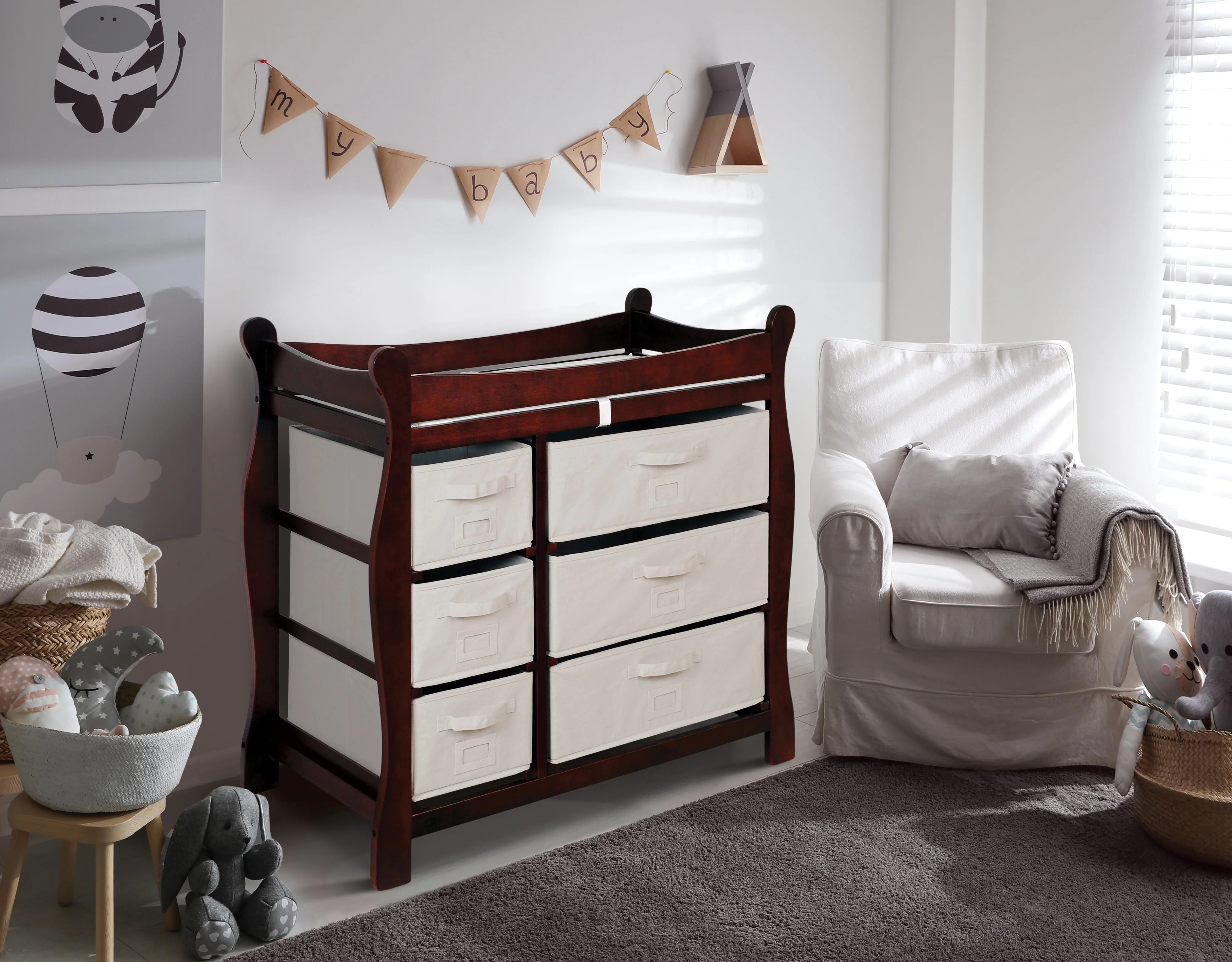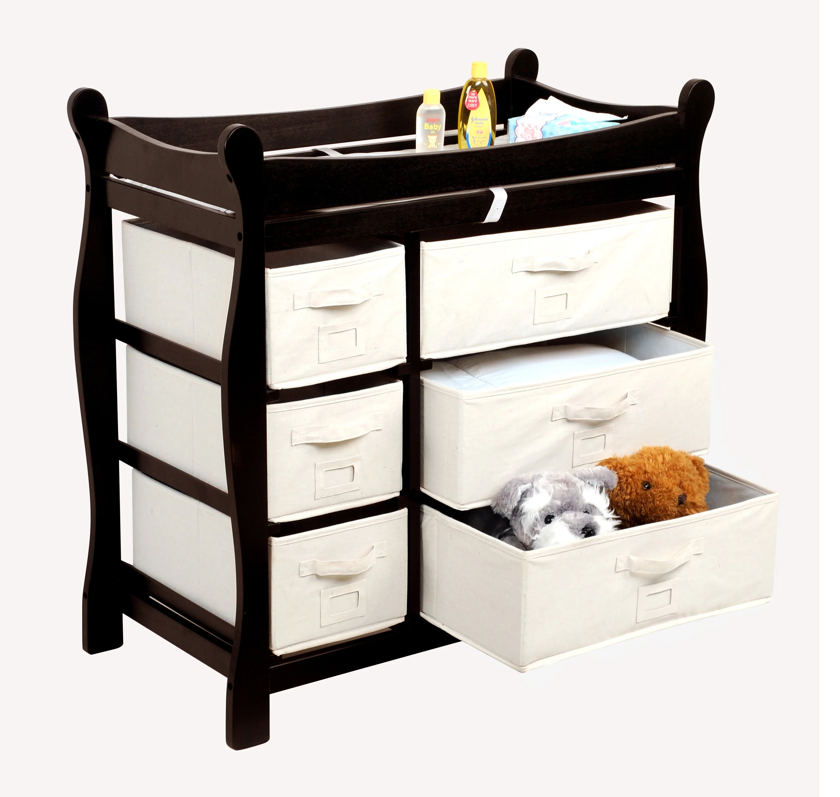 • Badger Basket’s handsome Sleigh Style Baby Changing Table with Six Baskets has abundant storage to organize everything necessary for frequent diaper and wardrobe changes.