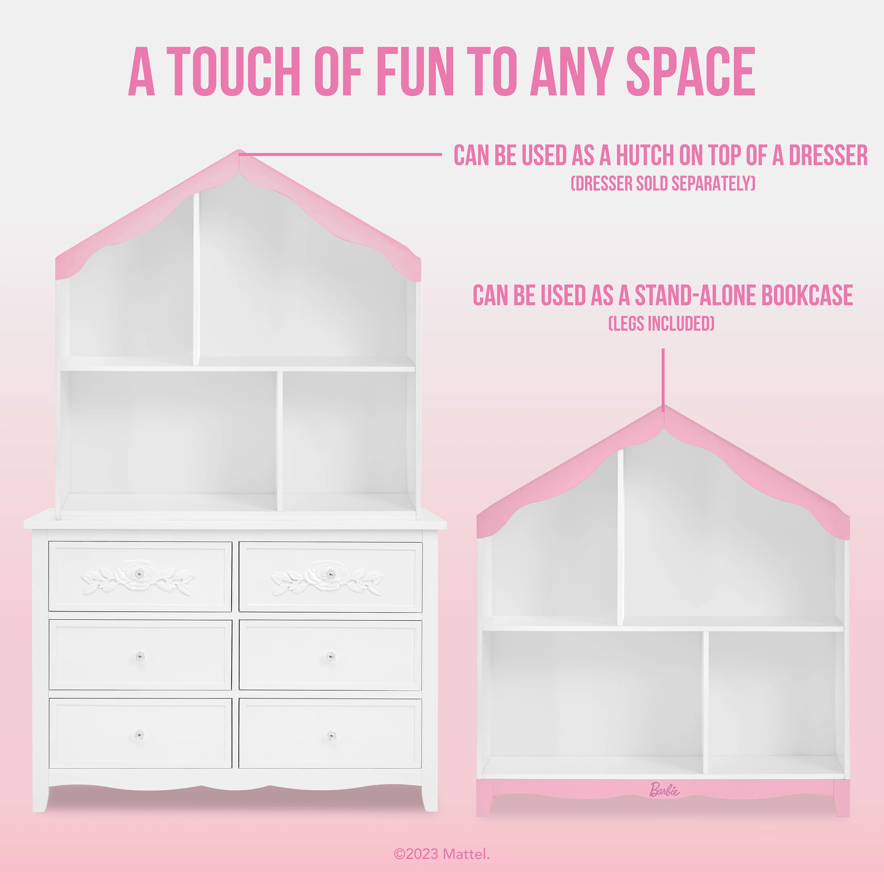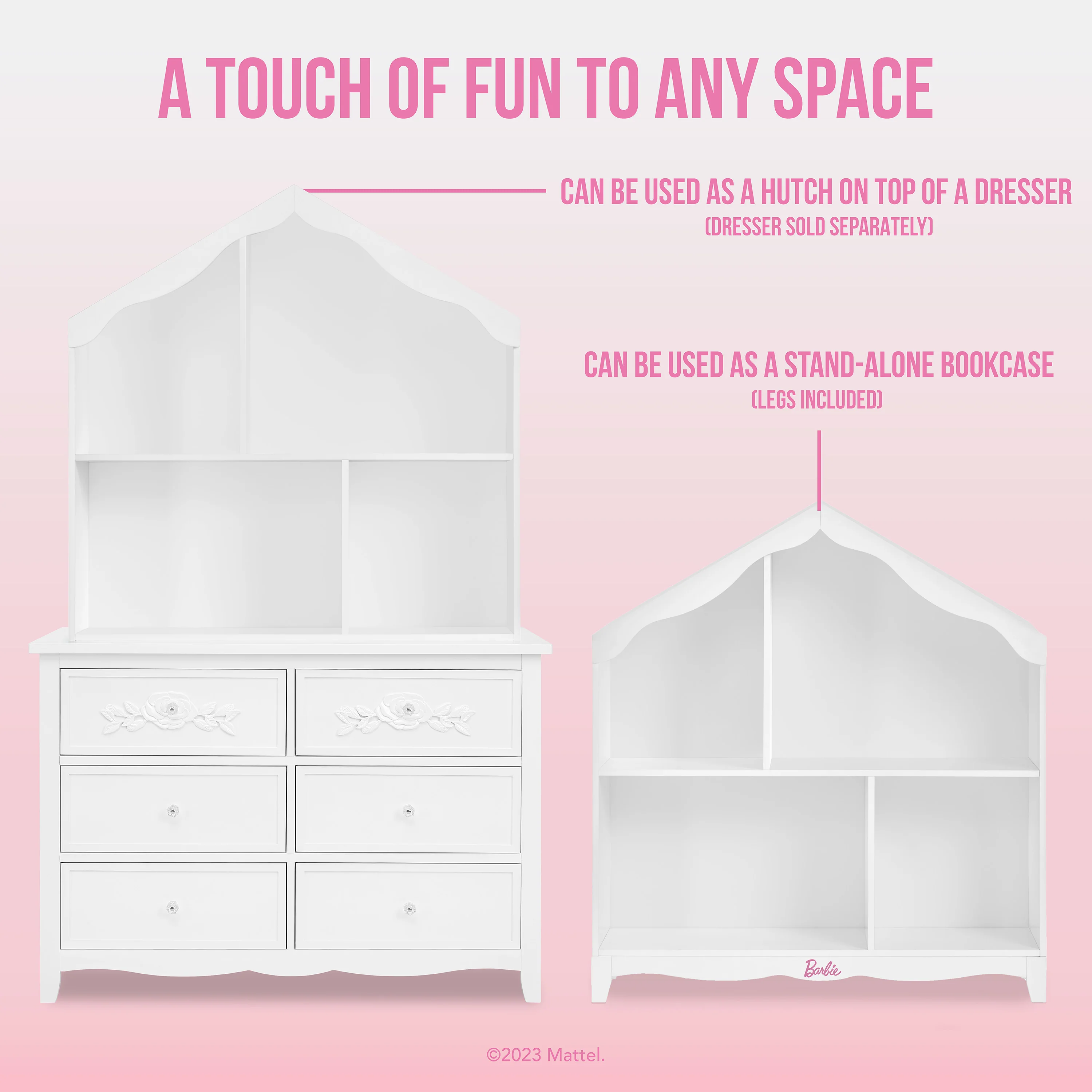 A must-have for every little dreamer's bedroom - the place where all the sparkle happens! It’s time to make your dream space a reality, with the Barbie�?Evolur Rose Hutch/Bookcase, where storage meets whimsy in a delightful display. Artfully crafted with a unique Barbie design, this piece inspires imagination in your little one during playtime & storytime. With 4 spacious shelves to stack everything from dolls and toys, to books & keepsakes, this versatile hutch/bookcase invites the “child decorator�?to emerge! Add the Barbie Evolur Rose Hutch/Bookcase to your child’s bedroom, to create a quiet, comfortable space where they lose themselves in the pages of a good book, and let their dreams grow! The Barbie Evolur Rose Hutch/Bookcase adds a touch of fun to any space as it comes in both a classic white finish and a pleasing pink & white finish.