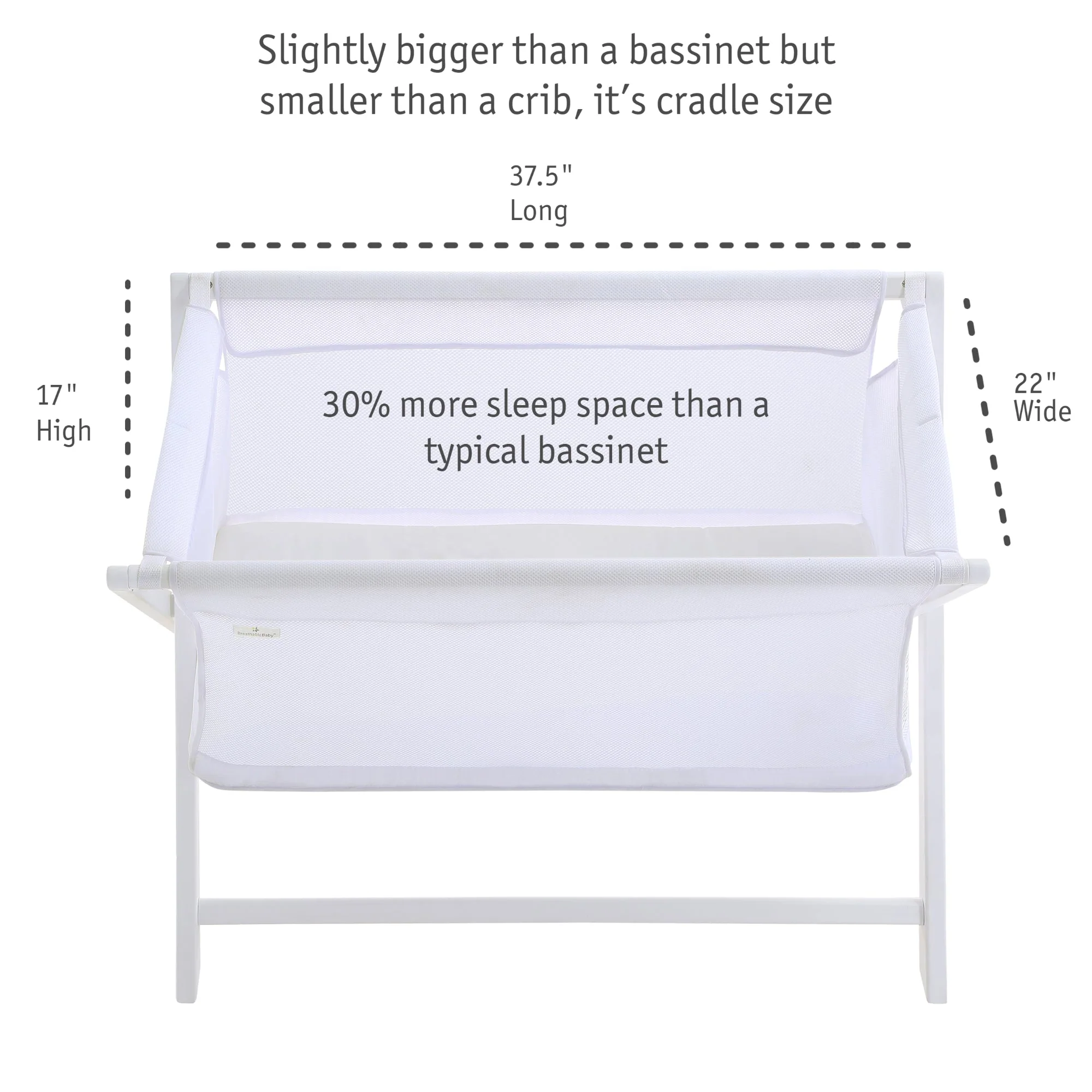 The Breathable™ Mesh Portable Sleeper combines the comfort and convenience of a traditional bassinet with the peace of mind that‘s possible only with our patented breathable mesh. Slightly bigger than a bassinet but smaller than a crib — it’s cradle size. Lightweight and portable. Great for keeping baby close while giving them their own dedicated sleep space.