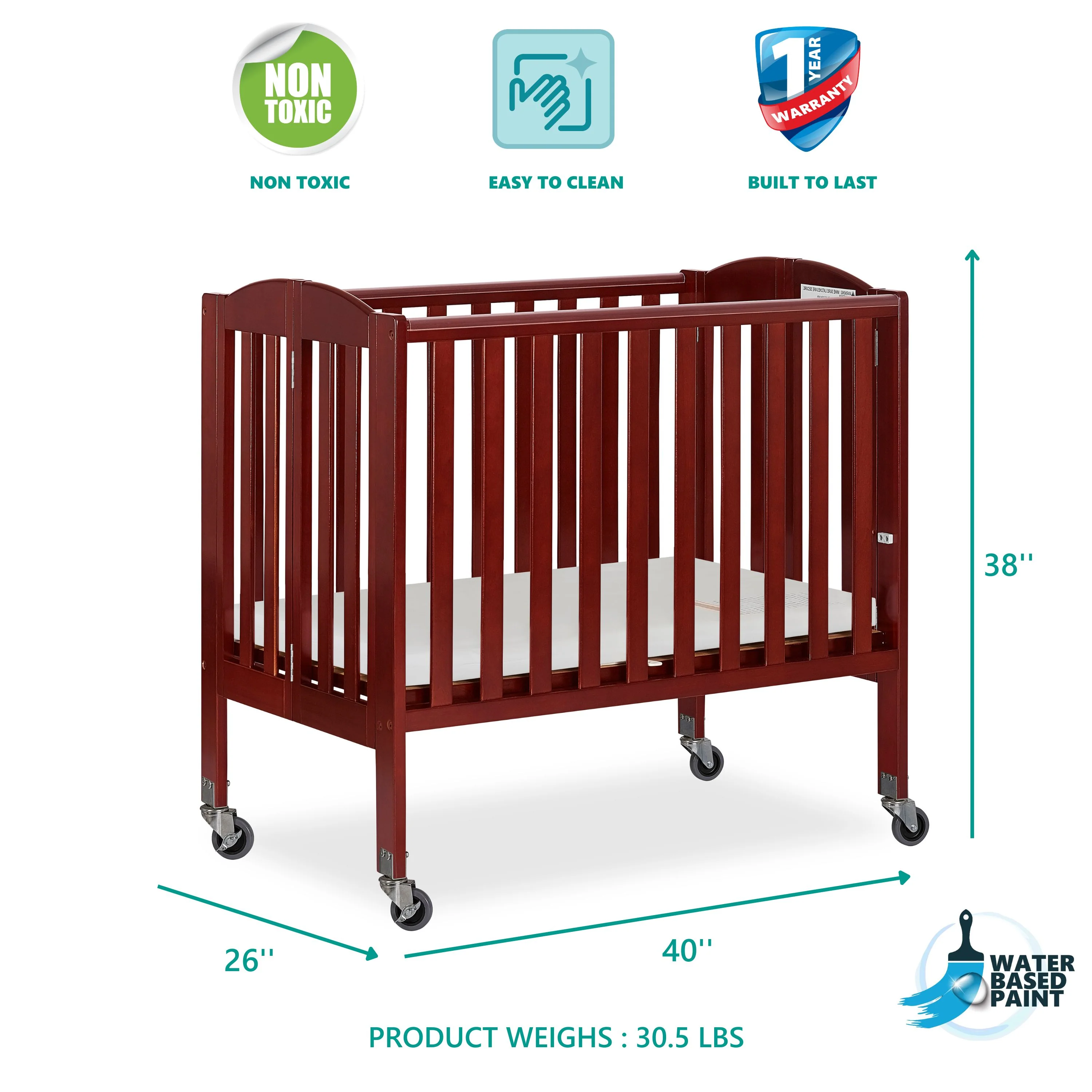 - Crib dimensions are 40L x 26W x 38H, It weighs 30.5 lbs, Don’t expose your furniture to strong sunlight or extreme changes in temperature or moisture which can damage or fade its color