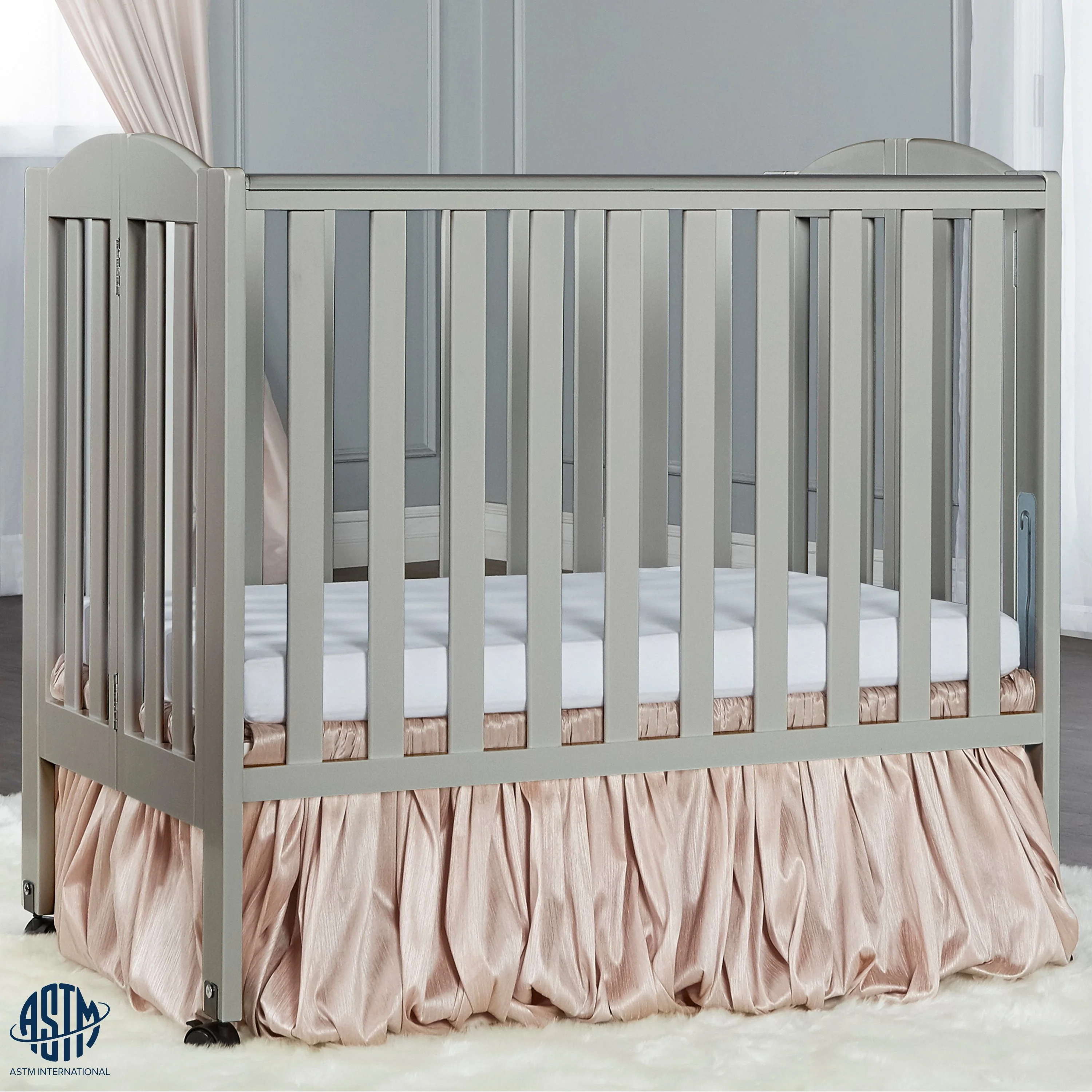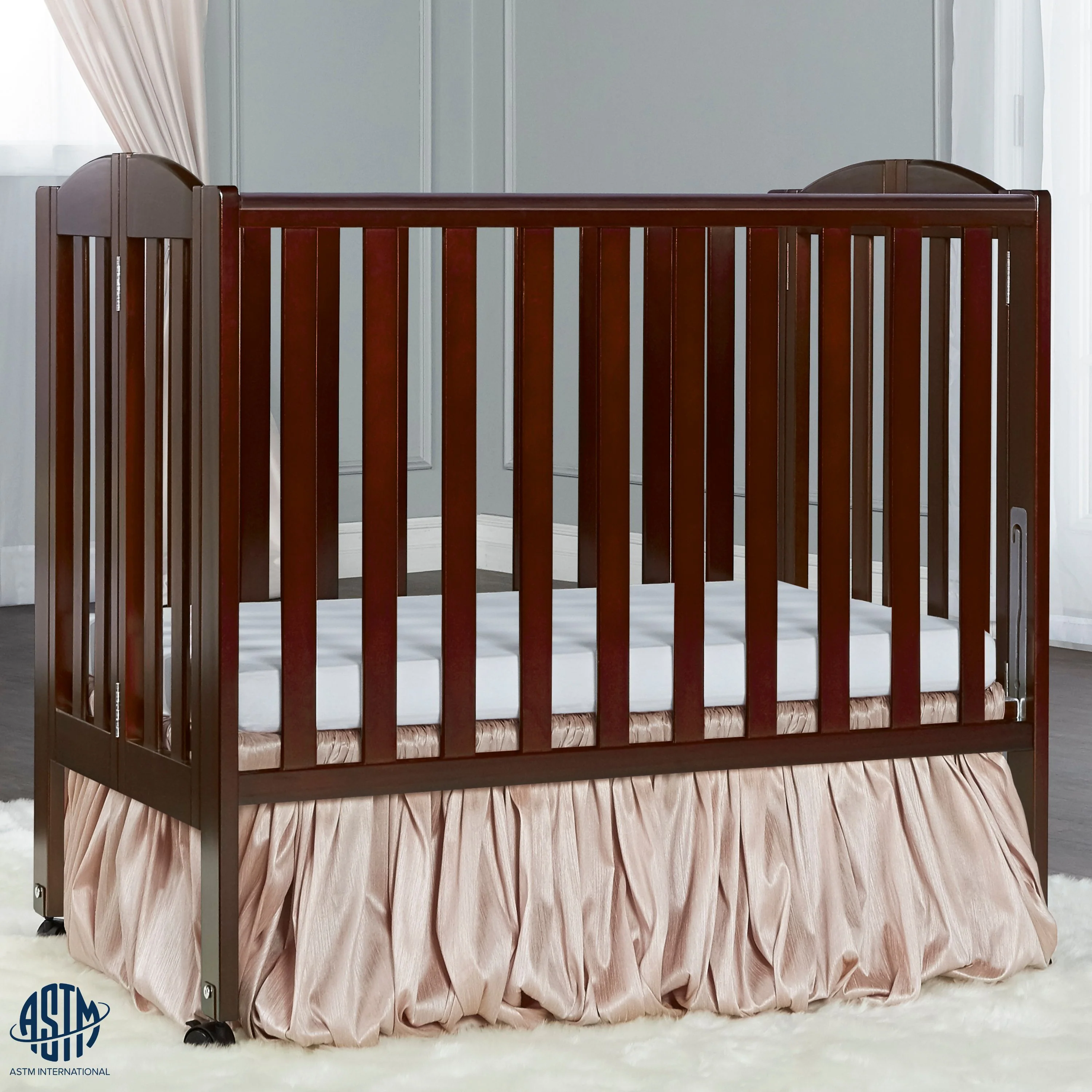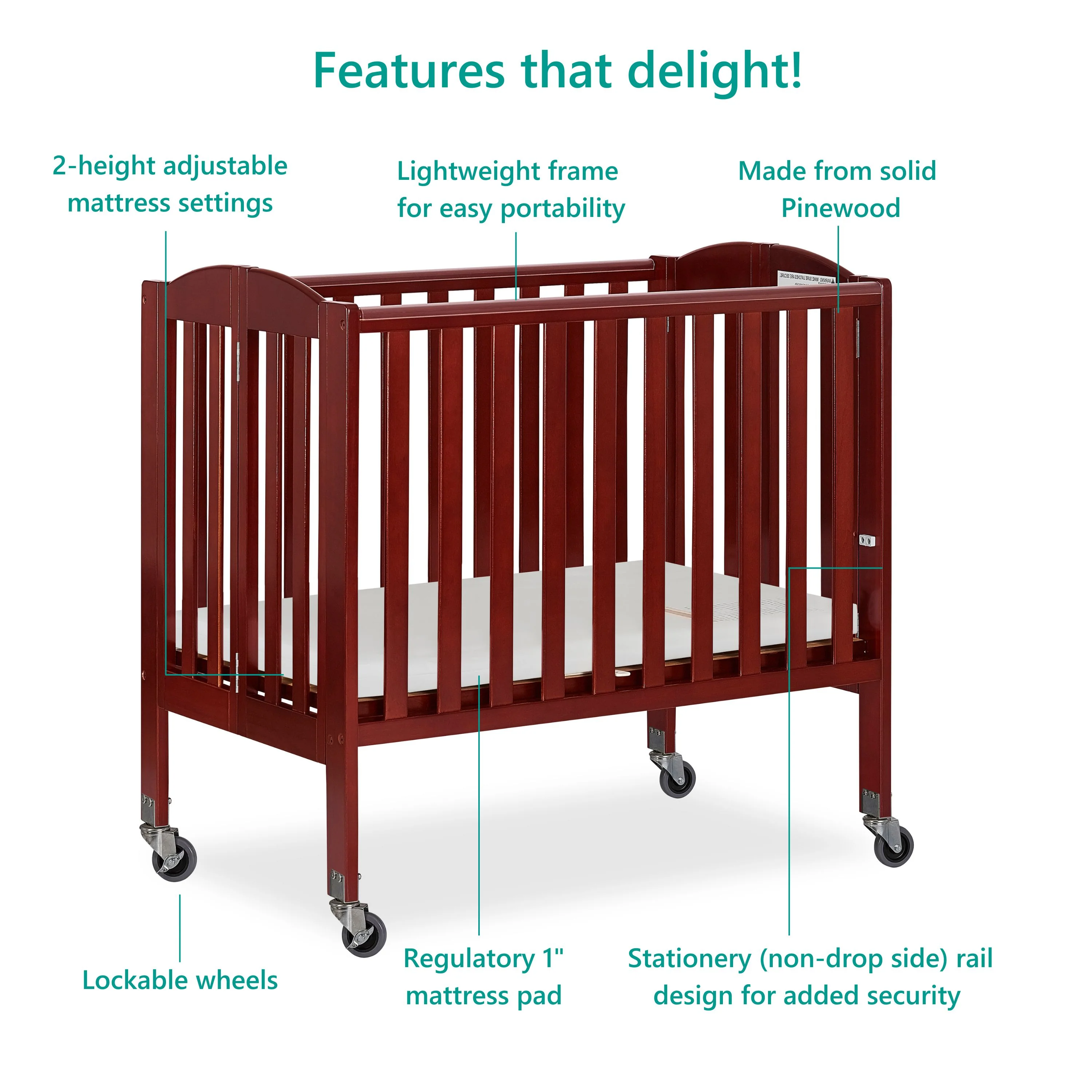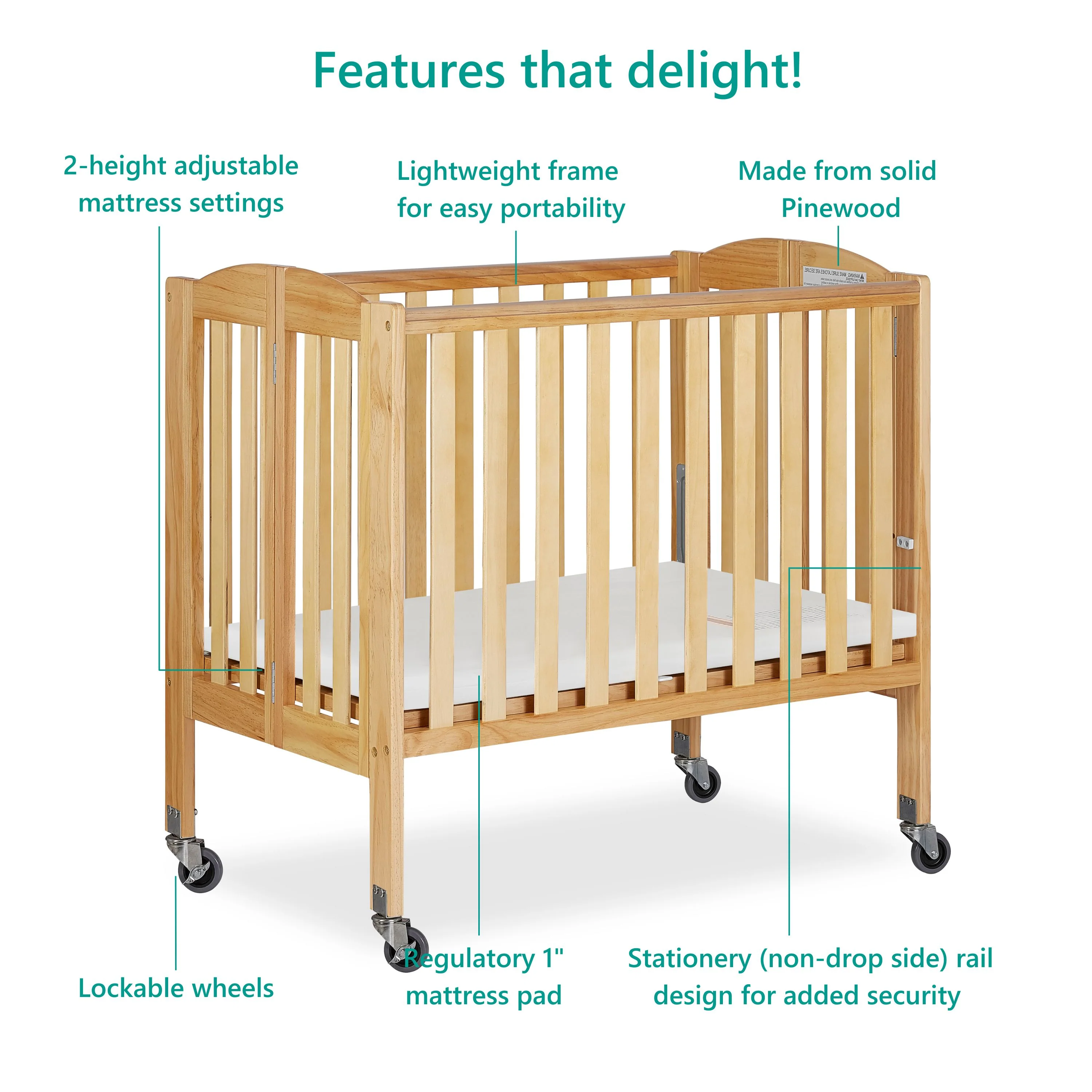 - A mini crib that comes with a two-position mattress support to keep pace with your growing baby