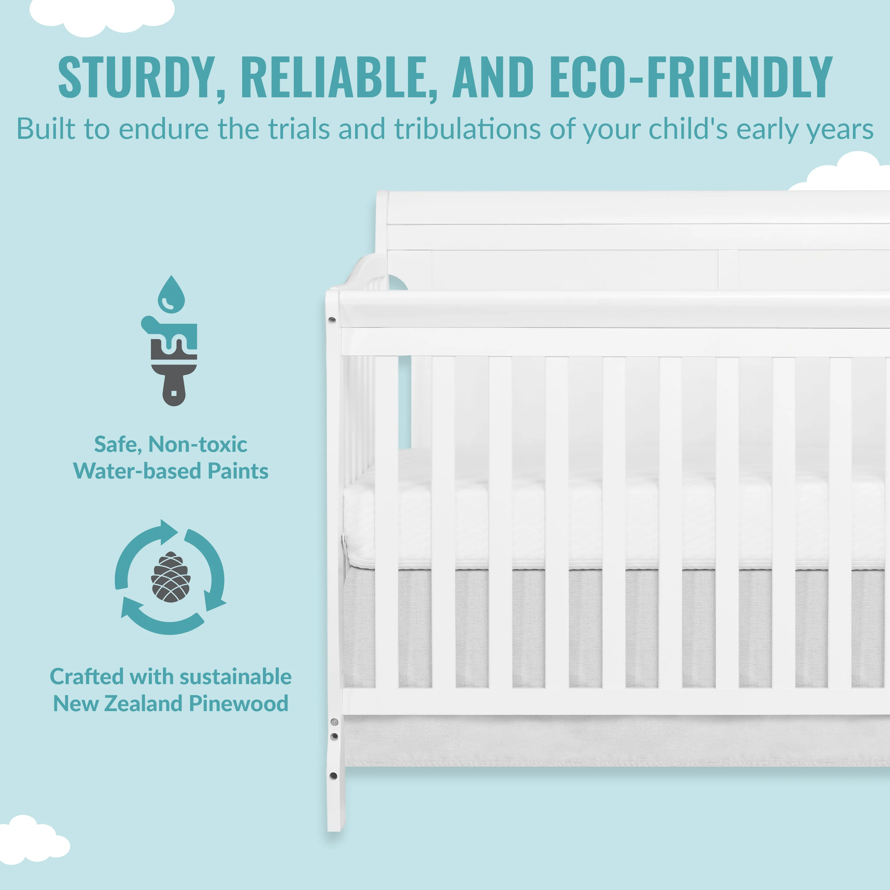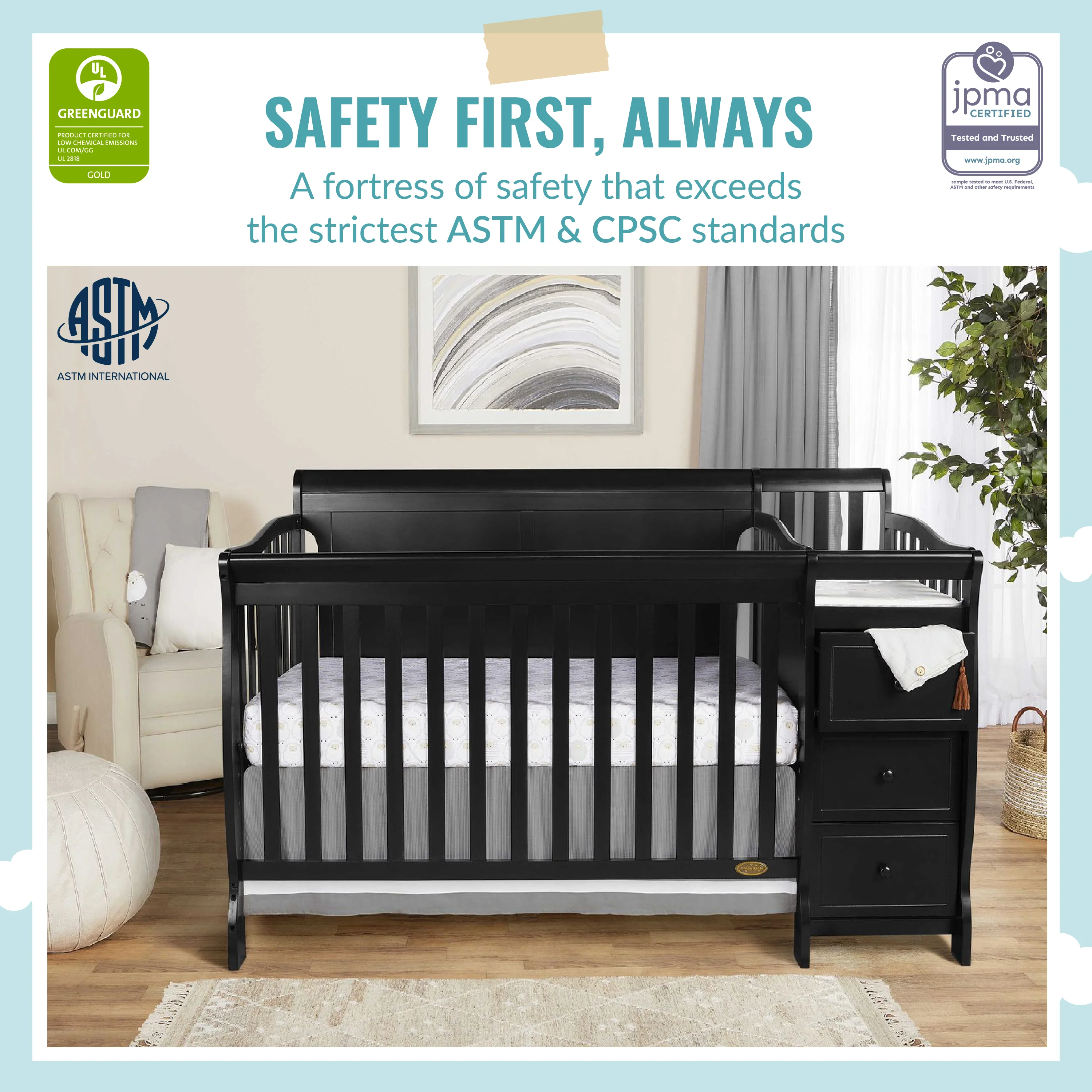 • SAFE AND STURDY: The Brody Full Panel Convertible Crib is JPMA certified, meets/exceeds all ASTM & CPSC standards, and comes with stationary (non-drop side) rails. The detachable changing tray also comes with an easy-release safety bucket.