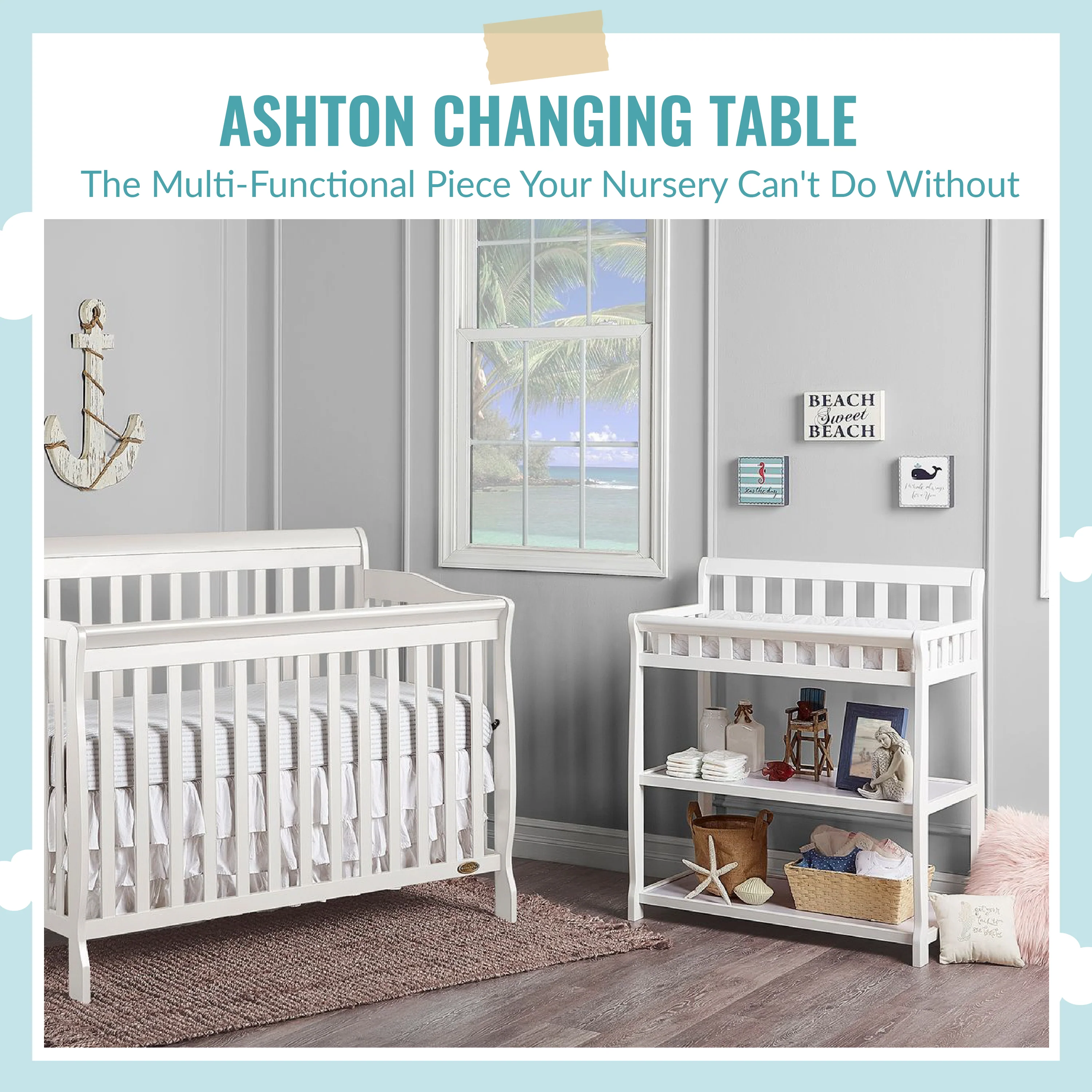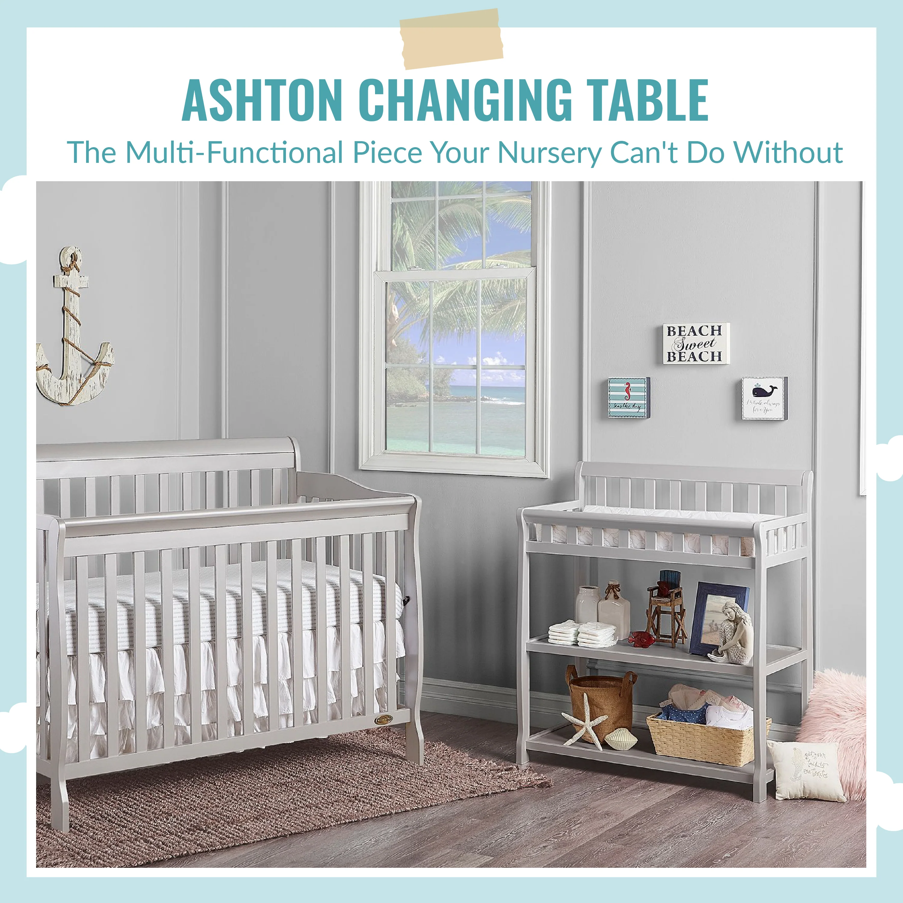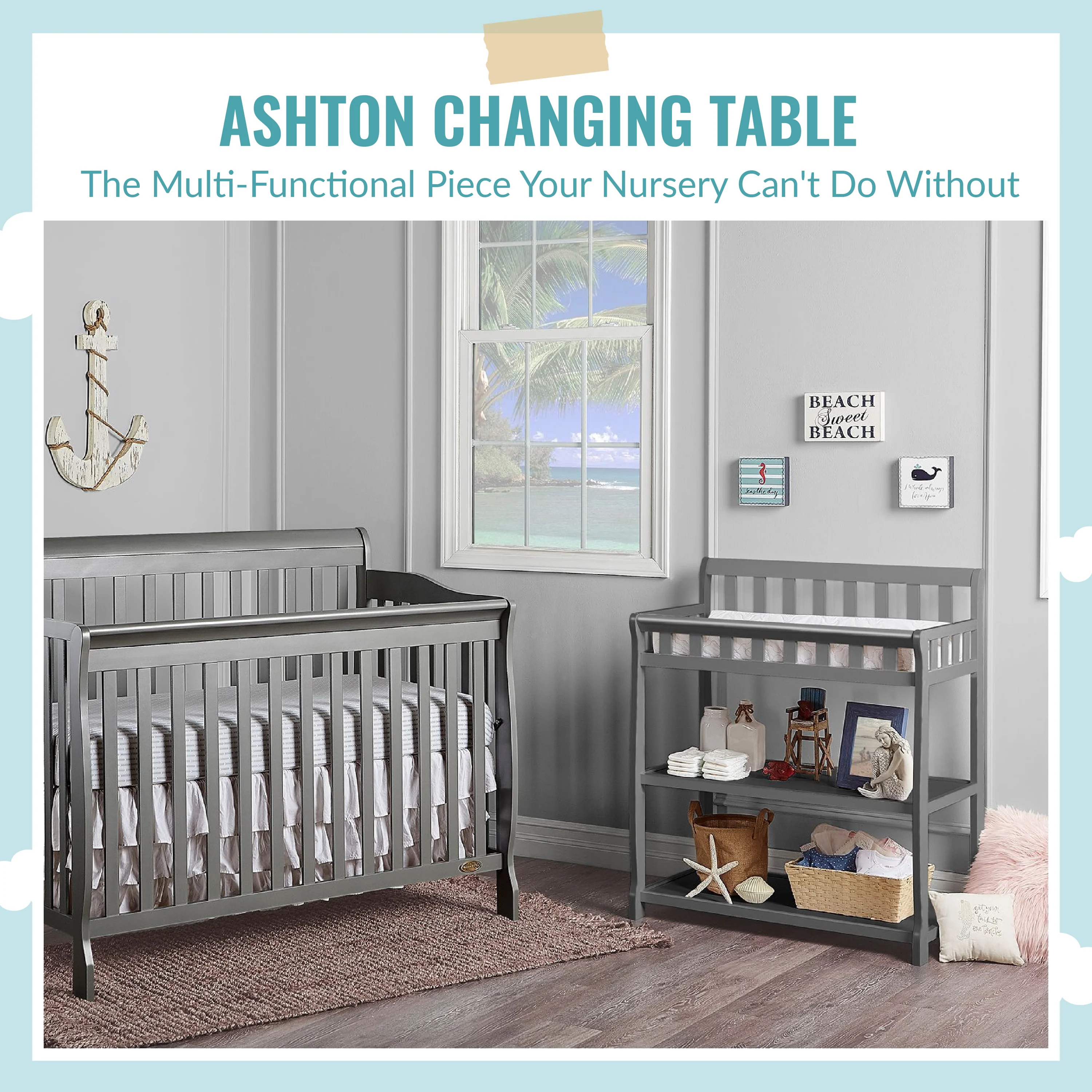 • GREAT STORAGE: The Ashton comes with two easy-to-reach, spacious shelves below the changing table - keep your child’s essentials neatly organized and within easy reach! Product dimensions are 34L x 20W x 40H inches.