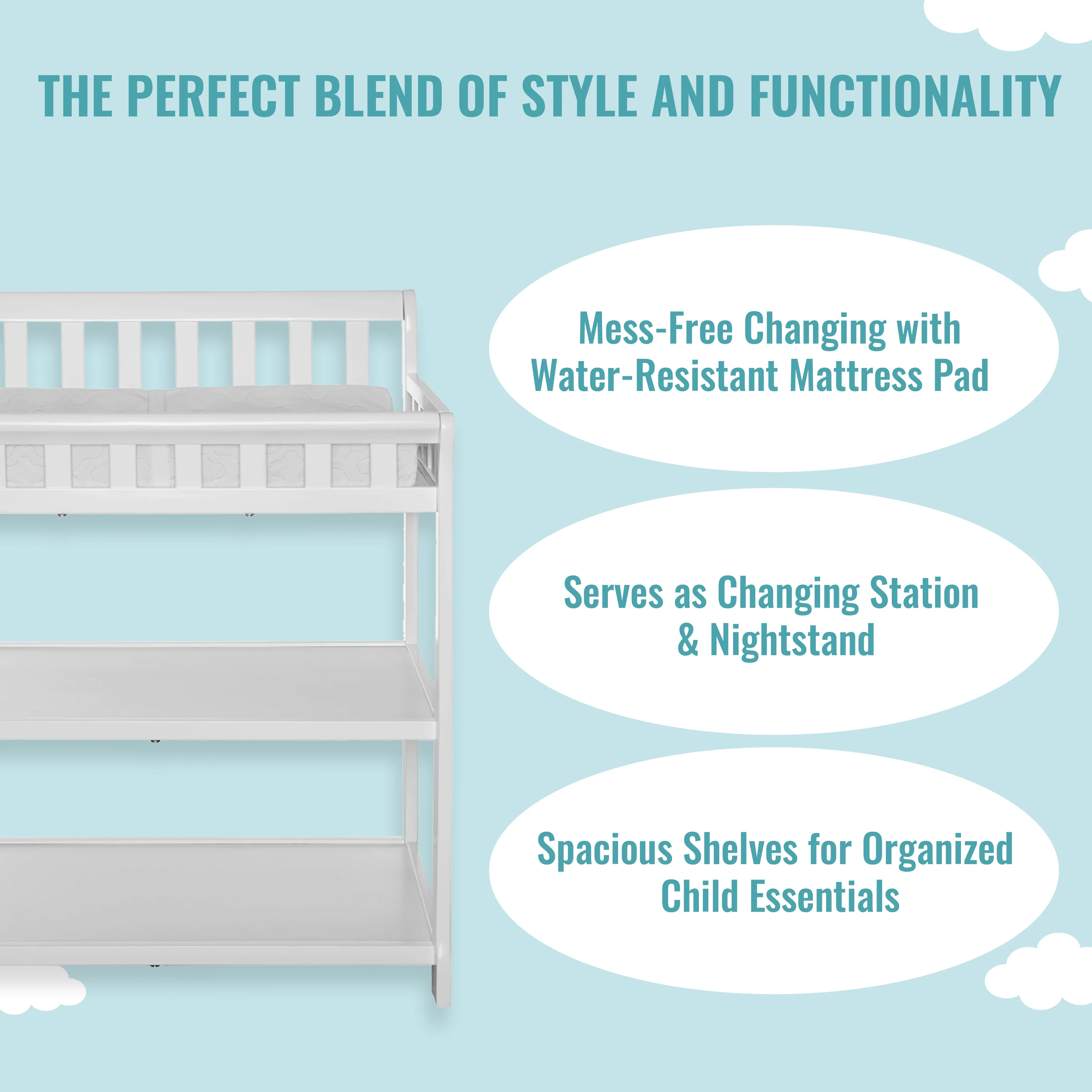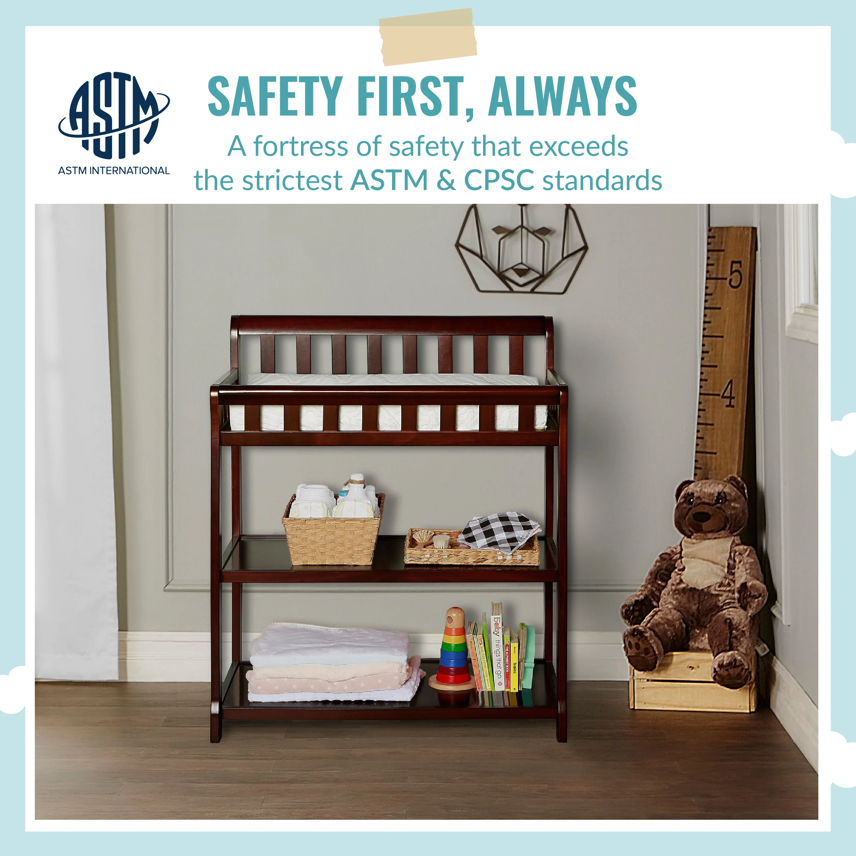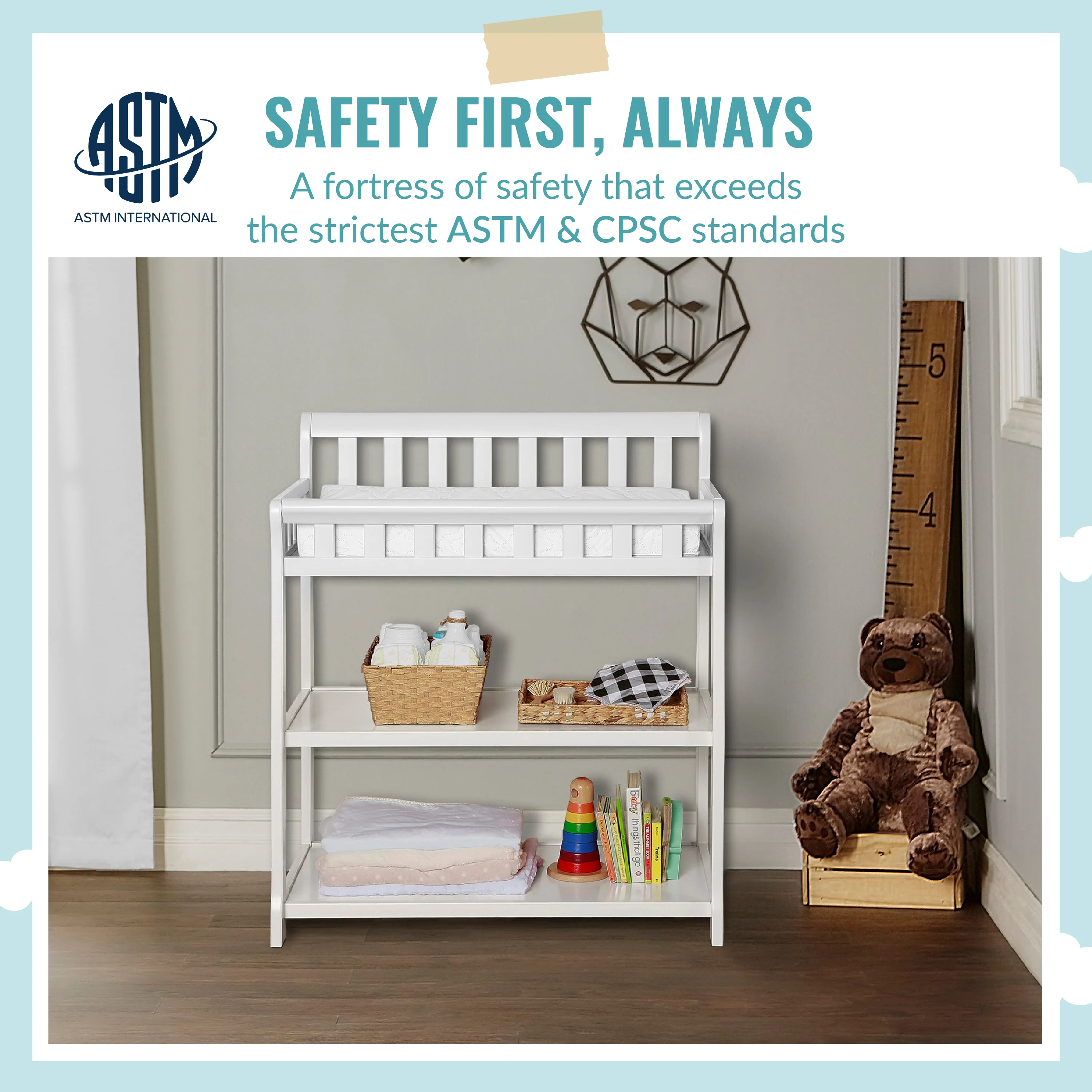 • FUNCTIONAL & SECURE: Don’t worry about a mess during changing time as it comes with a water-resistant mattress pad. With safety rails on four sides the changing table is a fully enclosed & secure space; there’s also a safety strap for keeping baby secure. Also, 1 inch mattress pad is included.