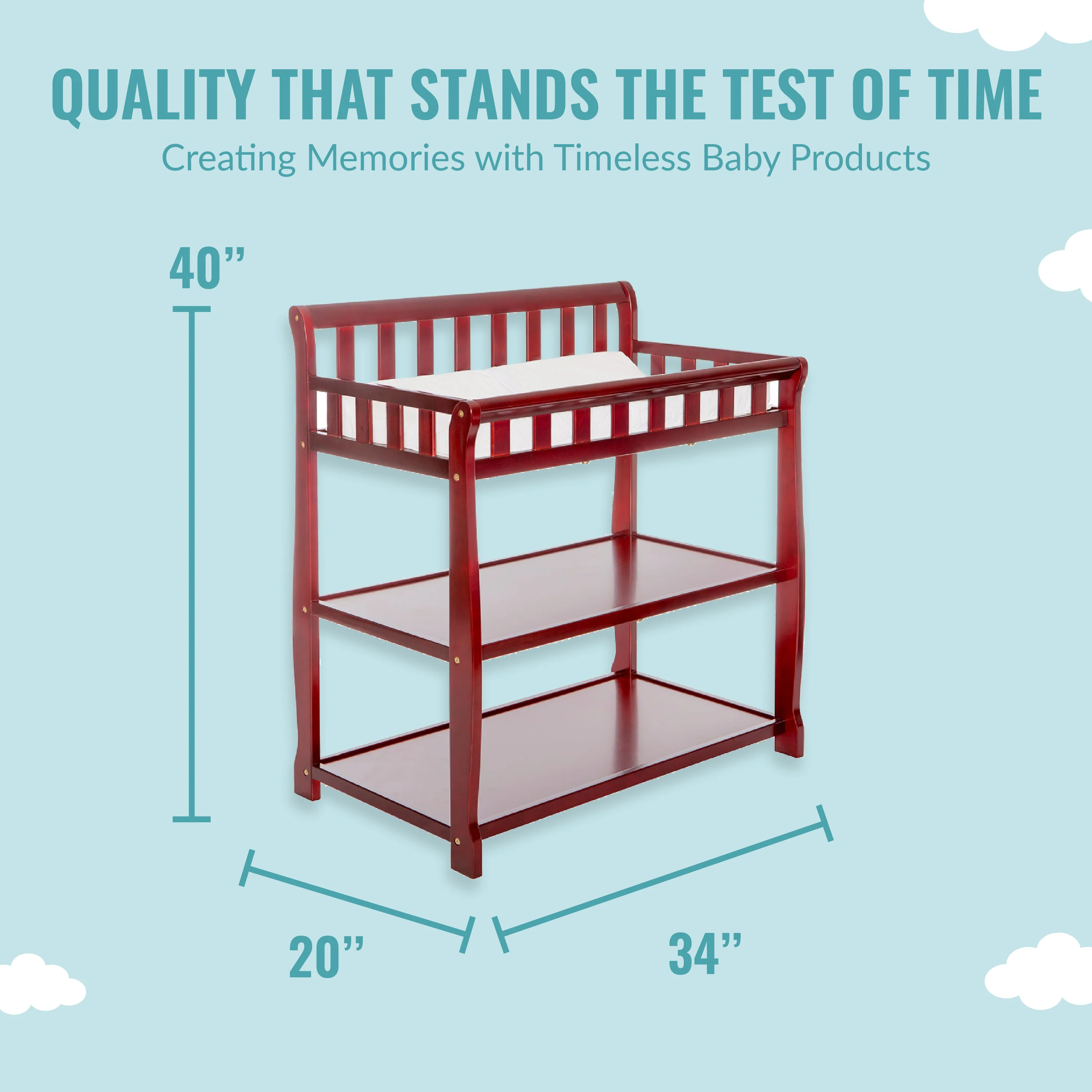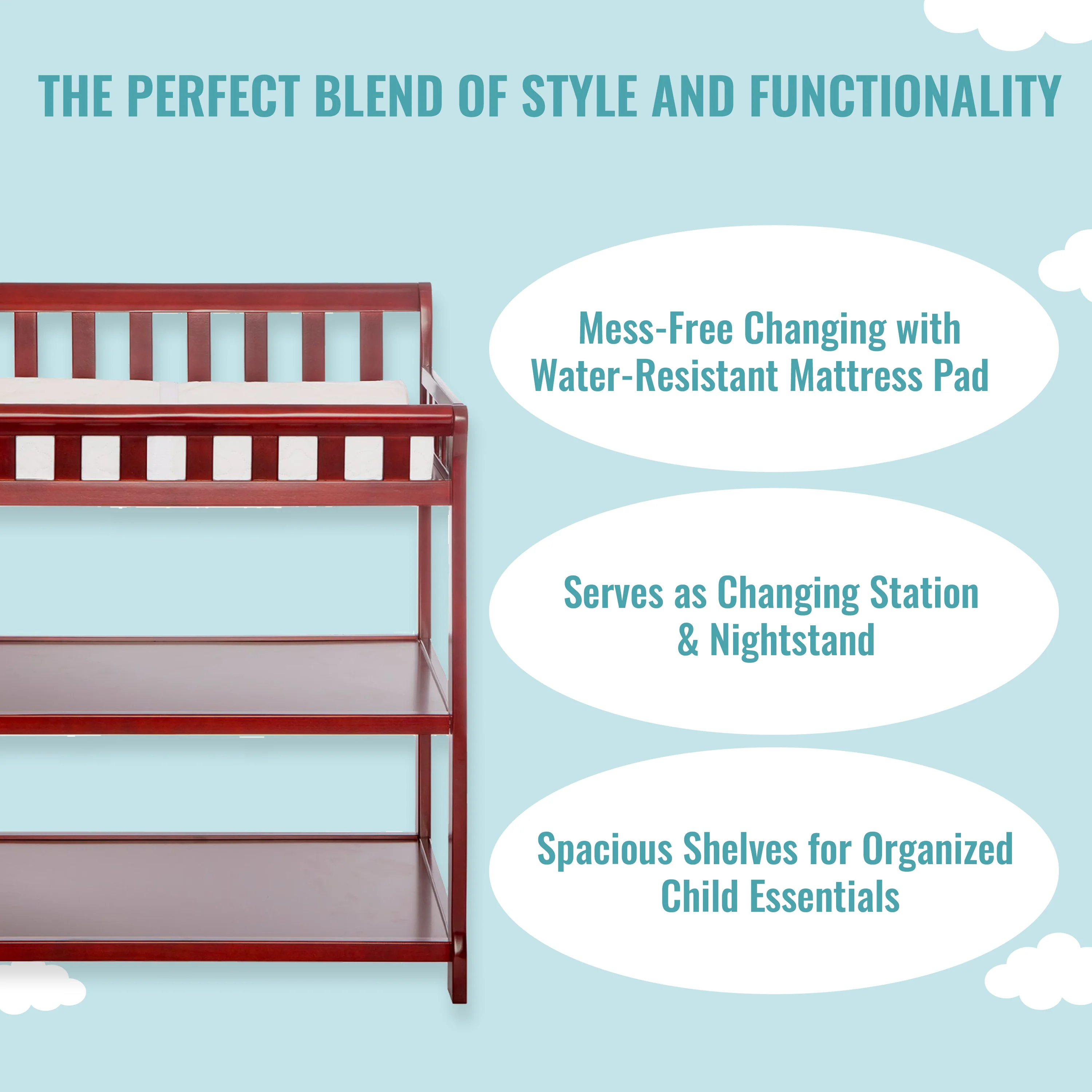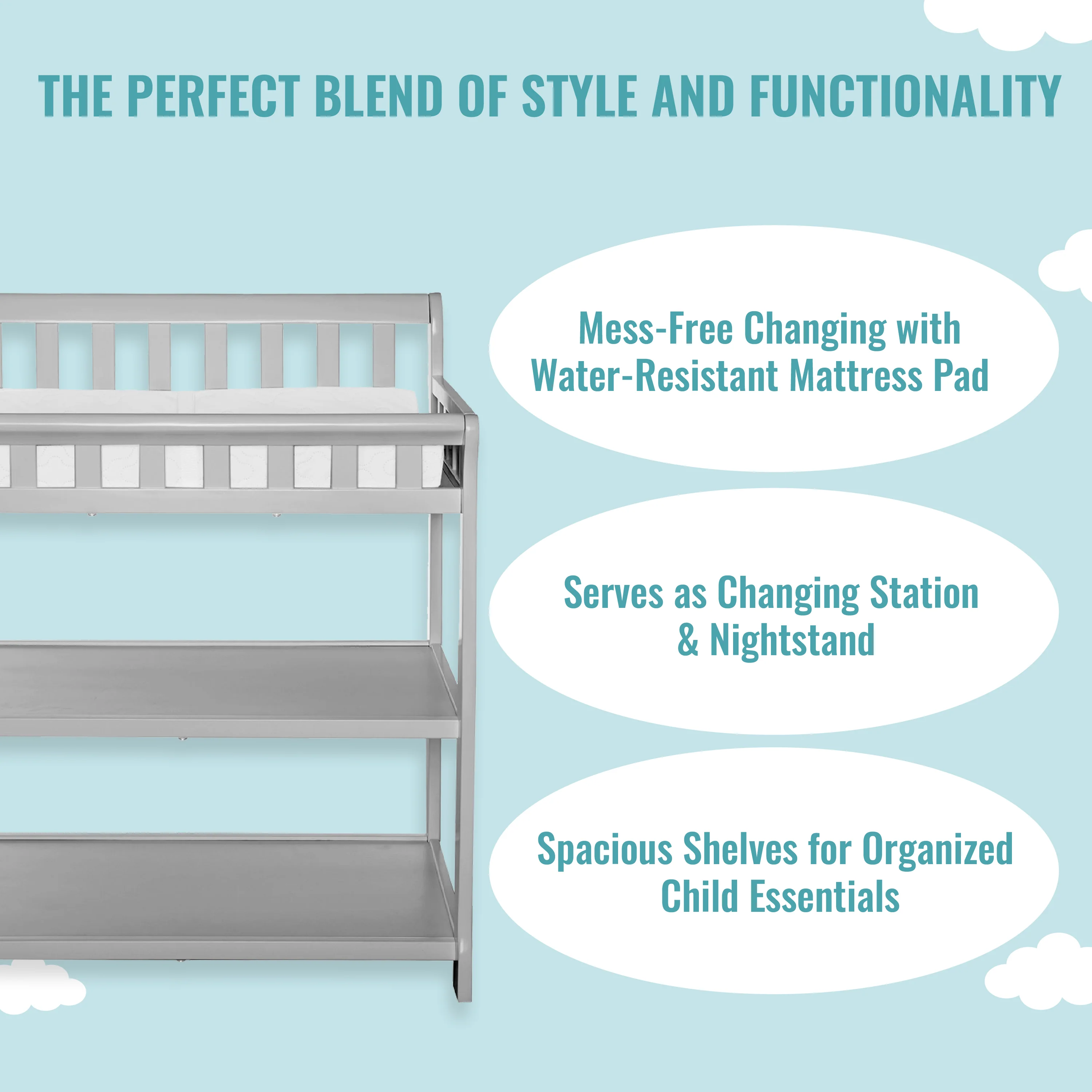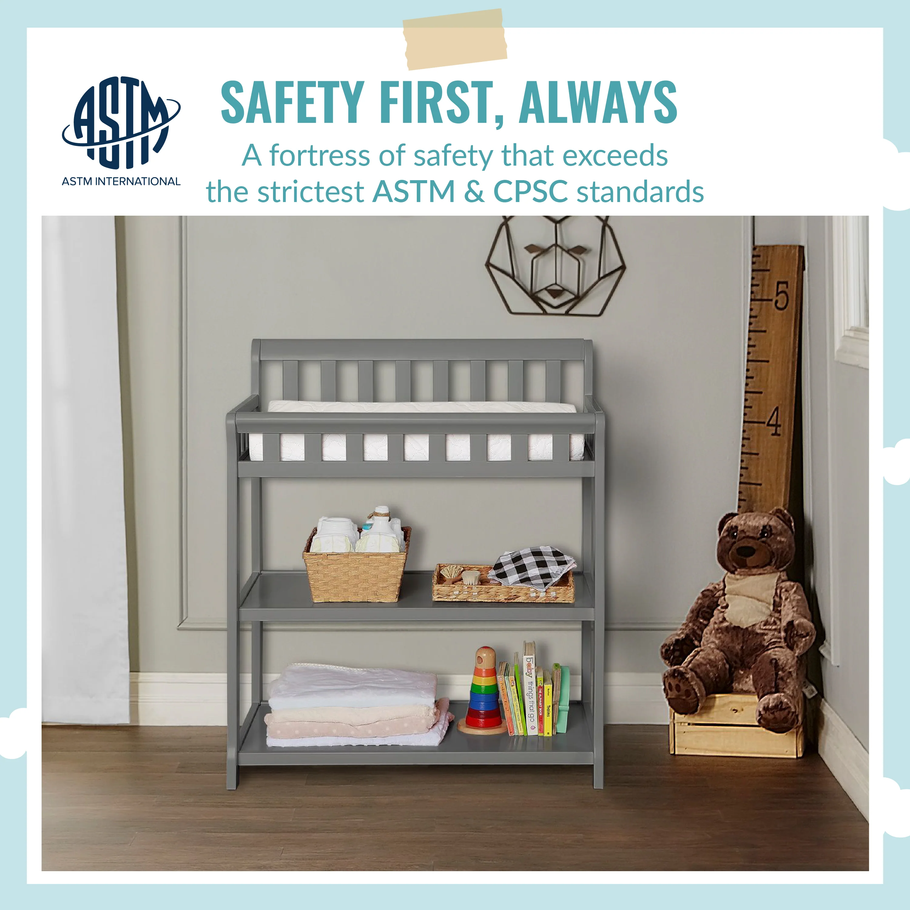 • FUNCTIONAL & SECURE: Don’t worry about a mess during changing time as it comes with a water-resistant mattress pad. With safety rails on four sides the changing table is a fully enclosed & secure space; there’s also a safety strap for keeping baby secure. Also, 1 inch mattress pad is included.