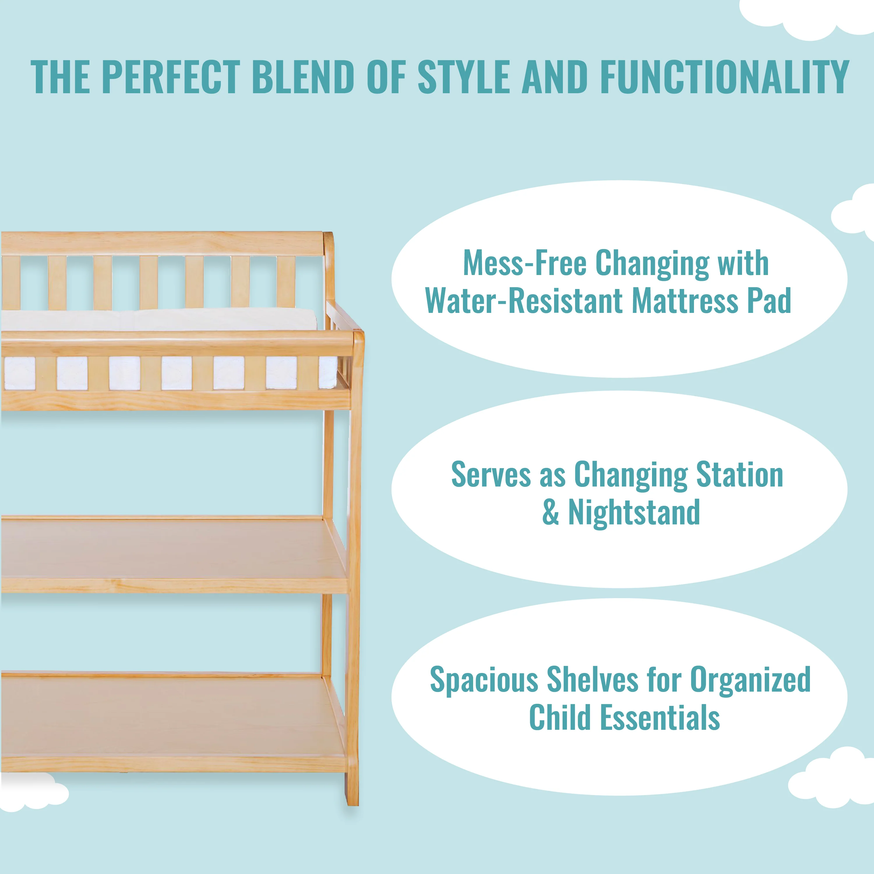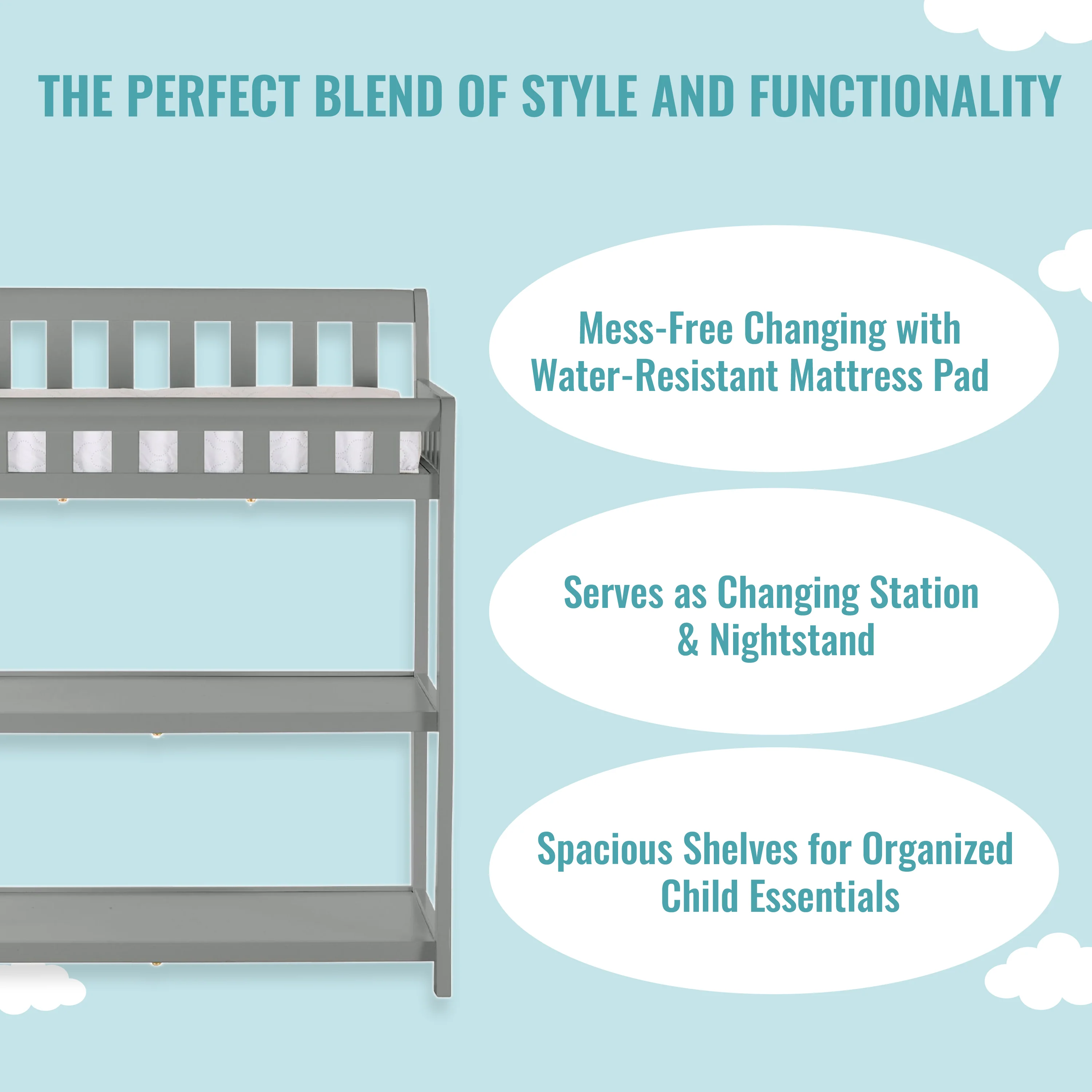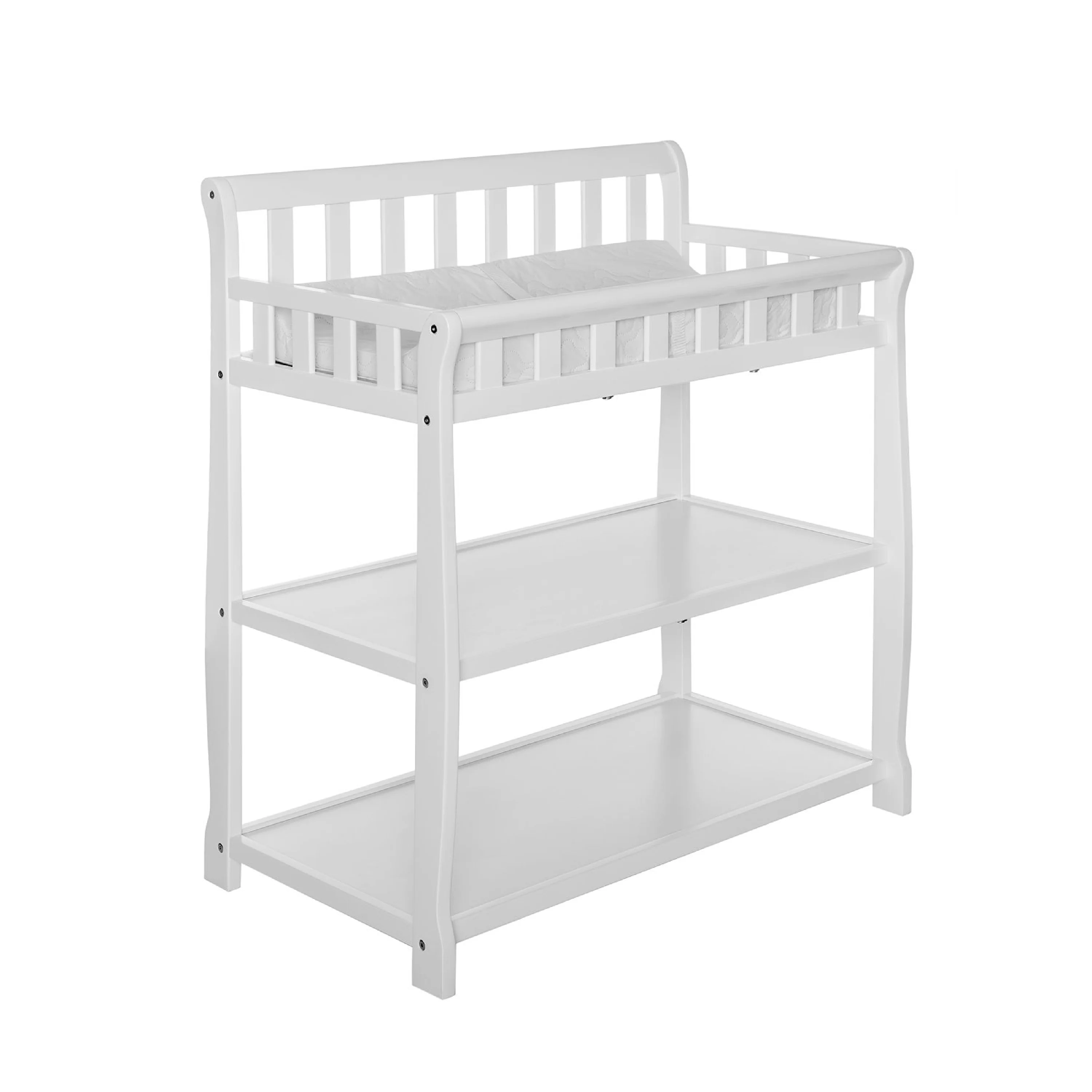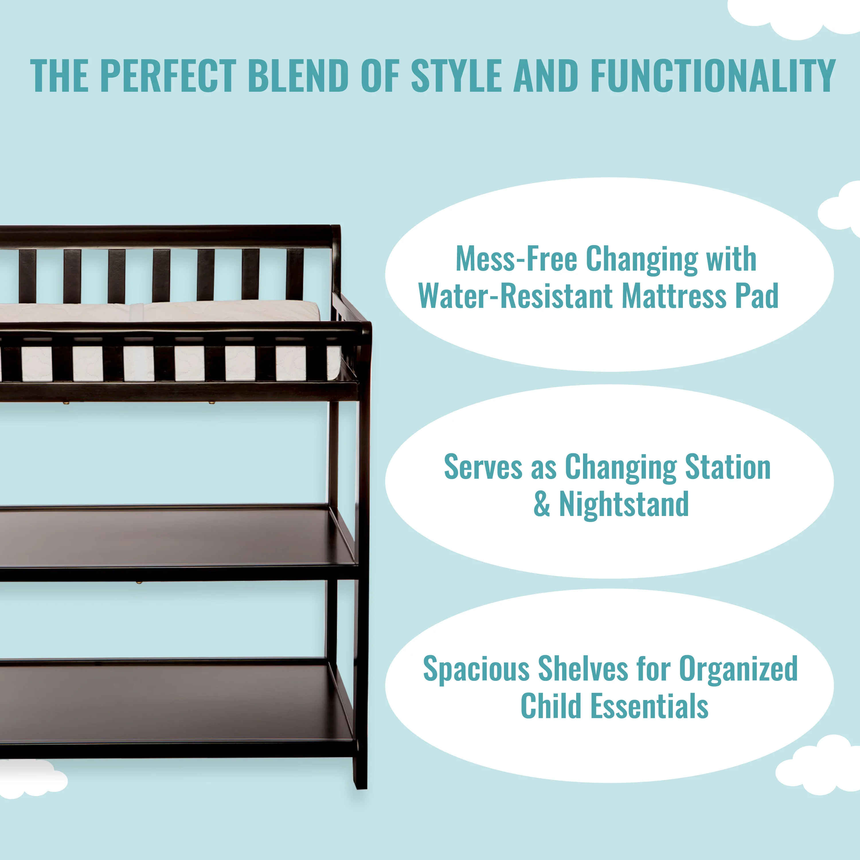 - FUNCTIONAL & SECURE: Don’t worry about a mess during changing time as it comes with a water-resistant mattress pad. With safety rails on four sides the changing table is a fully enclosed & secure space; there’s also a safety strap for keeping baby secure. Also, 1 inch mattress pad is included.
