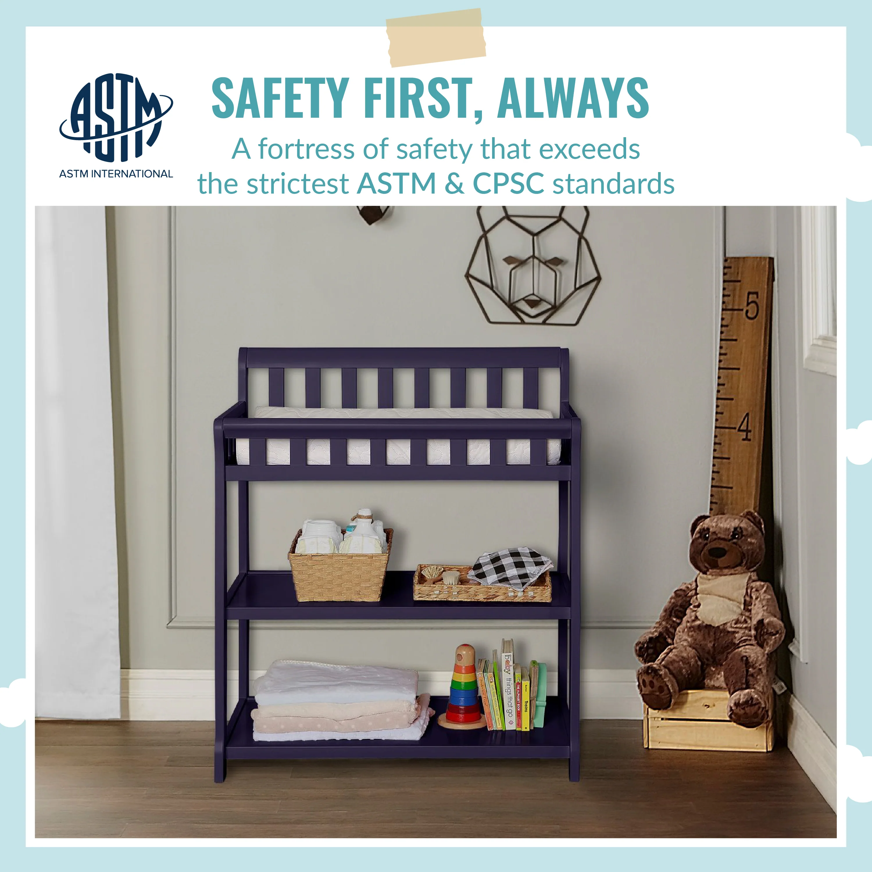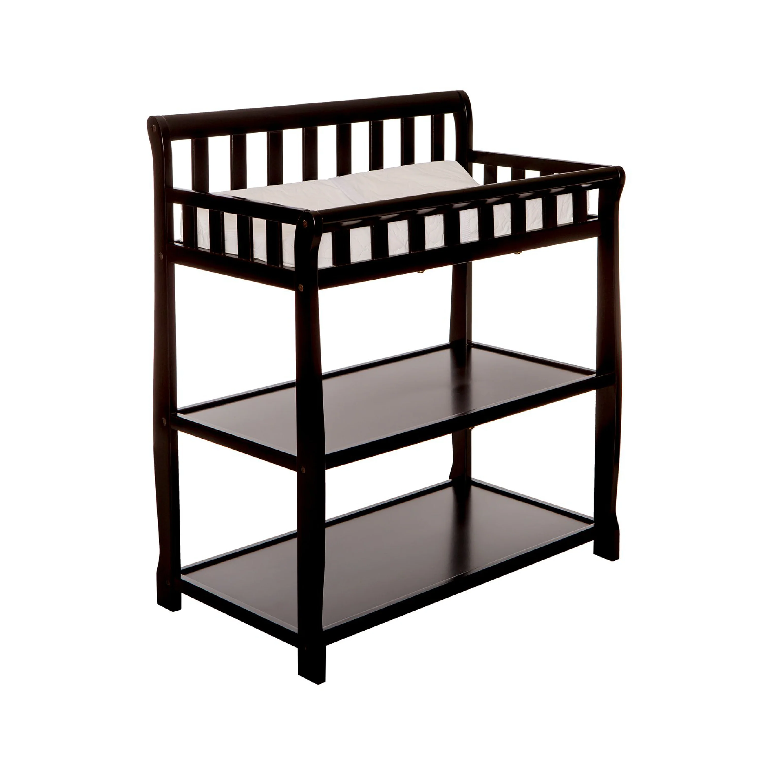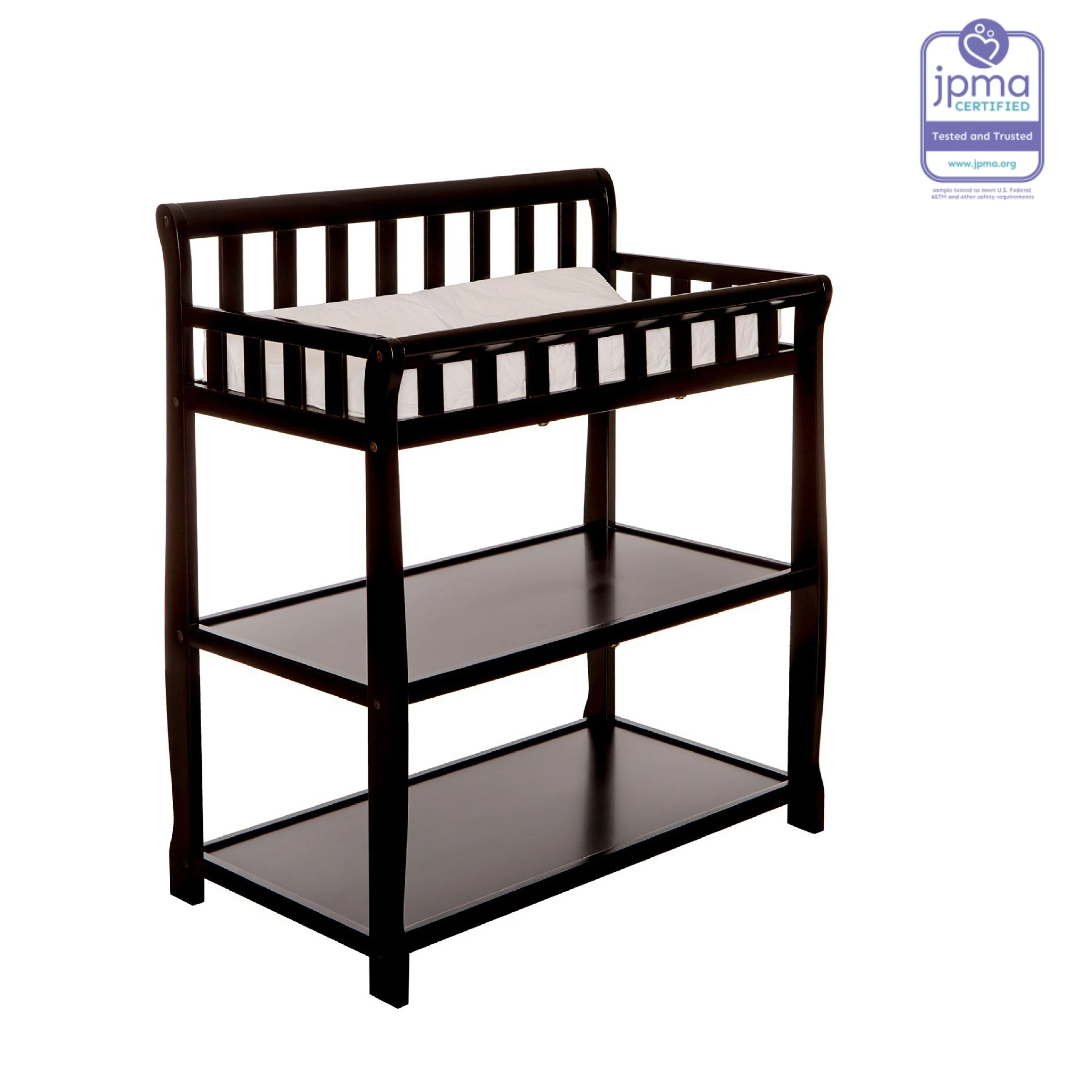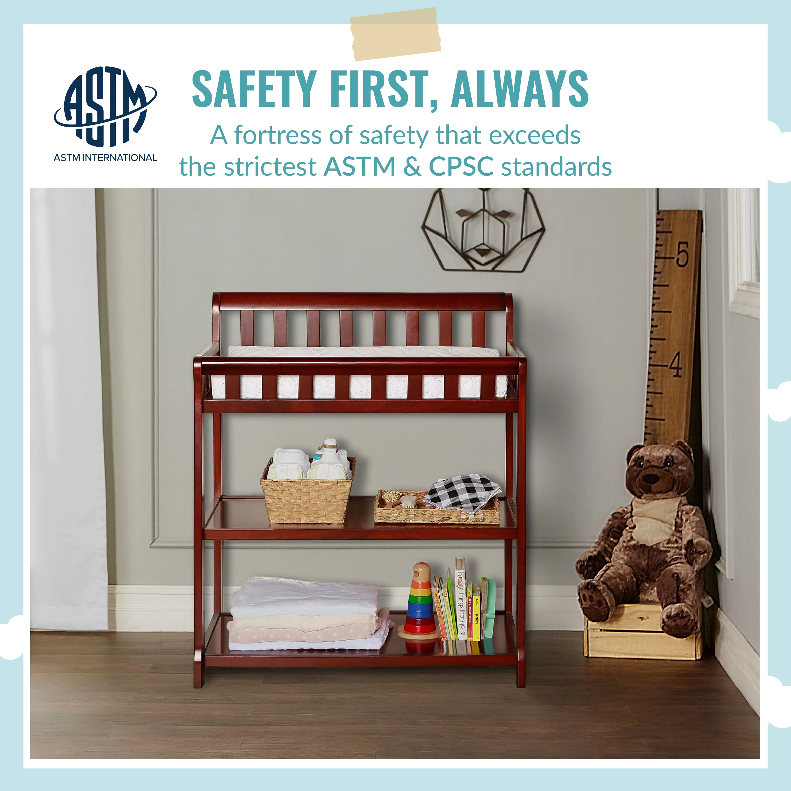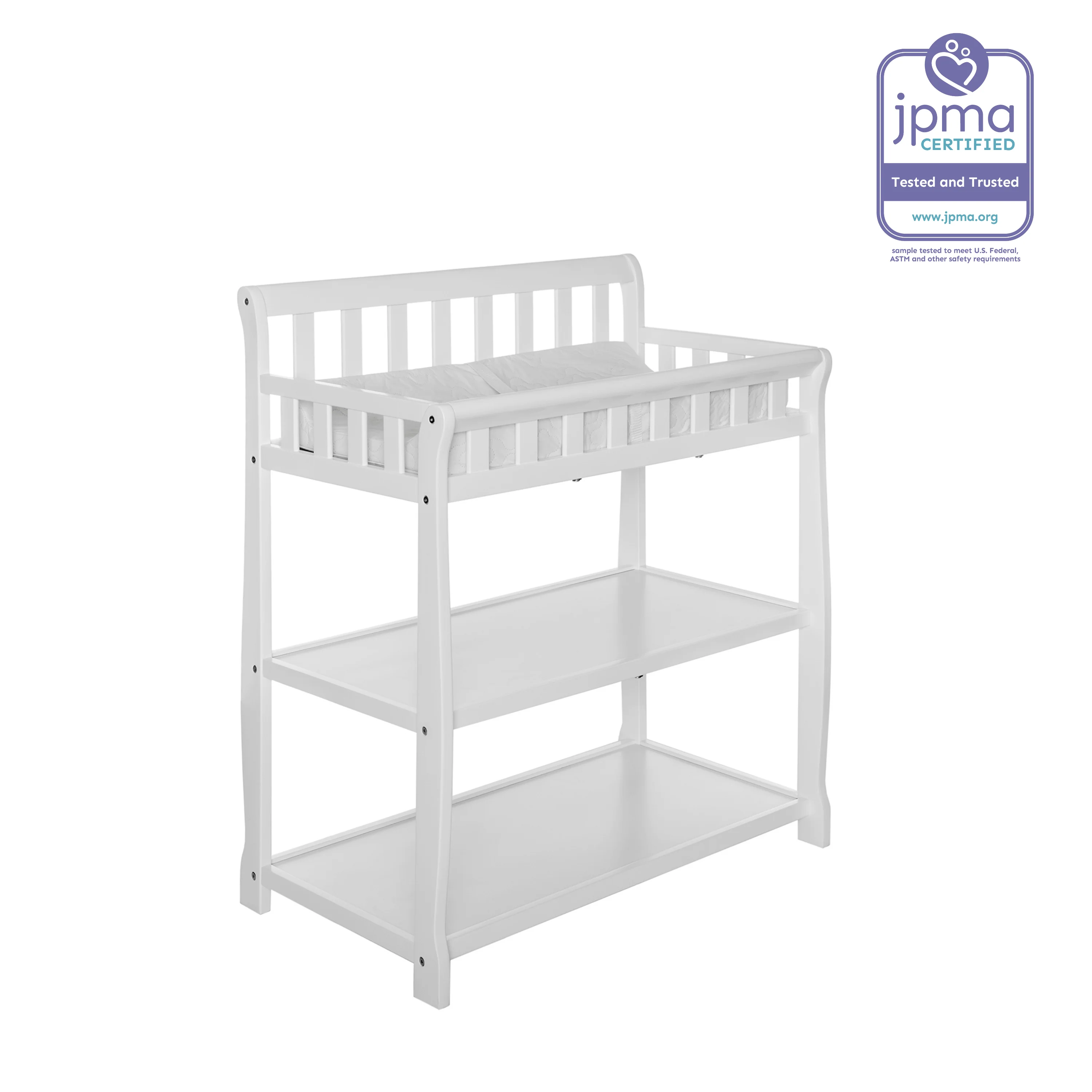 - FUNCTIONAL & SECURE: Don’t worry about a mess during changing time as it comes with a water-resistant mattress pad. With safety rails on four sides the changing table is a fully enclosed & secure space; there’s also a safety strap for keeping baby secure. Also, 1 inch mattress pad is included.