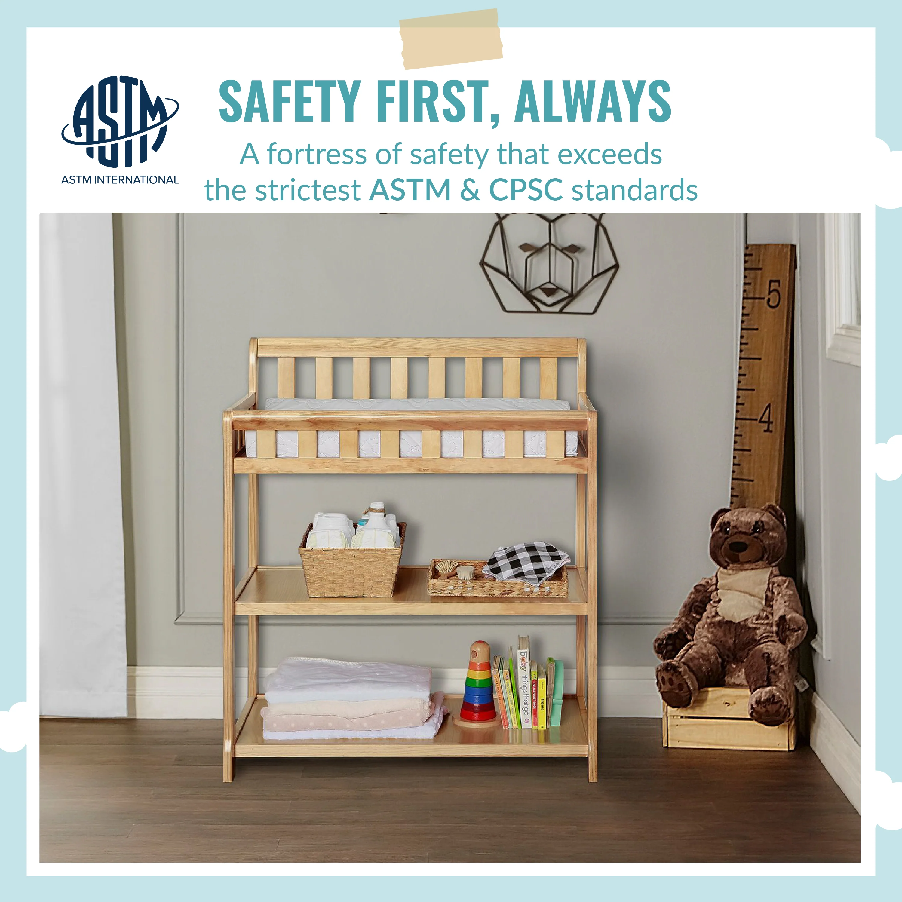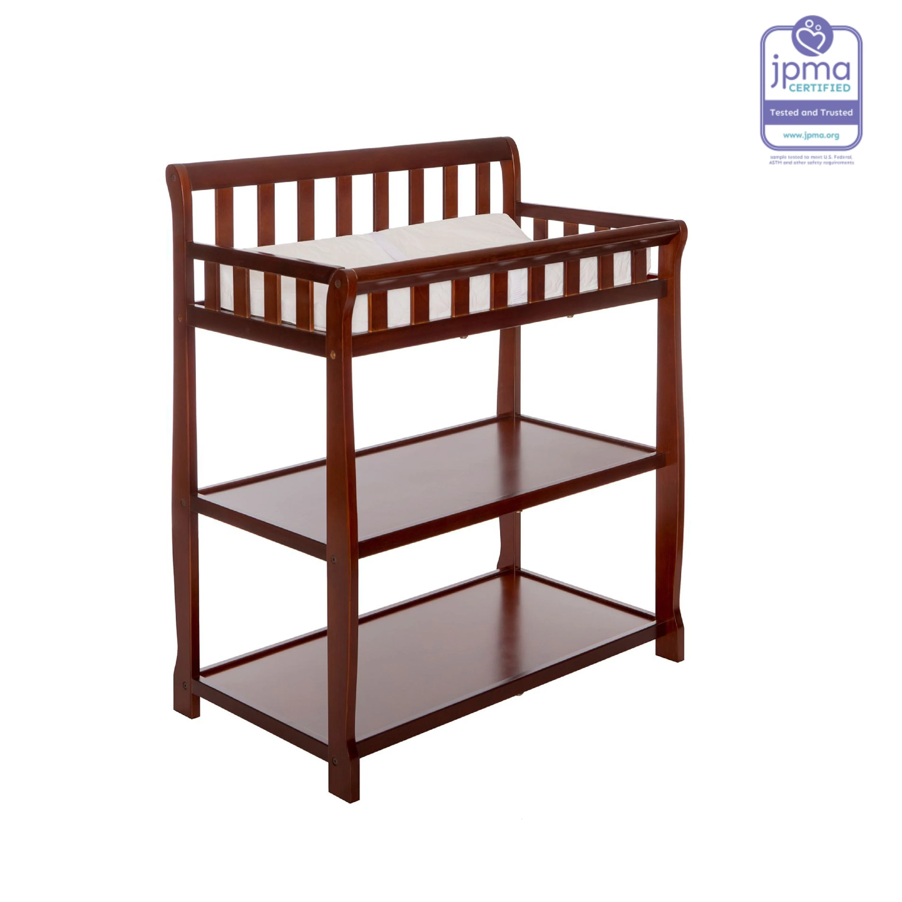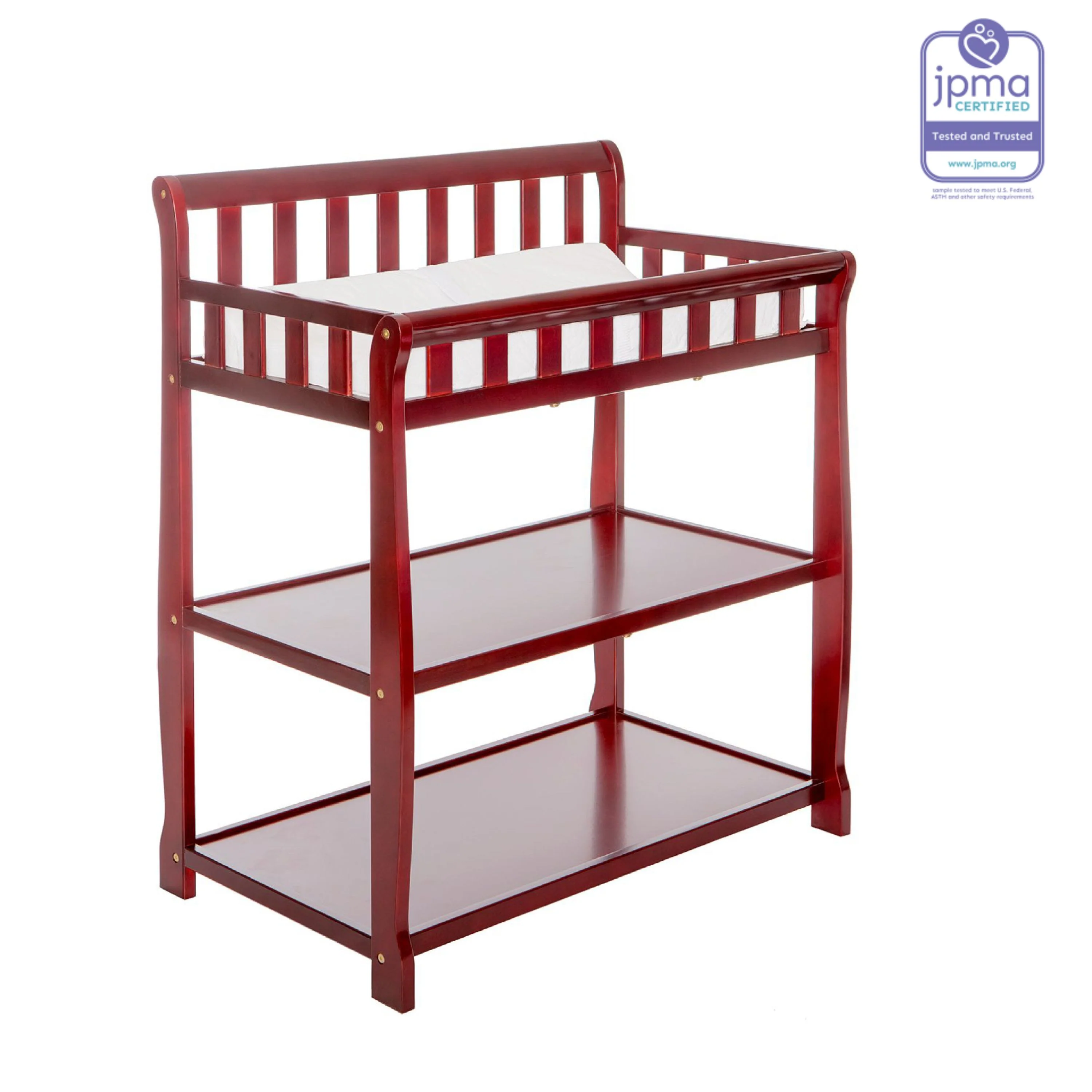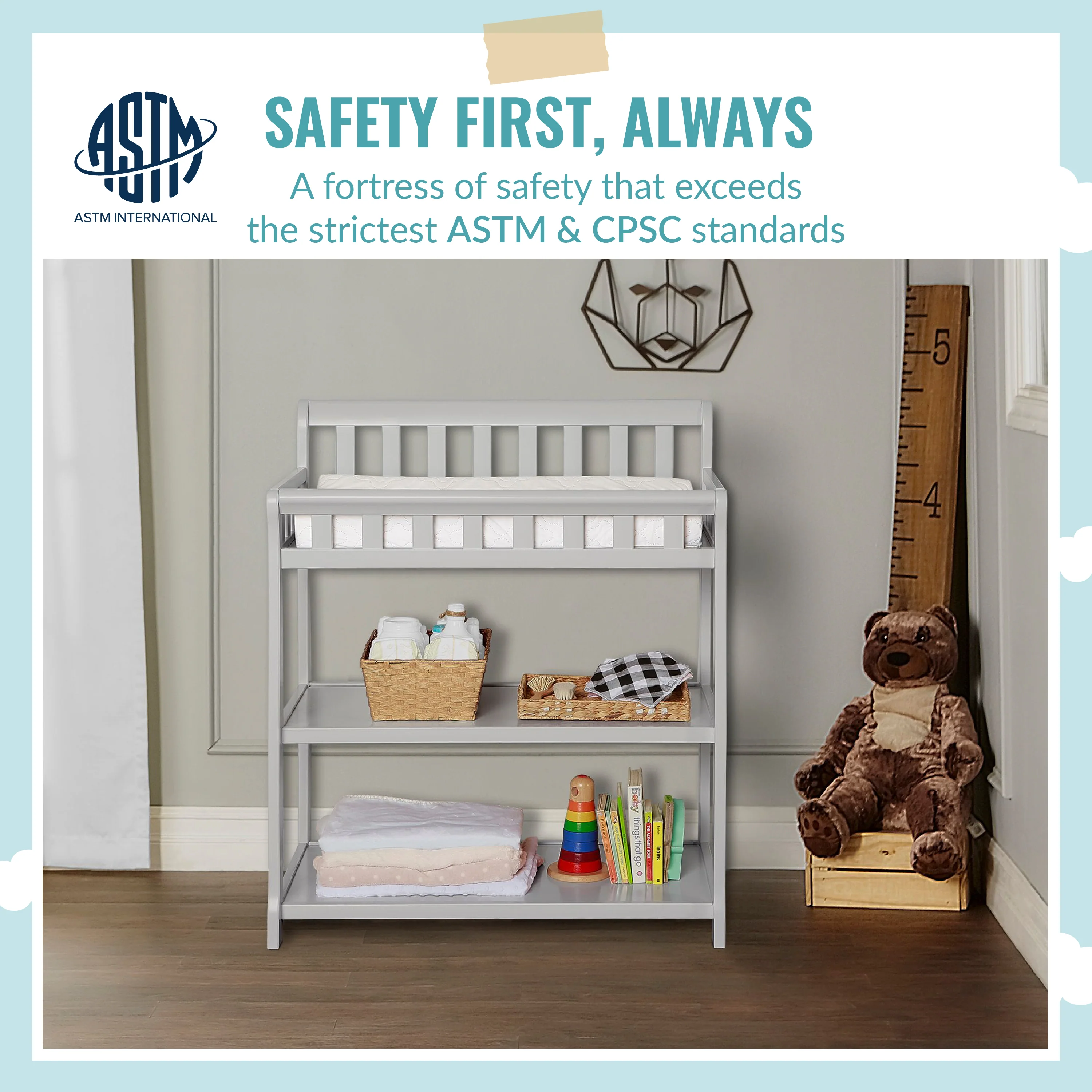- FUNCTIONAL & SECURE: Don’t worry about a mess during changing time as it comes with a water-resistant mattress pad. With safety rails on four sides the changing table is a fully enclosed & secure space; there’s also a safety strap for keeping baby secure. Also, 1 inch mattress pad is included.