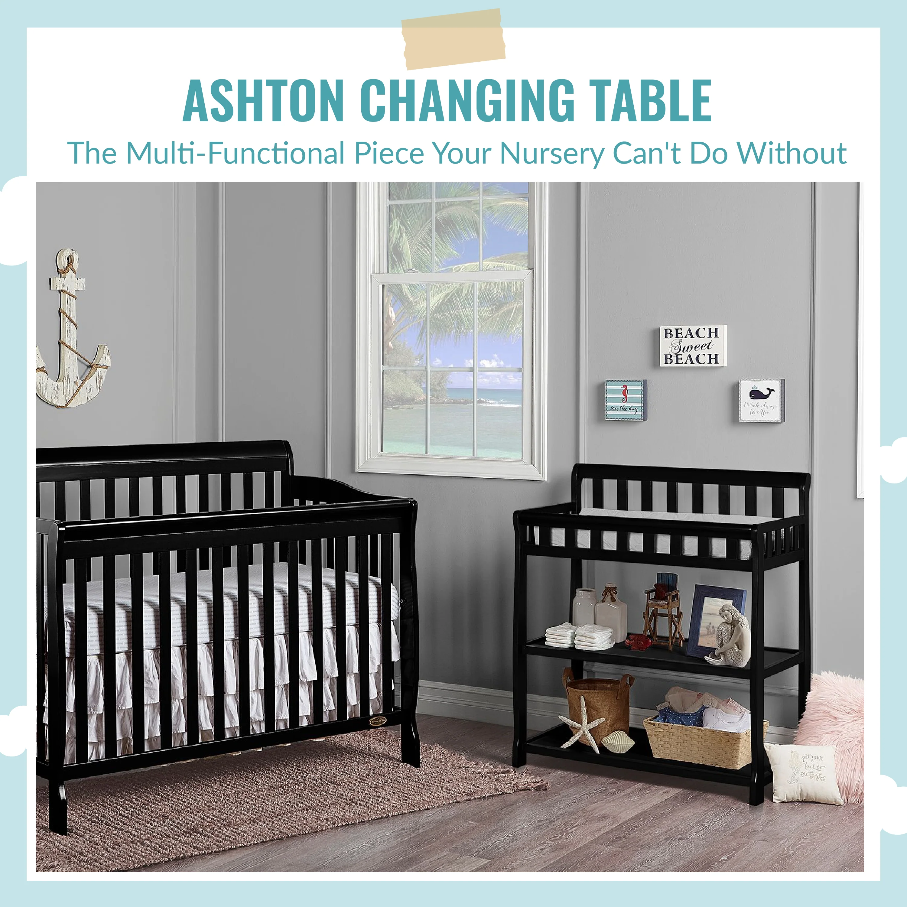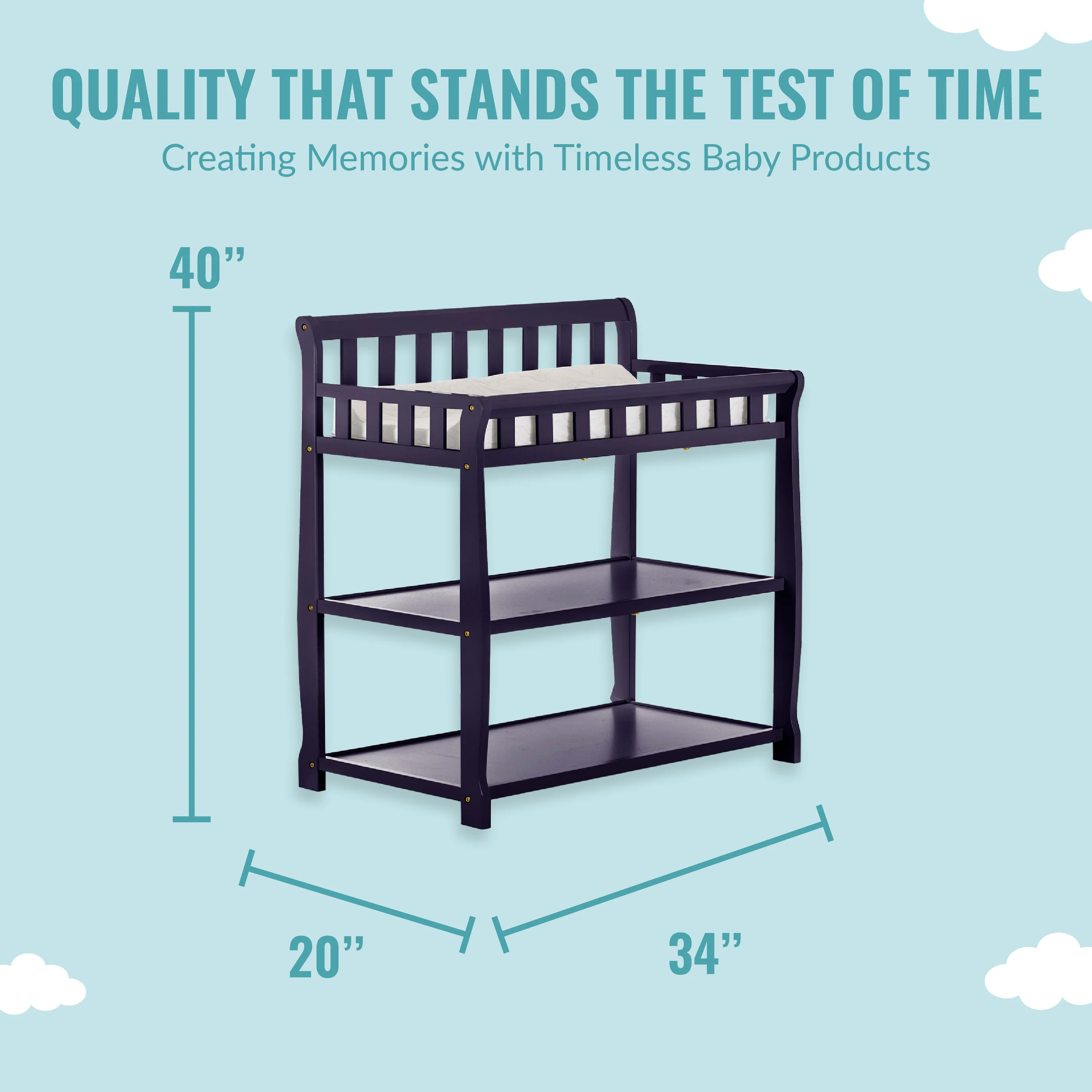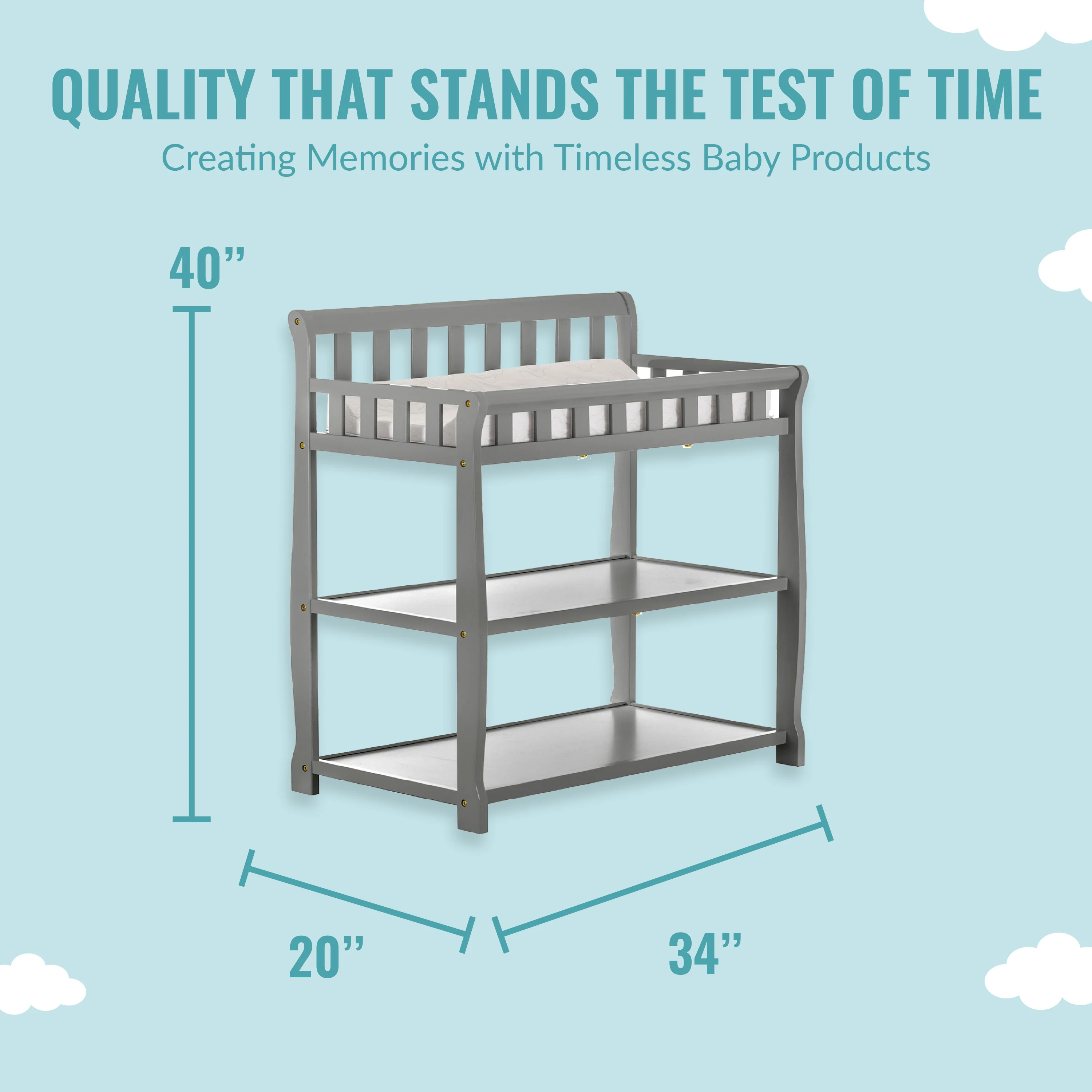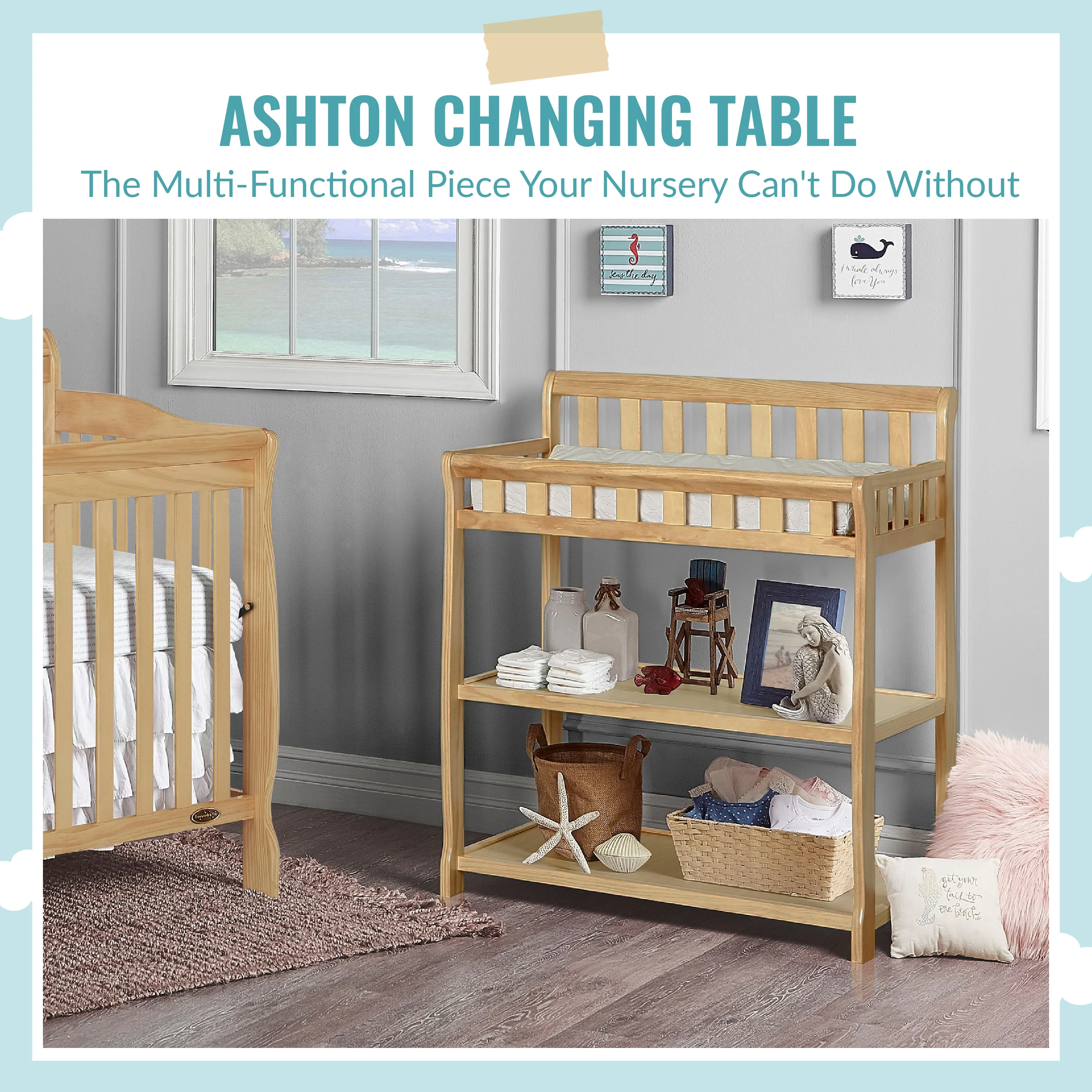 - GREAT STORAGE: The Ashton comes with two easy-to-reach, spacious shelves below the changing table - keep your child’s essentials neatly organized and within easy reach! Product dimensions are 34L x 20W x 40H inches.