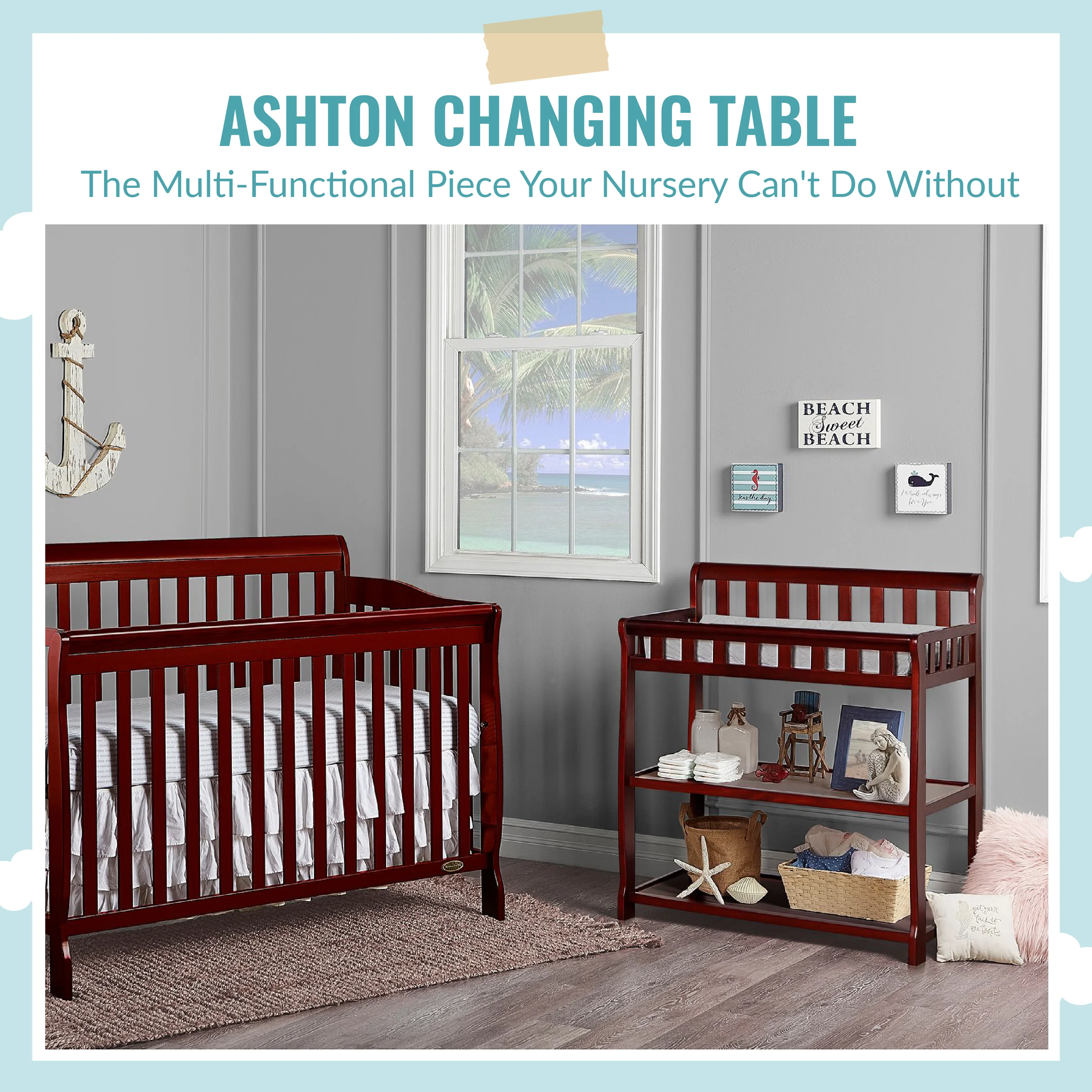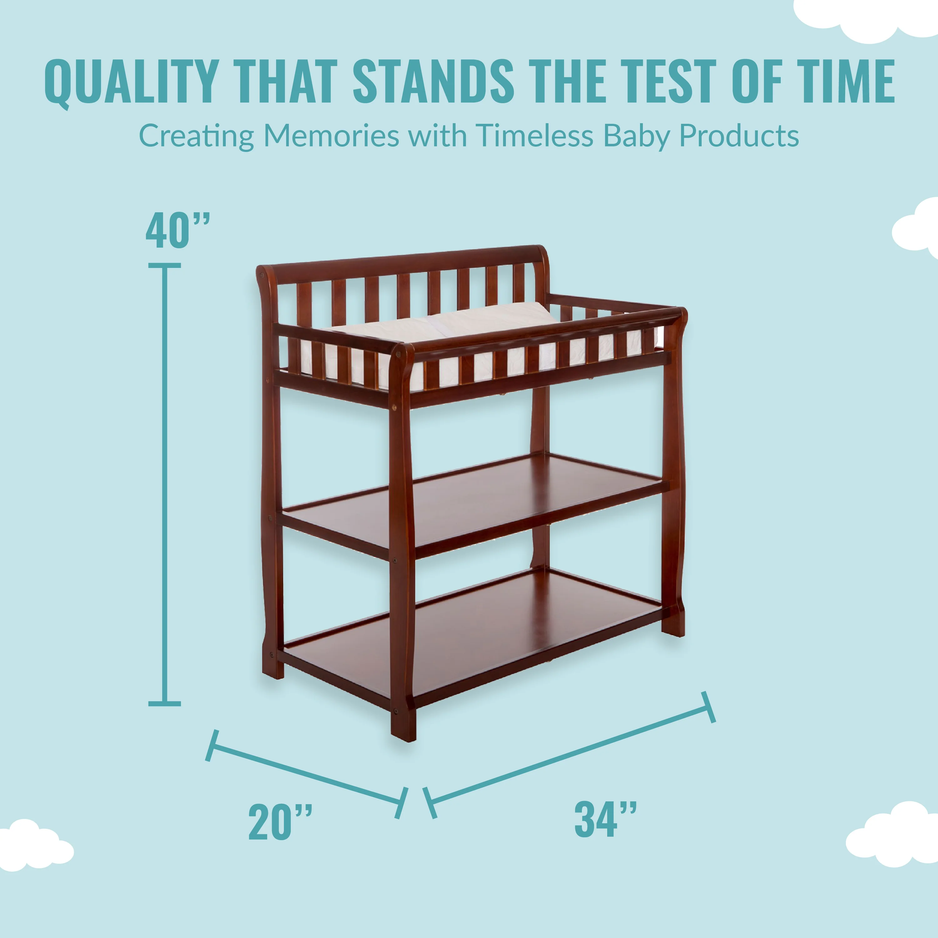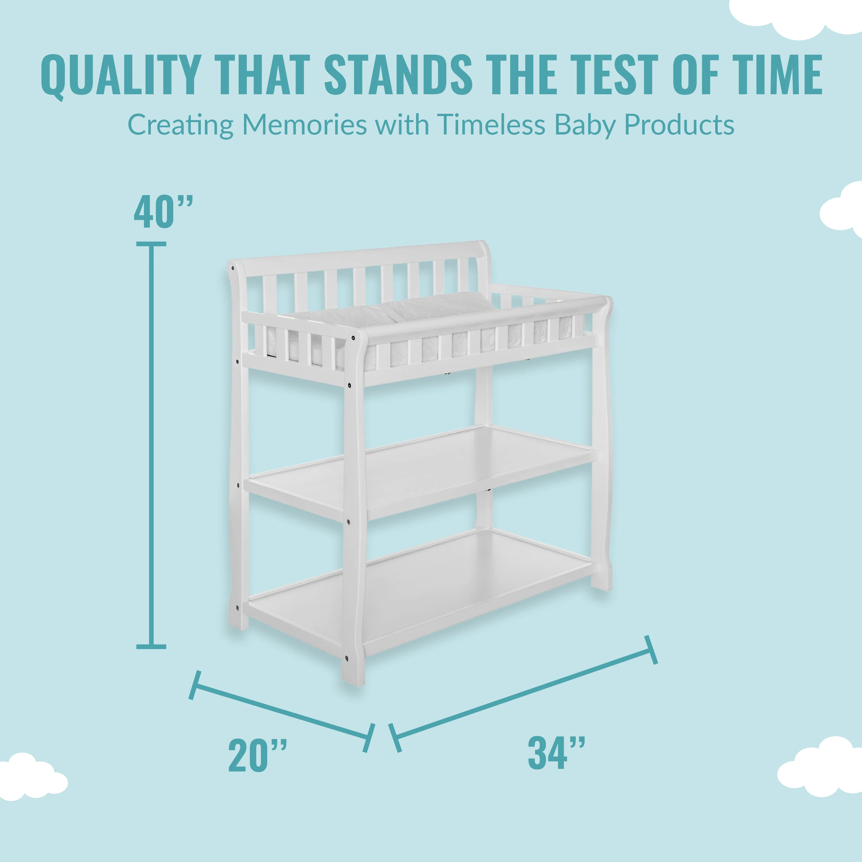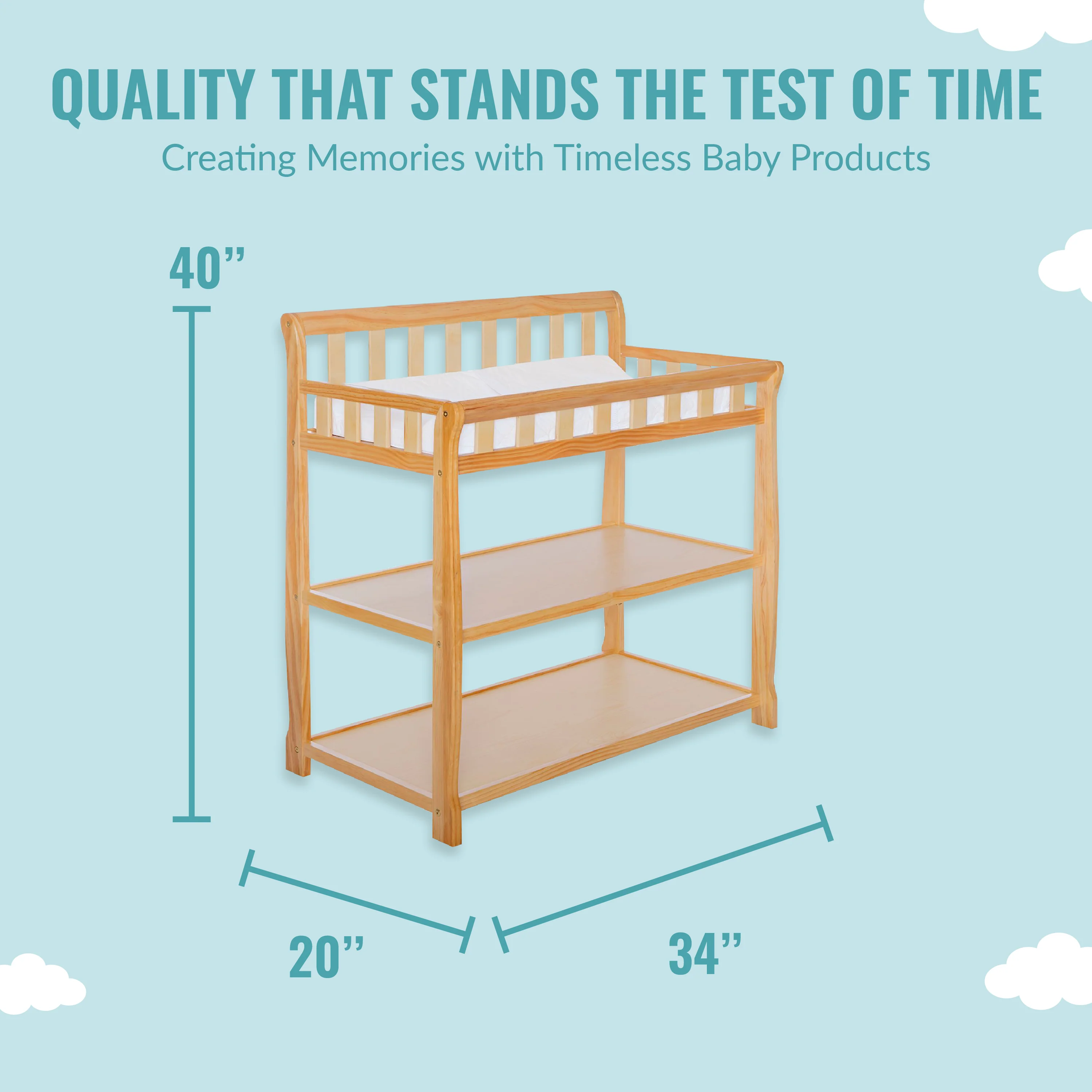 - GREAT STORAGE: The Ashton comes with two easy-to-reach, spacious shelves below the changing table - keep your child’s essentials neatly organized and within easy reach! Product dimensions are 34L x 20W x 40H inches.
