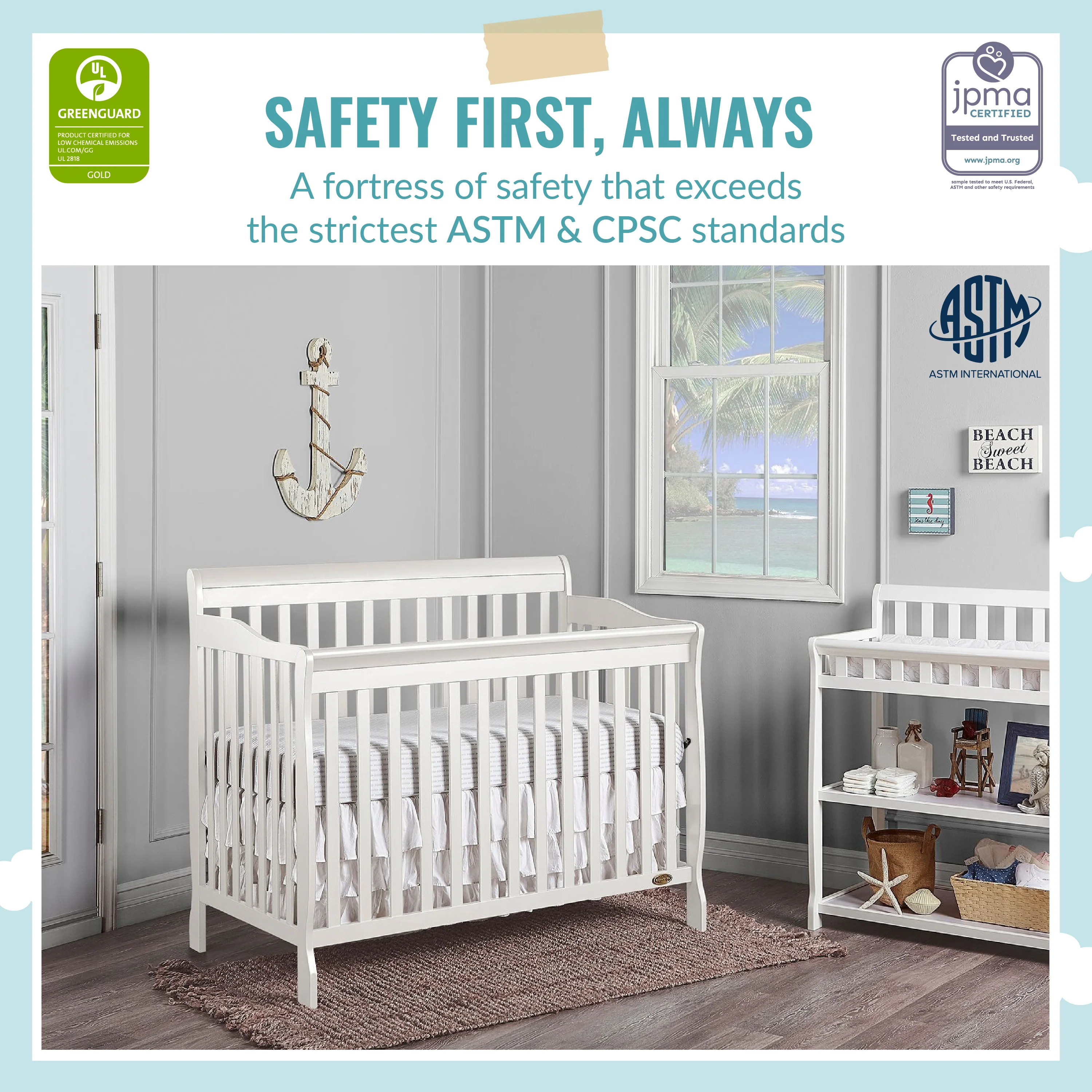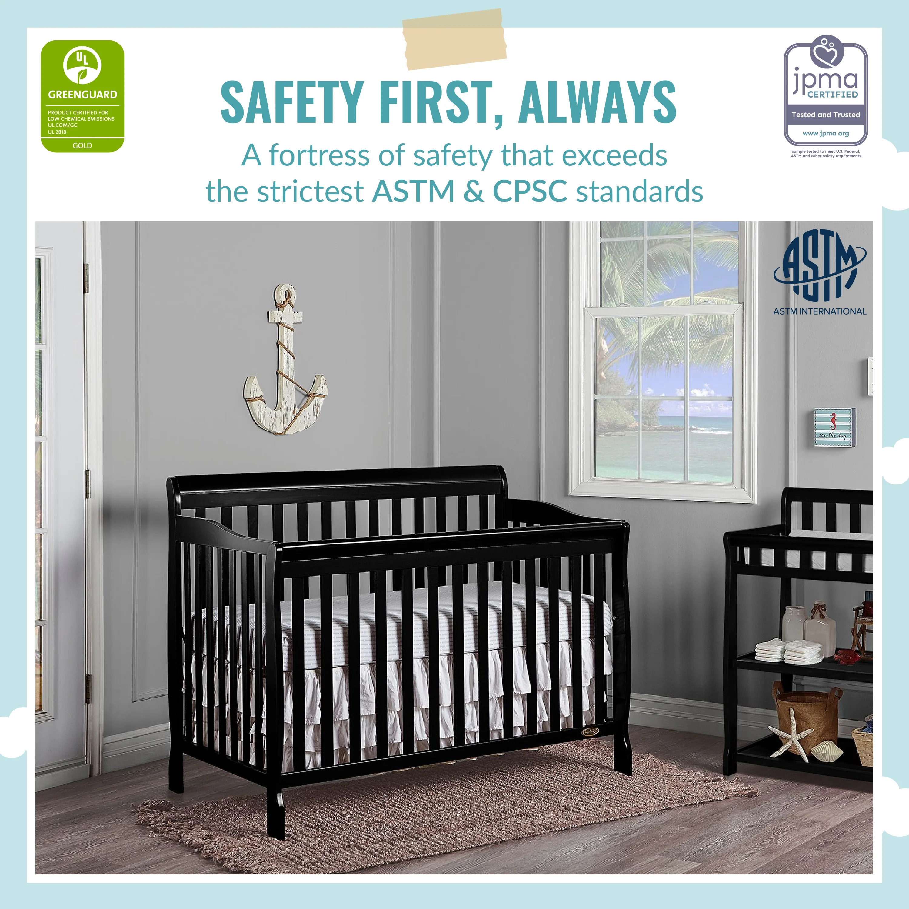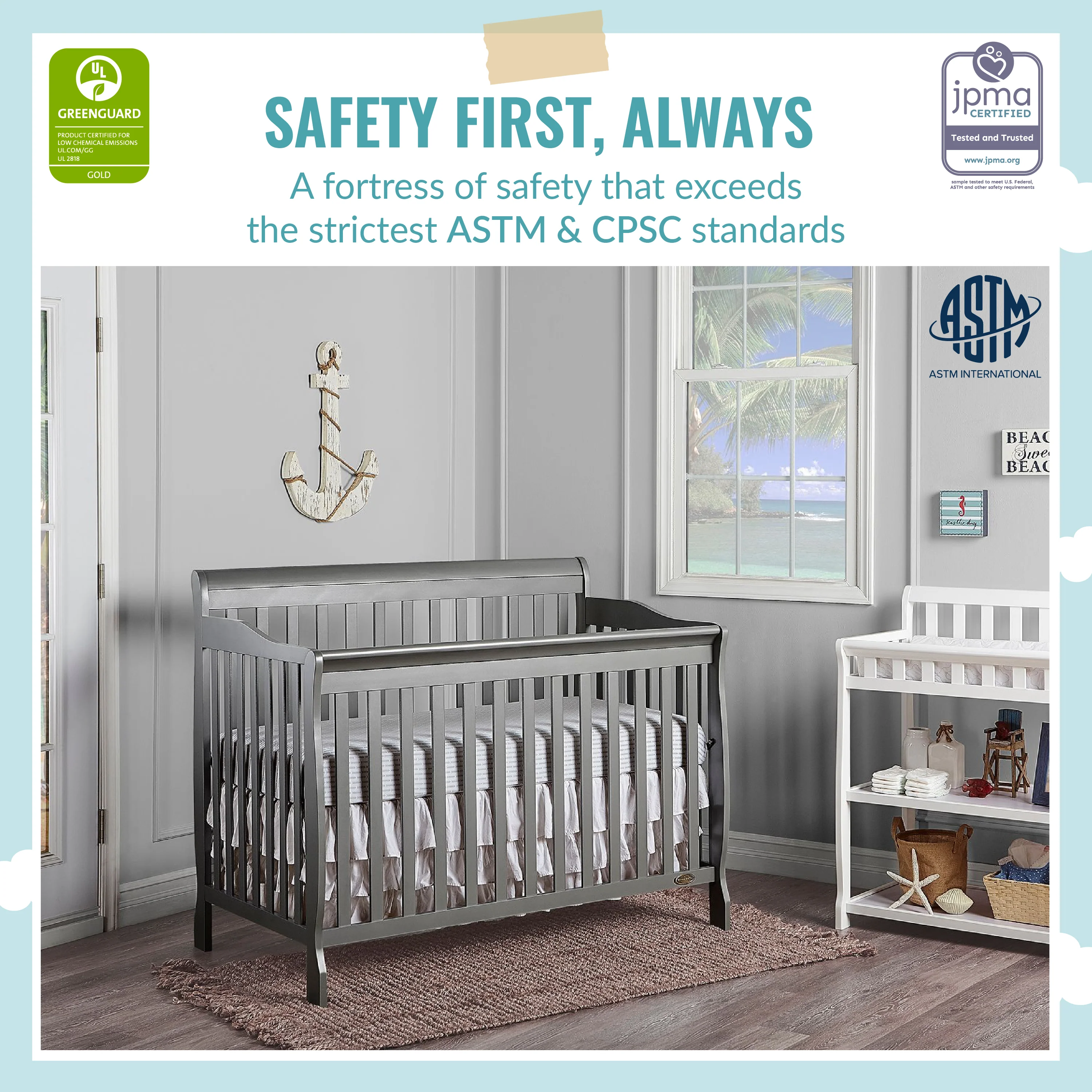 - SAFETY FIRST - ALWAYS: This crib is JPMA Certified to meet or exceed all safety standards set by the CPSC & ASTM. All of our products are tested by 3rd party labs for lead and other toxic elements to meet or exceed CPSC and ASTM safety standards